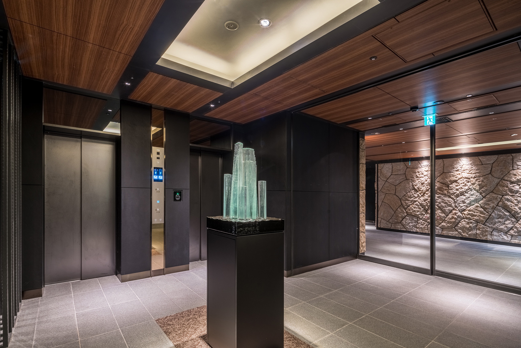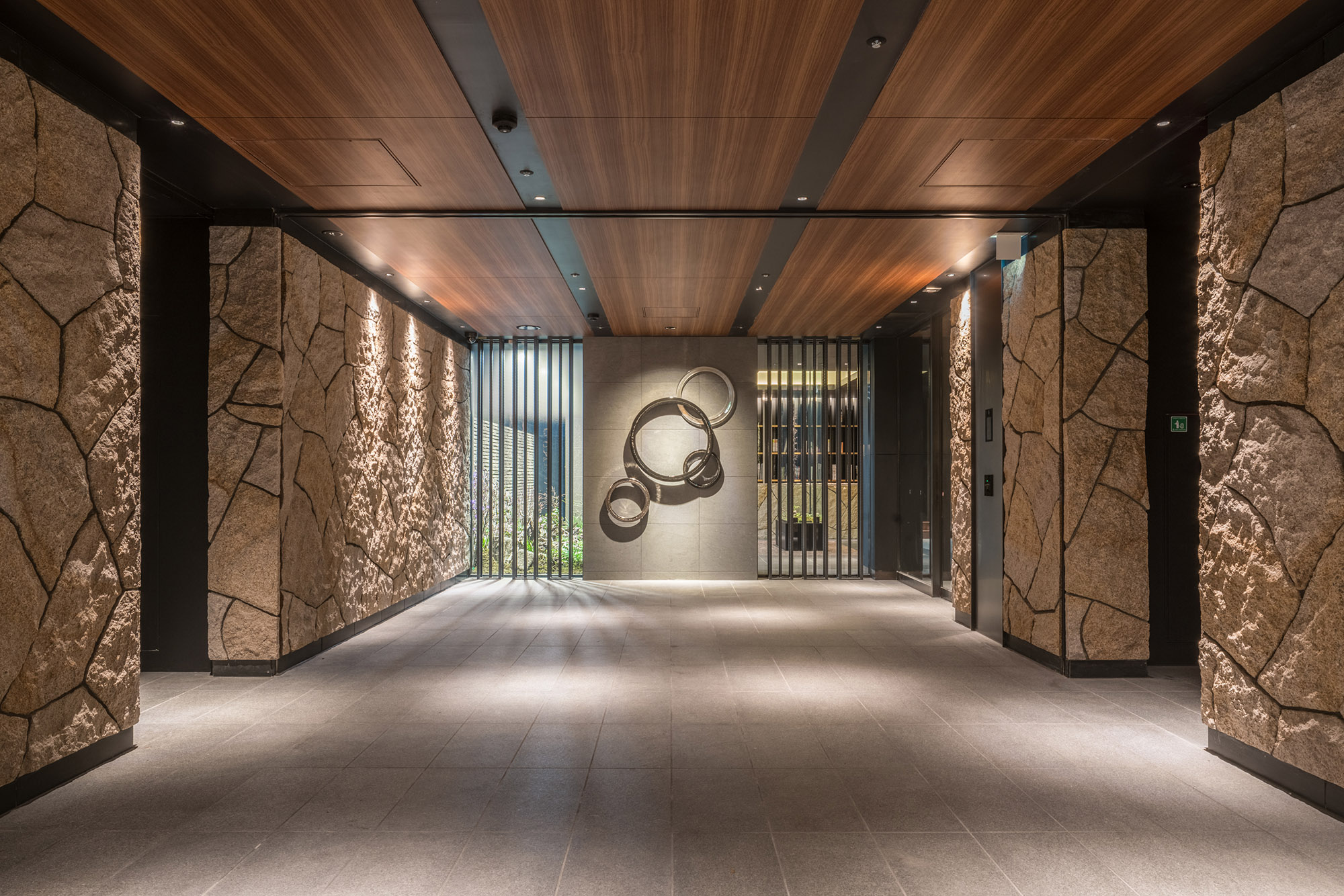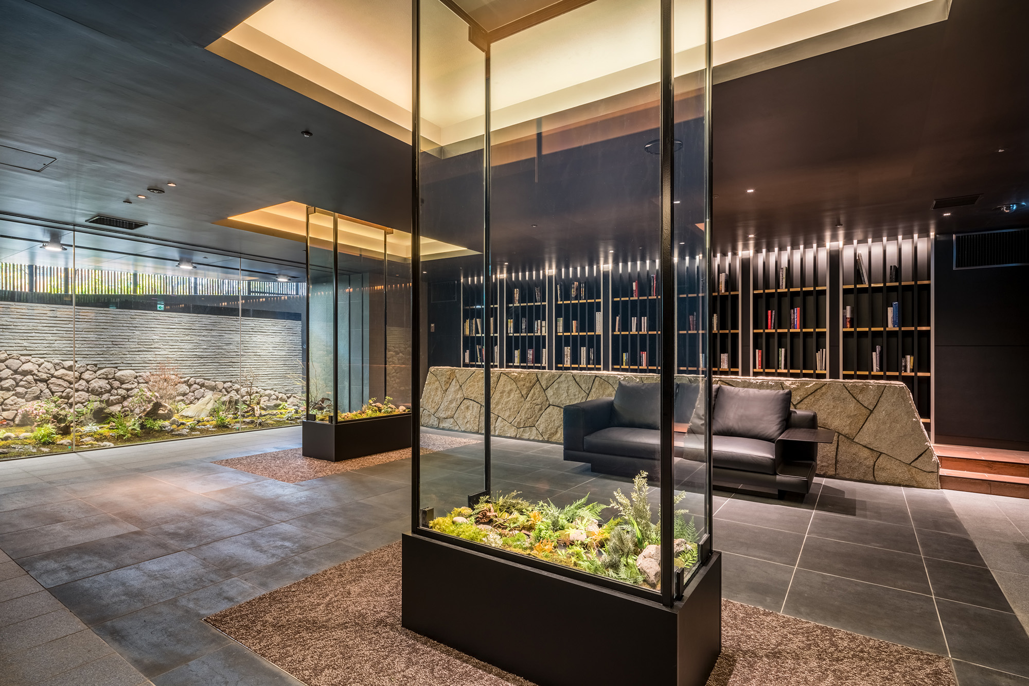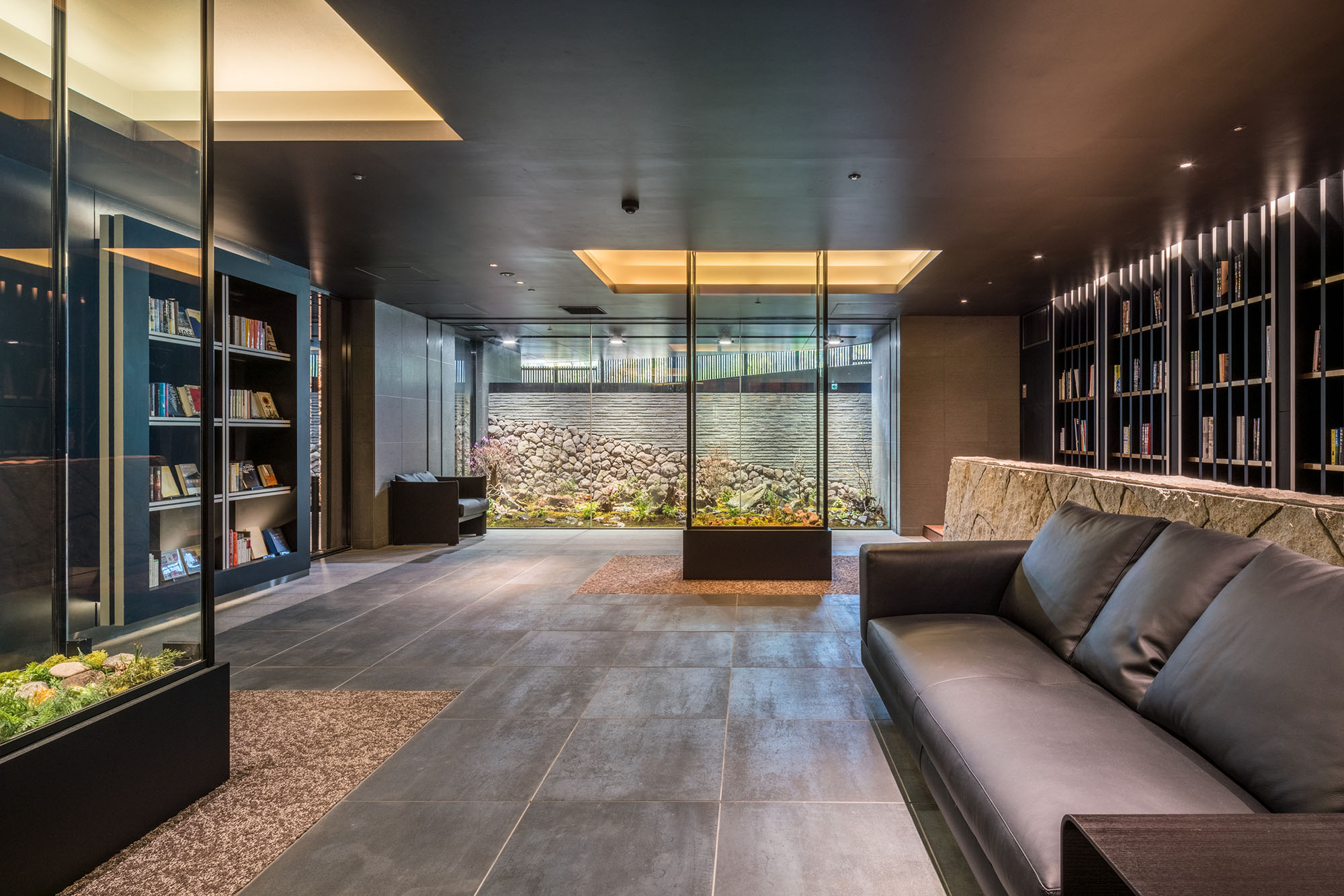 邸宅としての威厳を醸成する、石や木の印象で構成された重厚感のあるエントランス。シンボルツリーやアート、印象的な照明に誘われて進む、奥行きのあるアプローチは、歩みを進めるほどに、居住者を安心感で包み込んでいきます。その先で待っているライブラリーラウンジは、温もりや潤いを感じられる植栽を配したライトコートに面し、おだやかな時間を創出。書棚に並ぶ書籍の数々は、暮らしをより豊かなものへと昇華しています。文京ならではの自然や知性を取り込んだ演出に、ガラスケース内に水と緑を感じさせる、渓流をイメージした水景の設えを掛け合わせる事で、新しい文京邸宅の共用空間を体現。また、常に本に触れることで、新たな気づきが生まれ、感性が刺激されるなど、ここで過ごす何気ない時間が、豊かなライフスタイルへとつながっていきます。