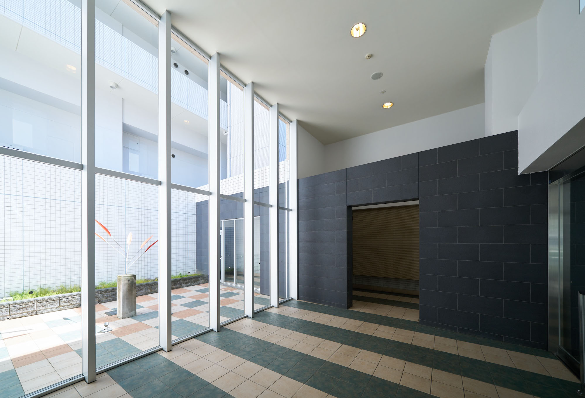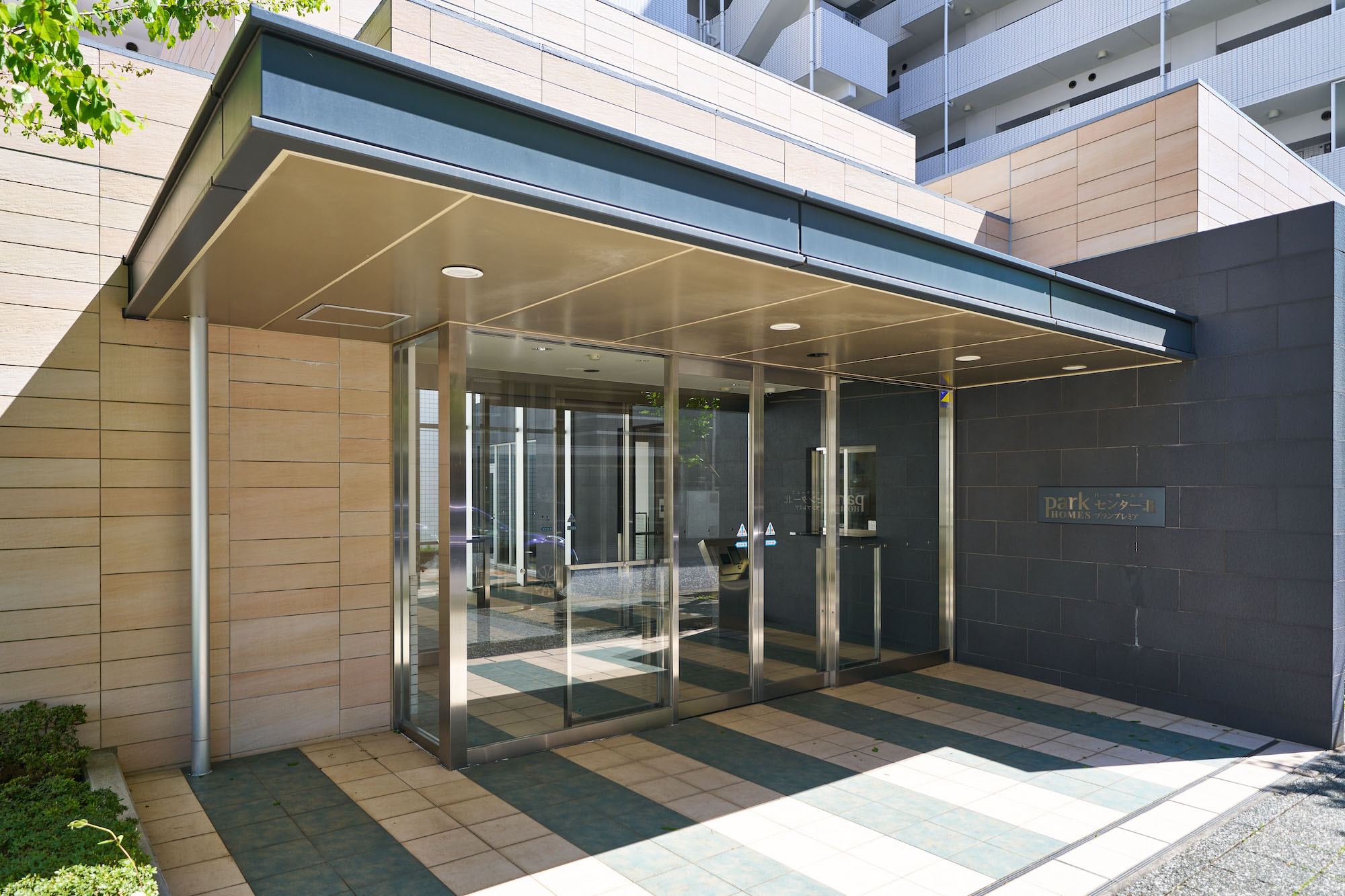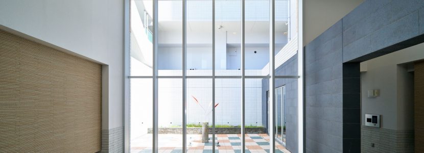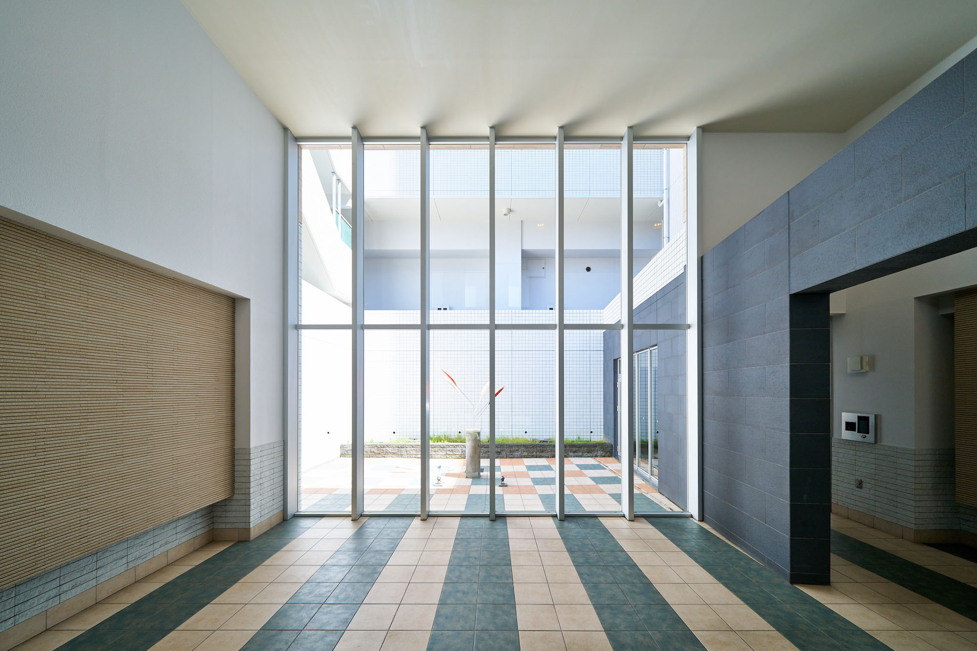 駅に近く落ち着いた集合住宅ゾーン側に、独立したエントランス棟を設計。道路からセットバックさせ、周囲と離れた中間的な領域を生み出すことで、空間の奥行きと寛ぎ豊かな邸宅としての存在感を印象づけています。外から内へ、斜めに貫入するアクセントウォールが視線を奥へいざない、空間の広がりを創出。ここには駅前の「動」的な世界から、住まいにあるべき「静」の世界へ至るストーリーづくりが意識されています。その答えがプライベートな「パティオ」。昼は穏やかな自然光、夜はオブジェを照らす優しい光が心を癒し、ゆったりしたリズムへいざないます。