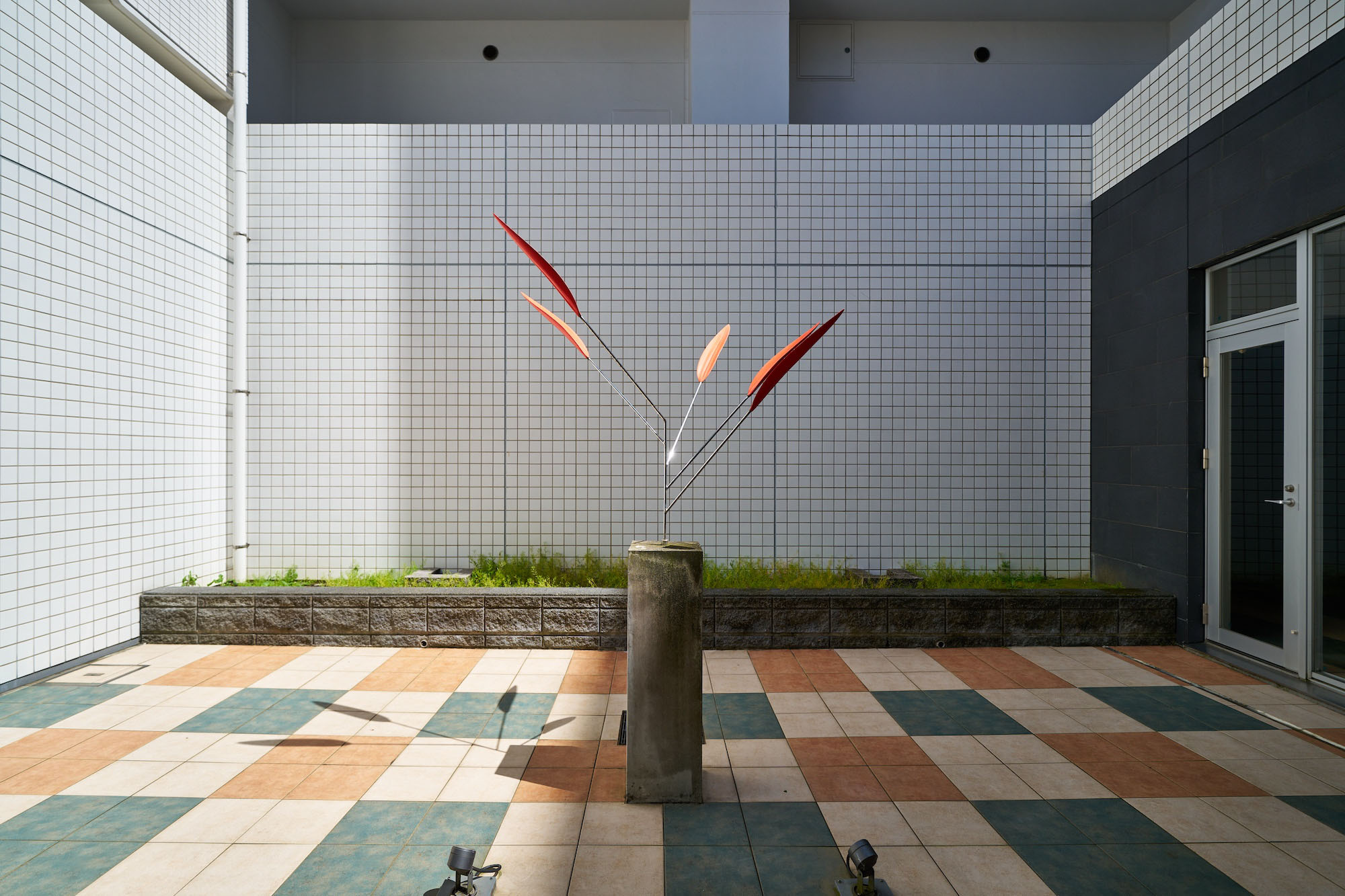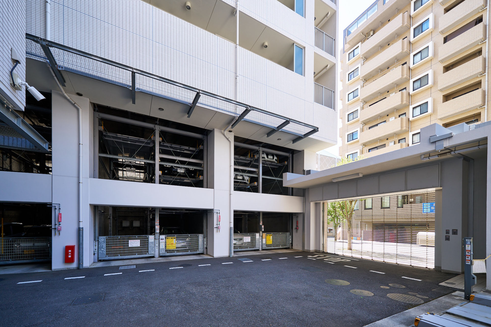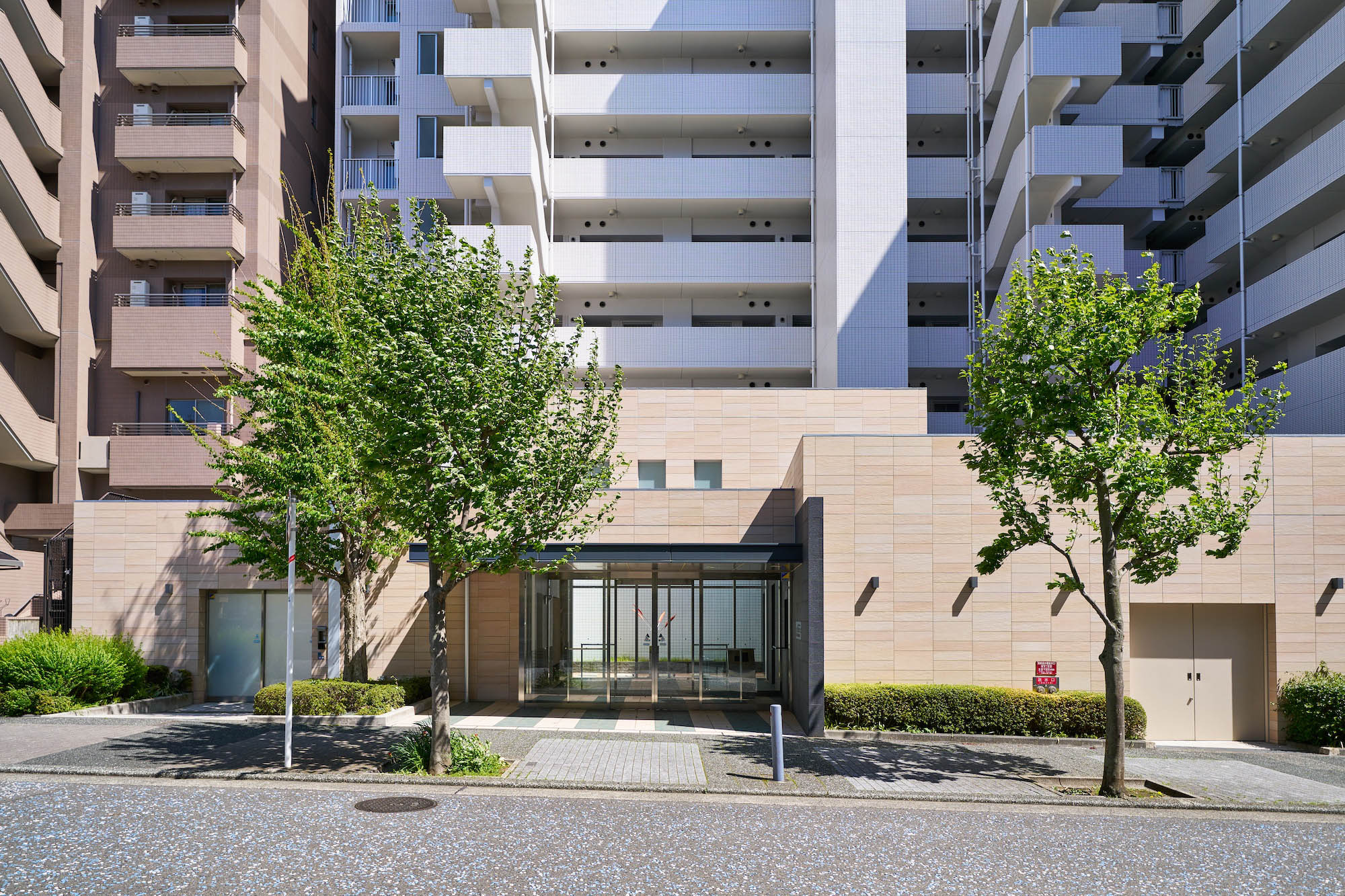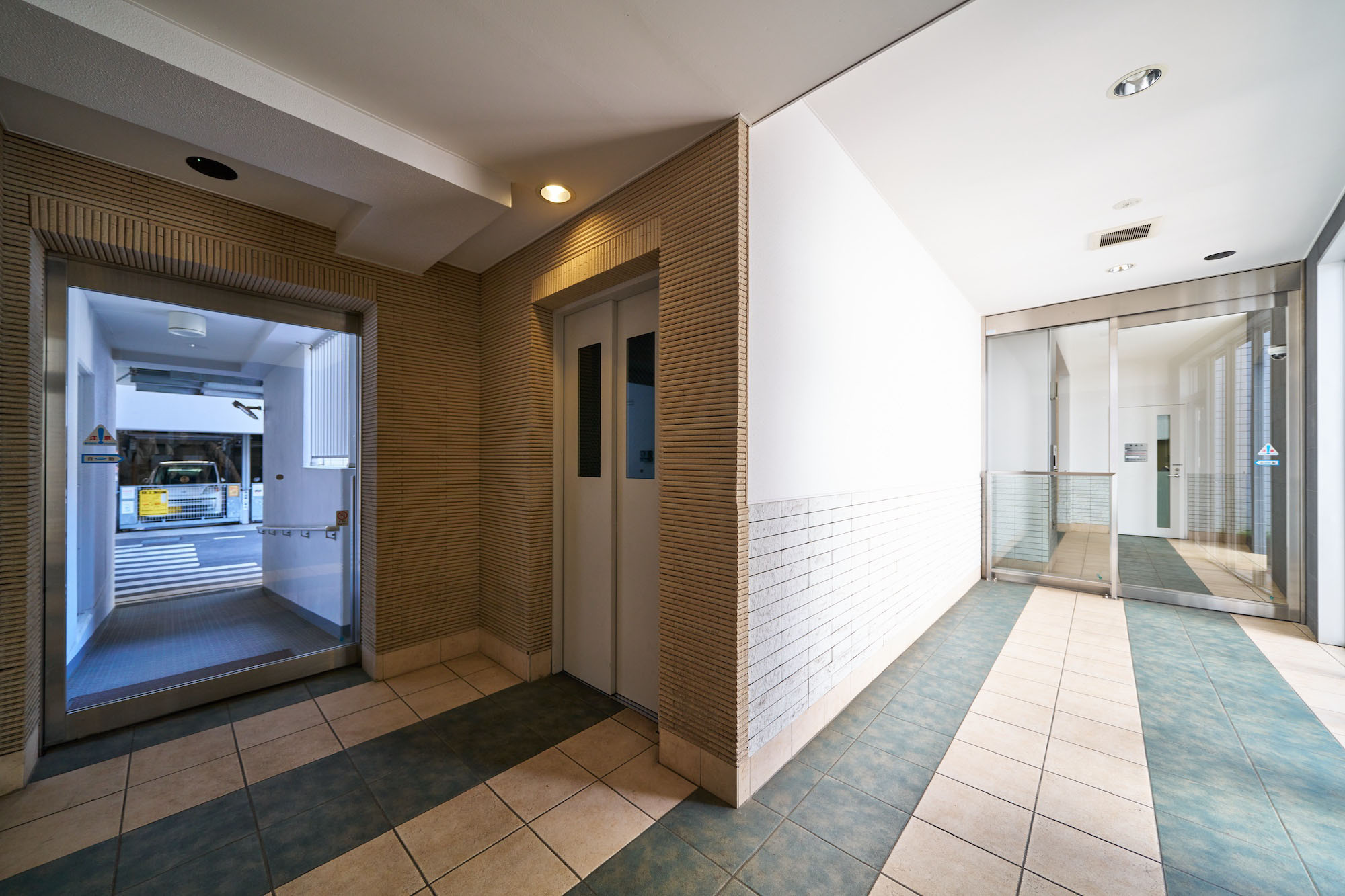 駅に近く落ち着いた集合住宅ゾーン側に、独立したエントランス棟を設計。道路からセットバックさせ、周囲と離れた中間的な領域を生み出すことで、空間の奥行きと寛ぎ豊かな邸宅としての存在感を印象づけています。外から内へ、斜めに貫入するアクセントウォールが視線を奥へいざない、空間の広がりを創出。ここには駅前の「動」的な世界から、住まいにあるべき「静」の世界へ至るストーリーづくりが意識されています。その答えがプライベートな「パティオ」。昼は穏やかな自然光、夜はオブジェを照らす優しい光が心を癒し、ゆったりしたリズムへいざないます。
