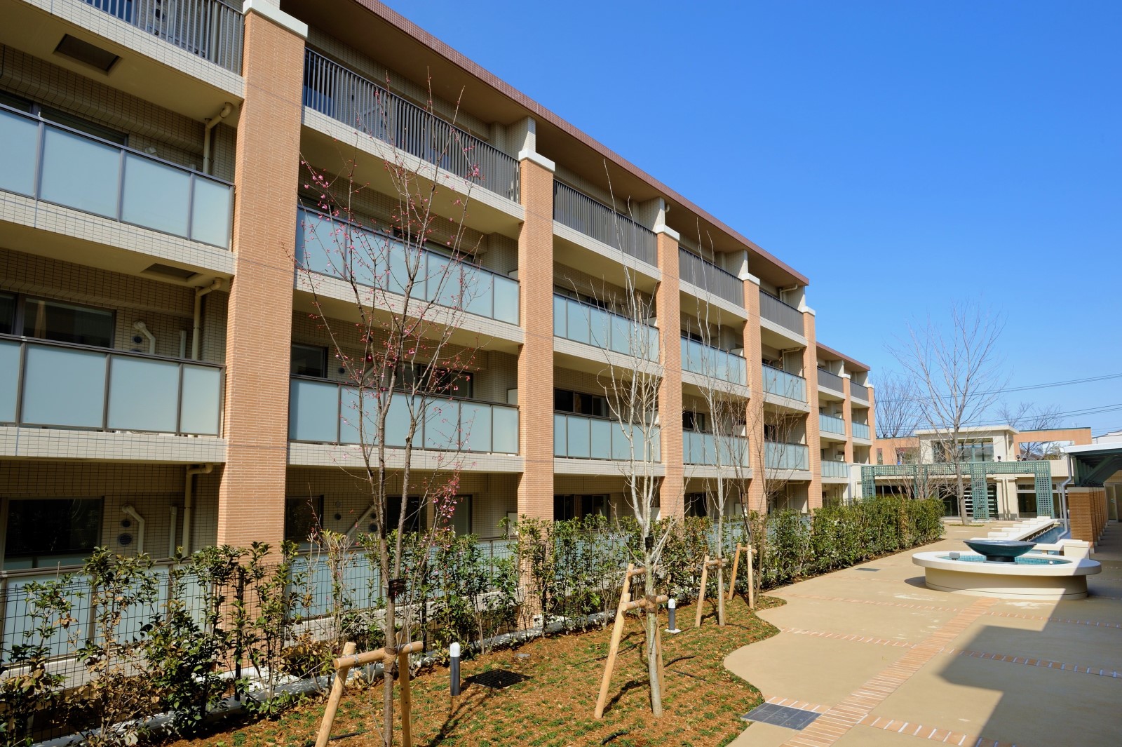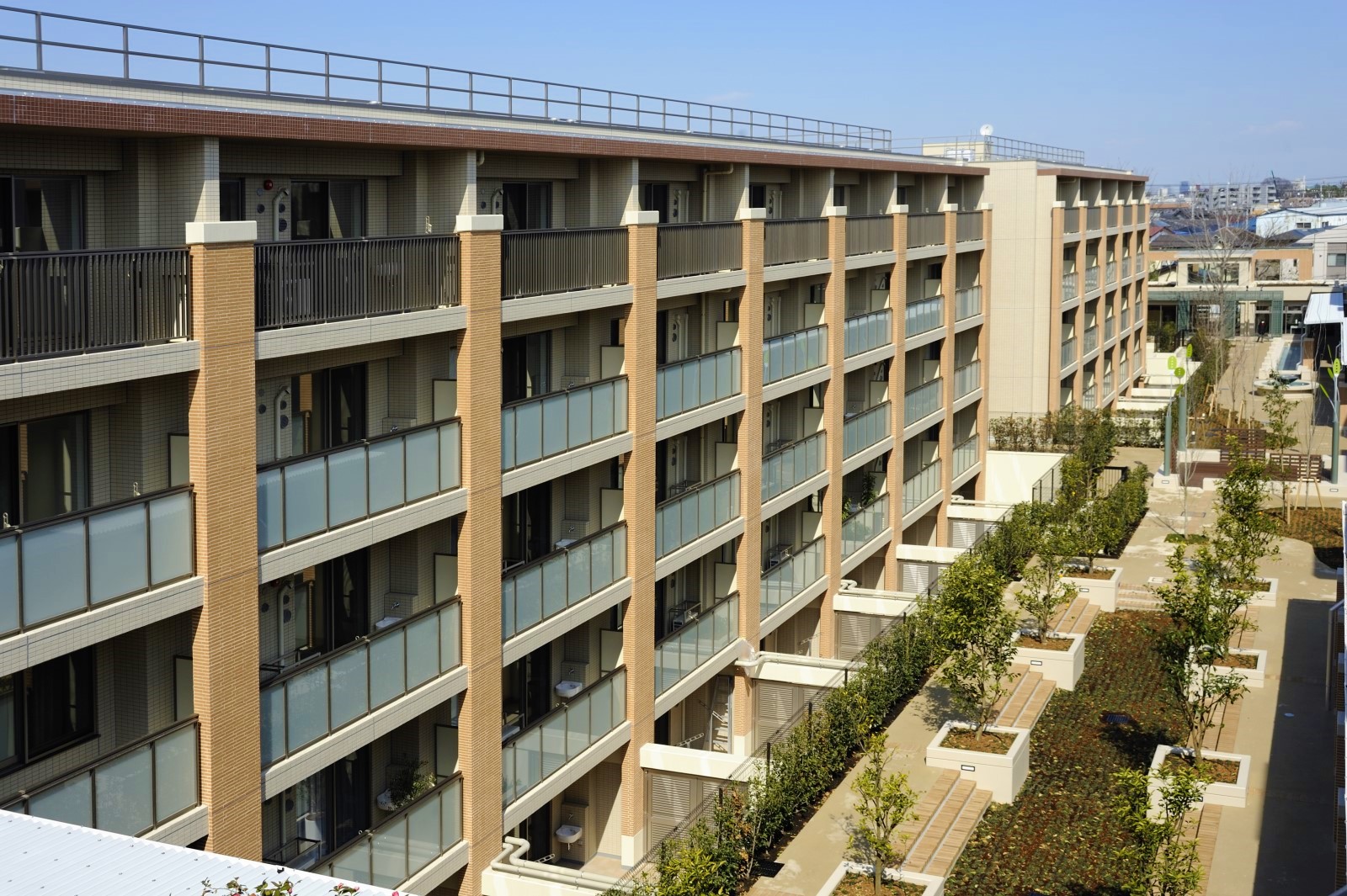 世田谷の穏やかな街並みの中で、100種を超える樹々がつくる美しい外周の森。その森の奥に佇む外観は、落ち着きがあり、世田谷の街にしっくりととけ込みます。中庭の広場に面した外観デザインは、ボーダータイルの列柱により縦ラインを強調しています。また、中庭側のバルコニーの立ち上がりを半透明のガラスにすることで、プライバシー性を保ちつつ、中庭との一体感が感じられる開放的な設えとしました。住戸配置も直線ではなく意図的に凹凸をつけることで、建物に表情をつけています。