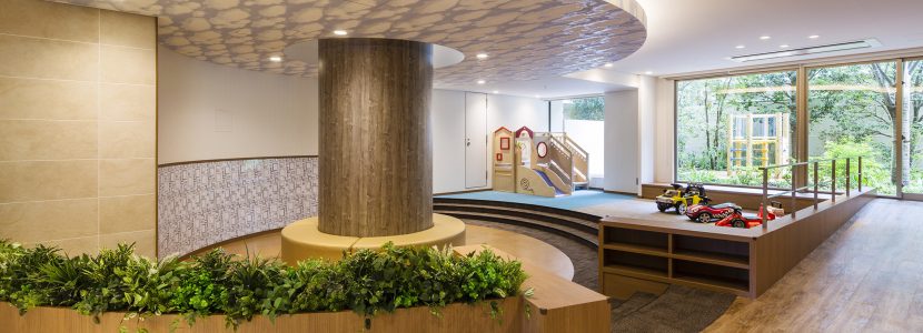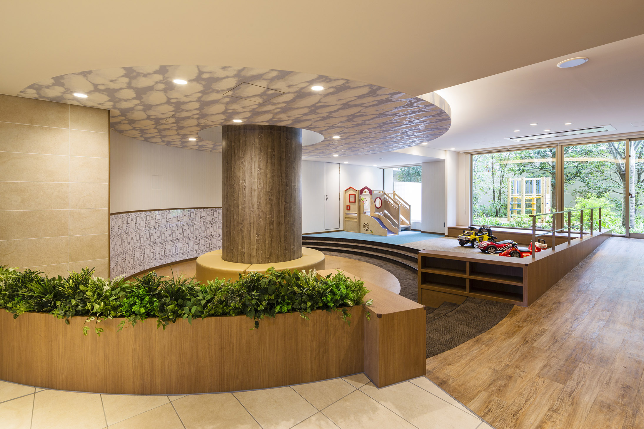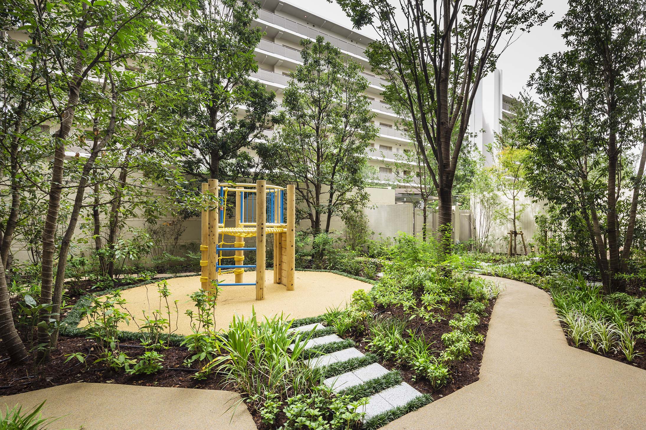 深大寺の深い緑をイメージさせる樹々を植樹。敷地内の守られた空間で子どもたちを安心して遊ばせられる場所です。