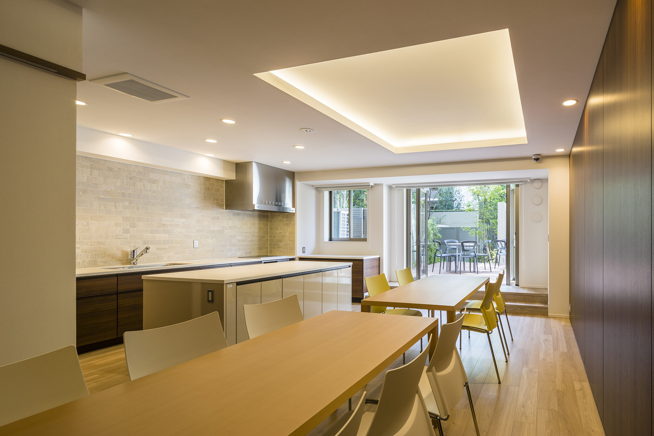 キッチンや畳スペースを備えた空間。中庭の緑を感じる、パーティーテラスへと繋がっています。