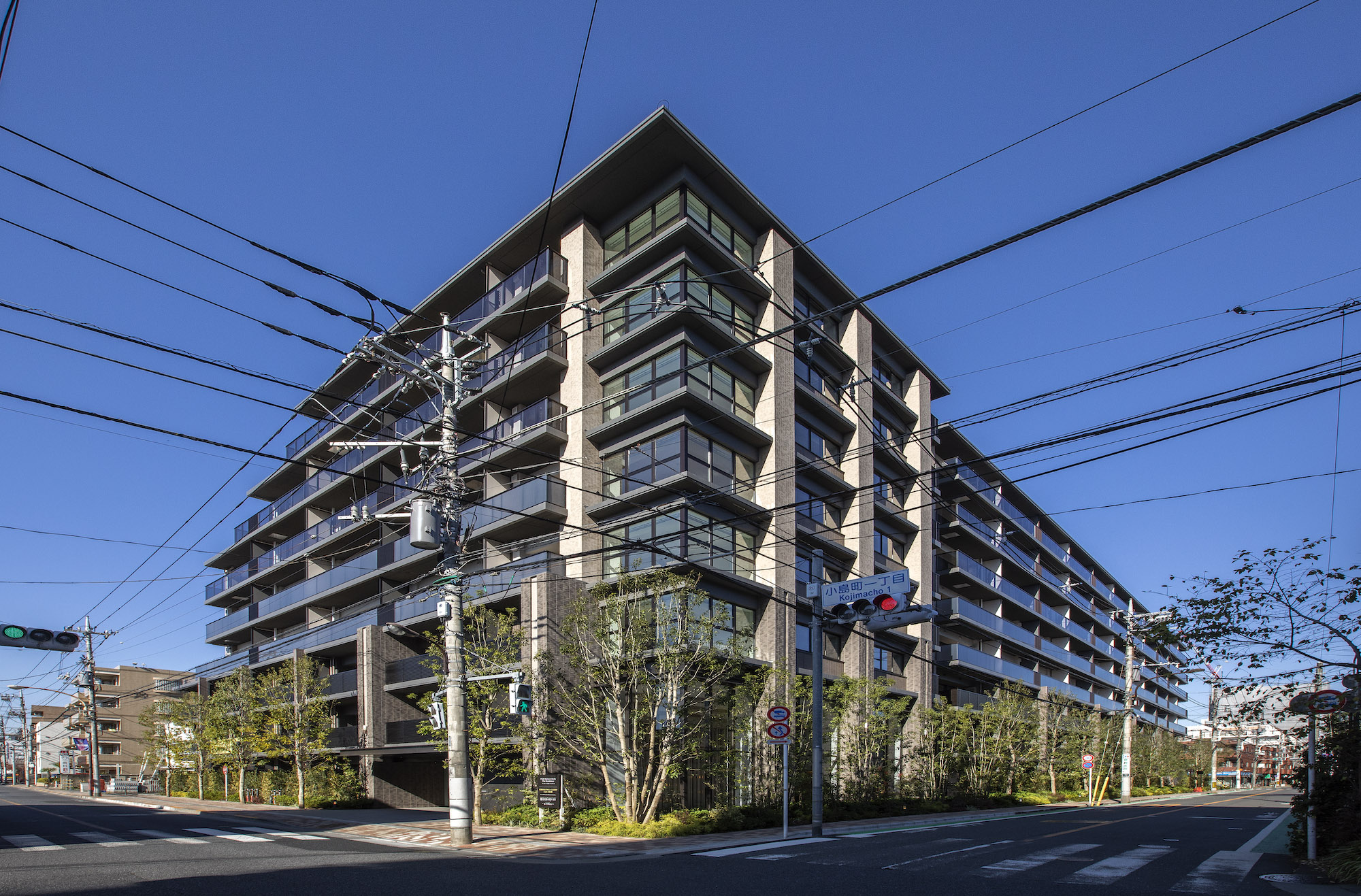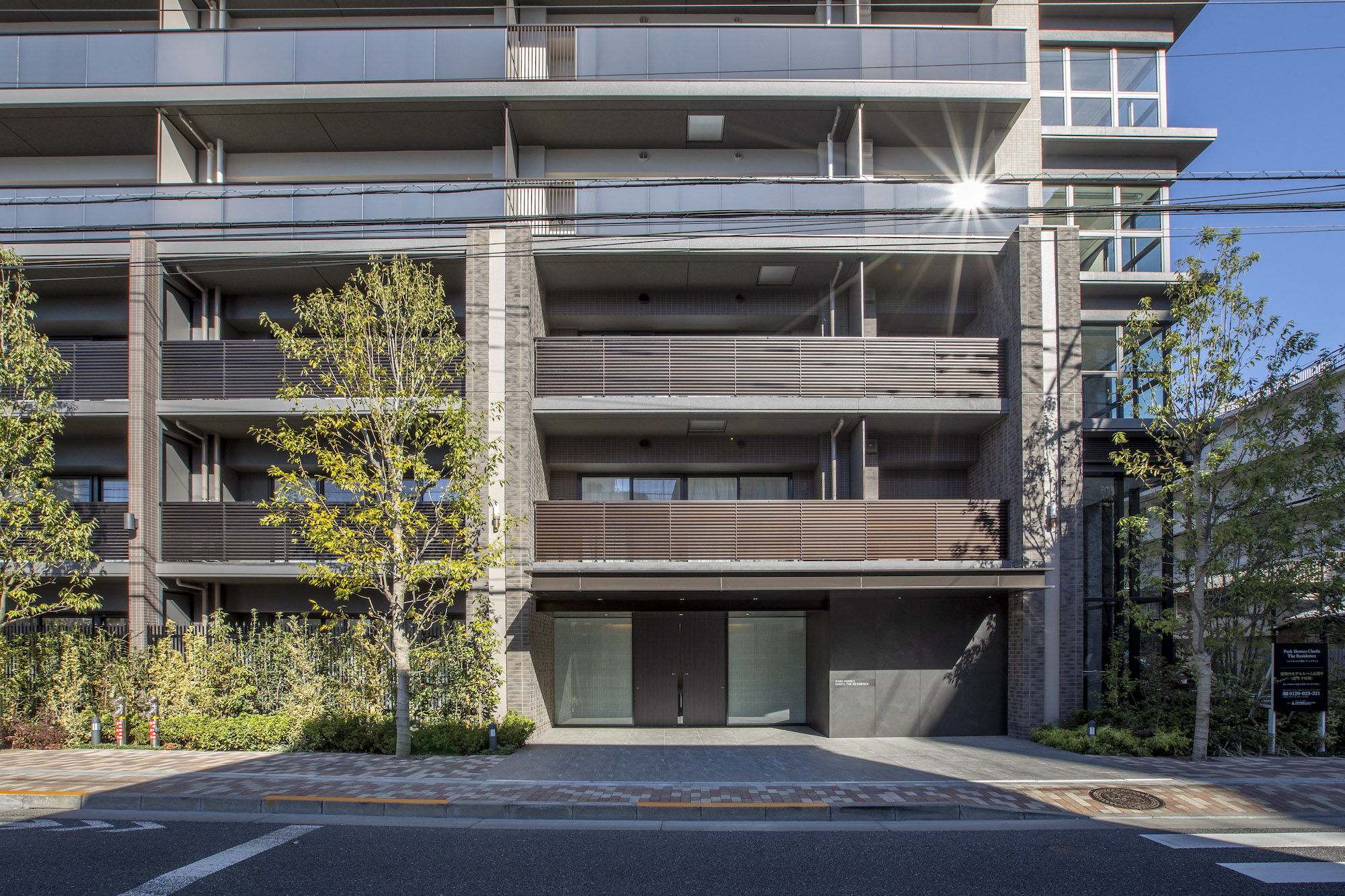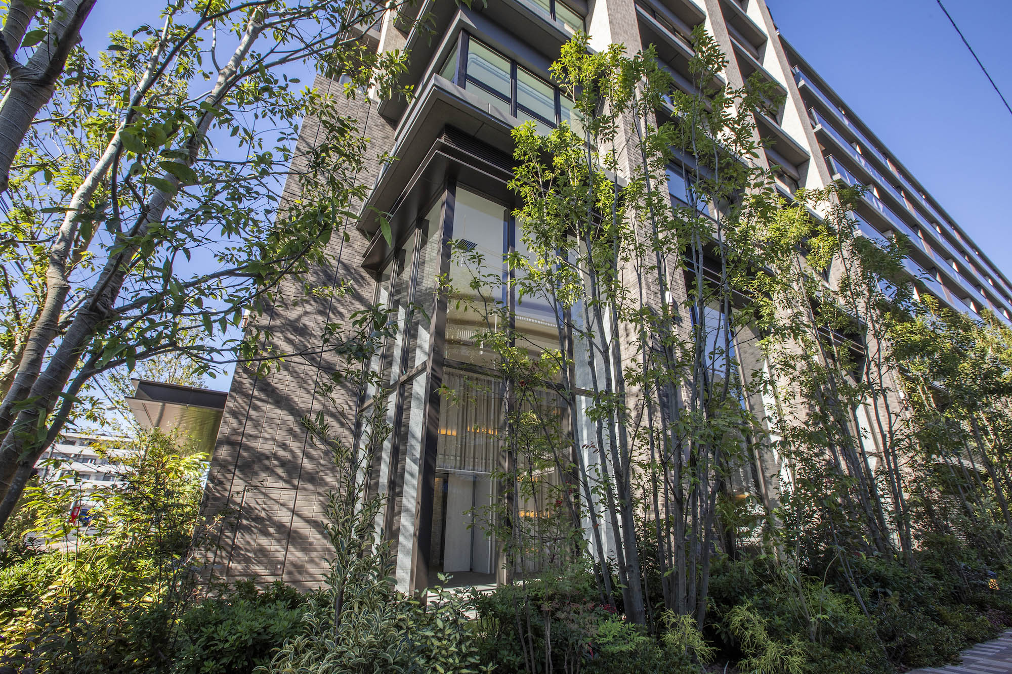 シックな色合いで落ち着いた佇まいの「パークホームズ調布ザレジデンス」。建物をセットバックさせて公開歩道を設け、暮らしを自然の潤いで包み込むように豊かな植栽を配置。心地よい暮らしと街並みを描くランドスケープがデザインされています。