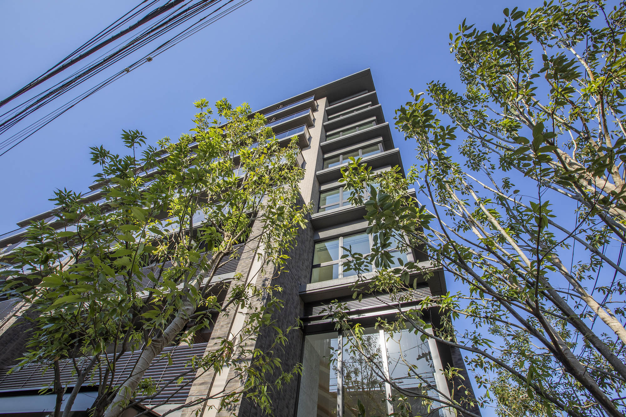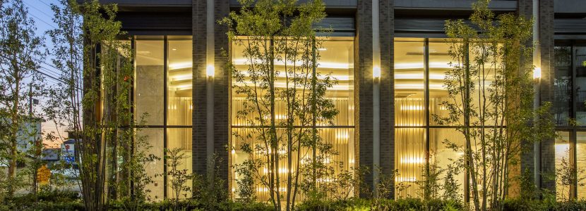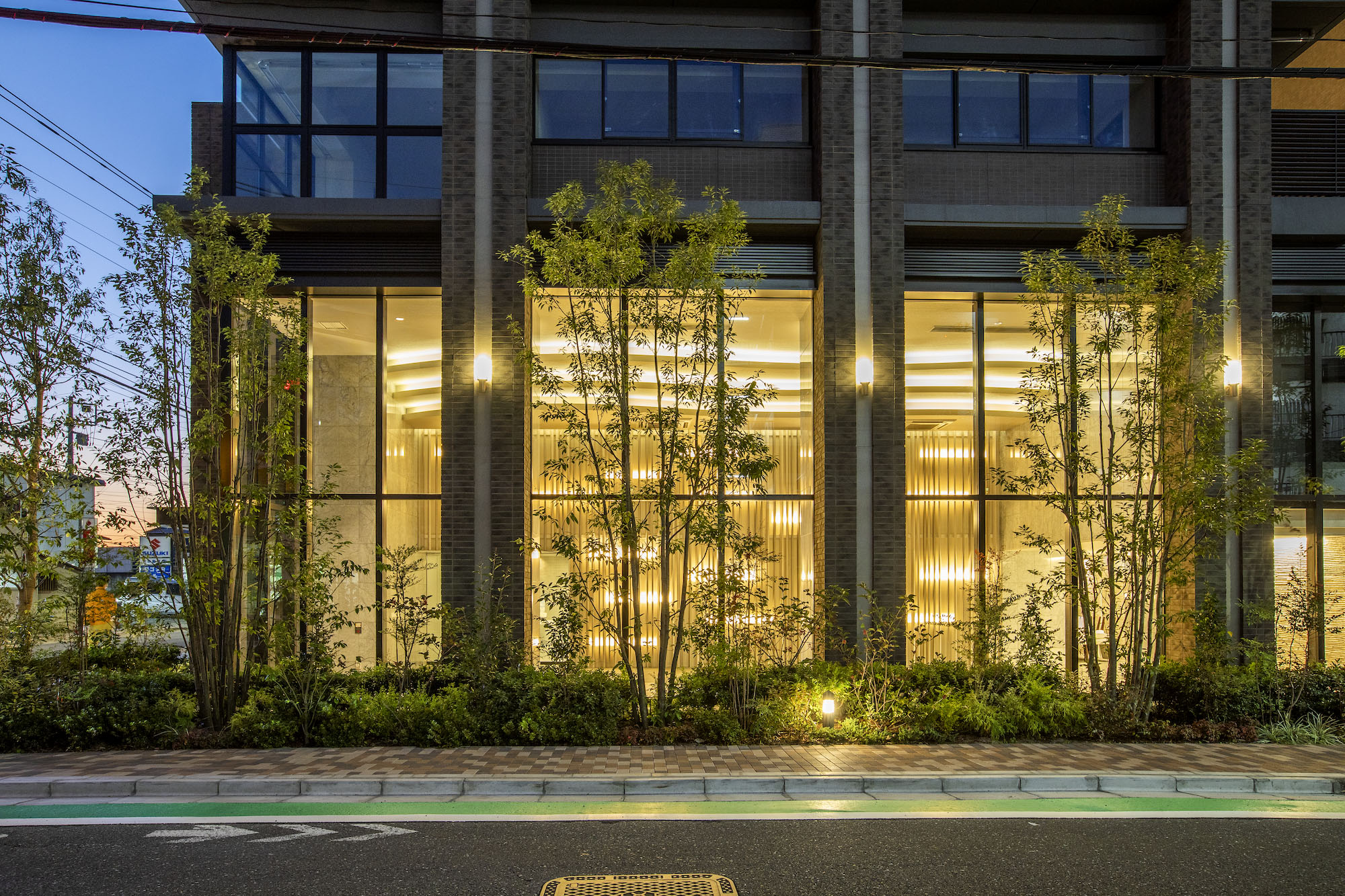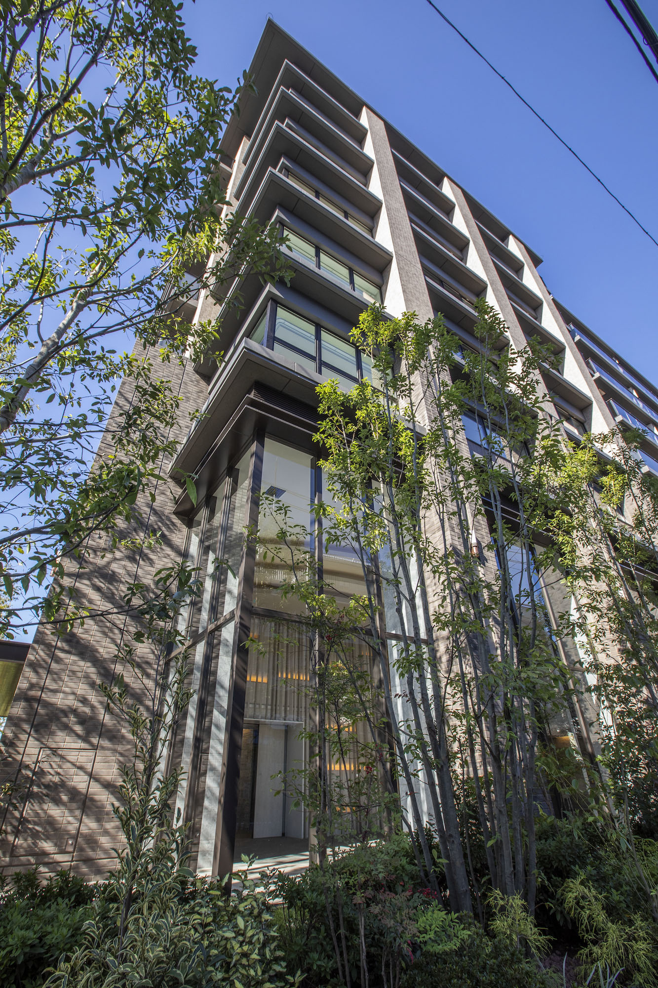 シックな色合いで落ち着いた佇まいの「パークホームズ調布ザレジデンス」。建物をセットバックさせて公開歩道を設け、暮らしを自然の潤いで包み込むように豊かな植栽を配置。心地よい暮らしと街並みを描くランドスケープがデザインされています。