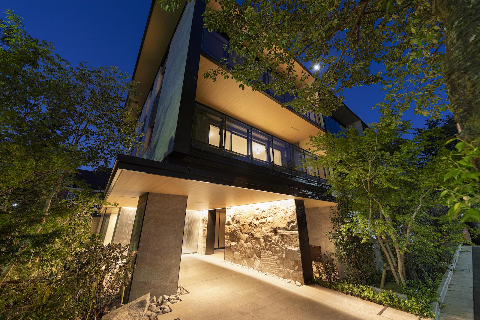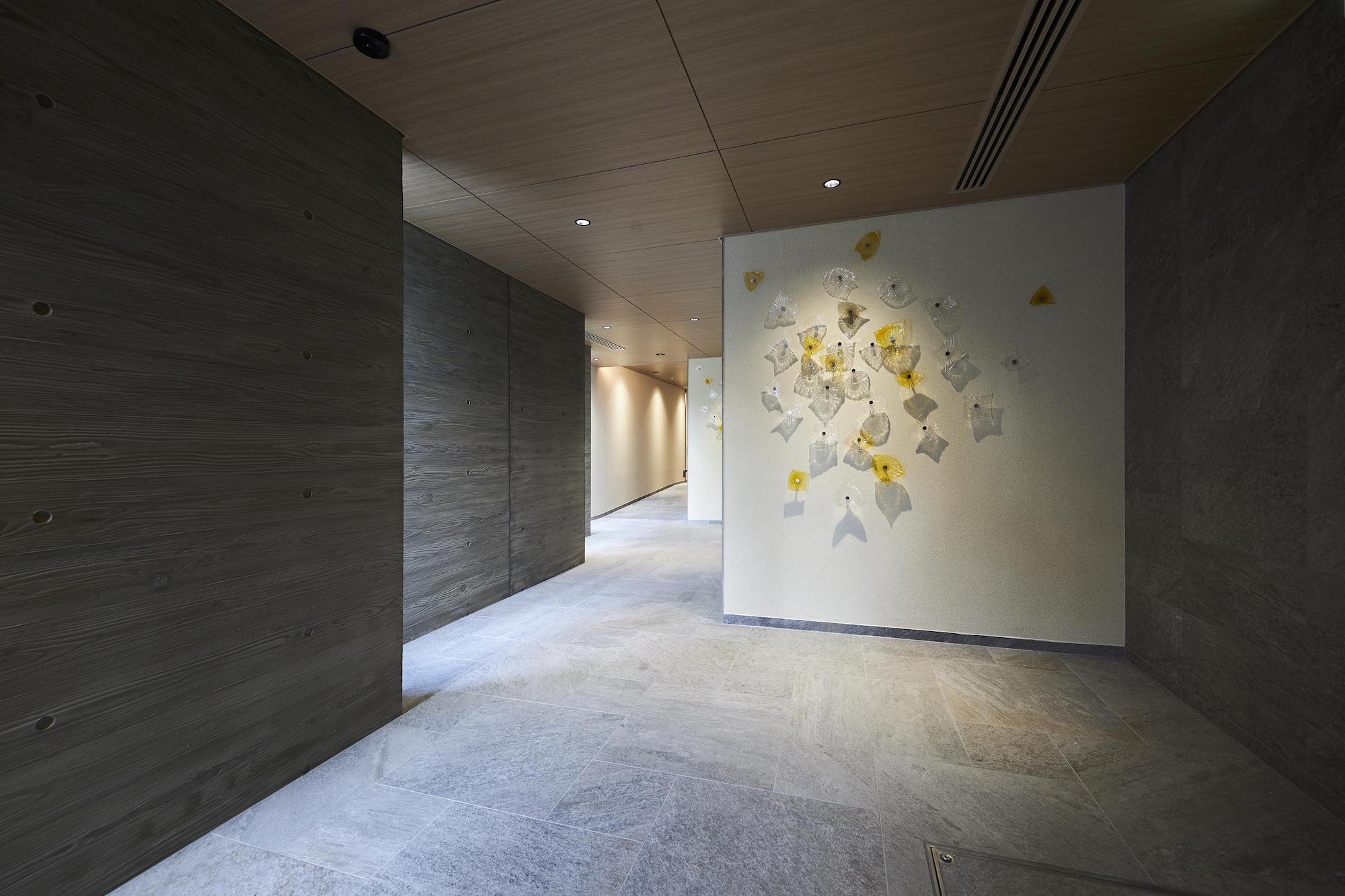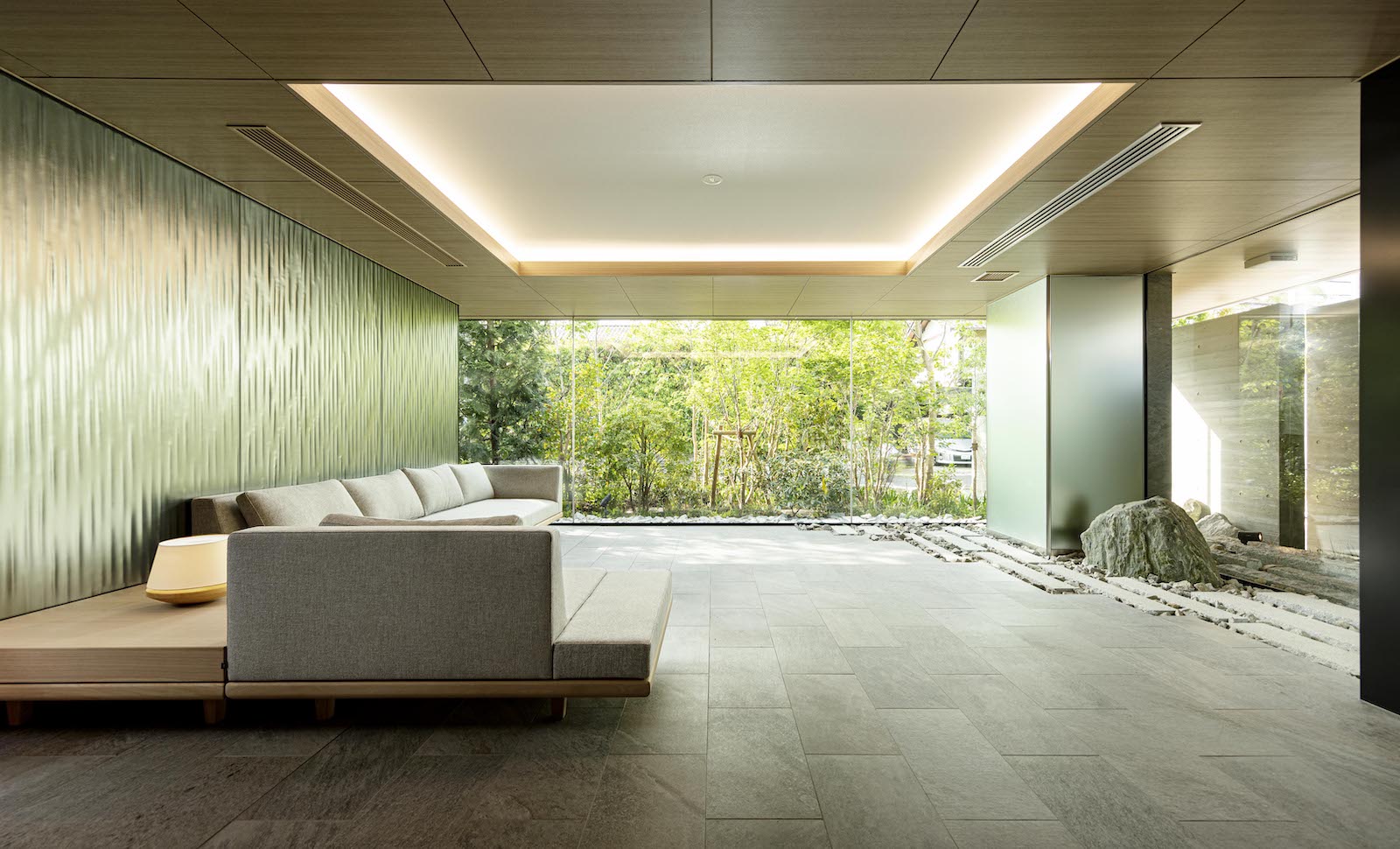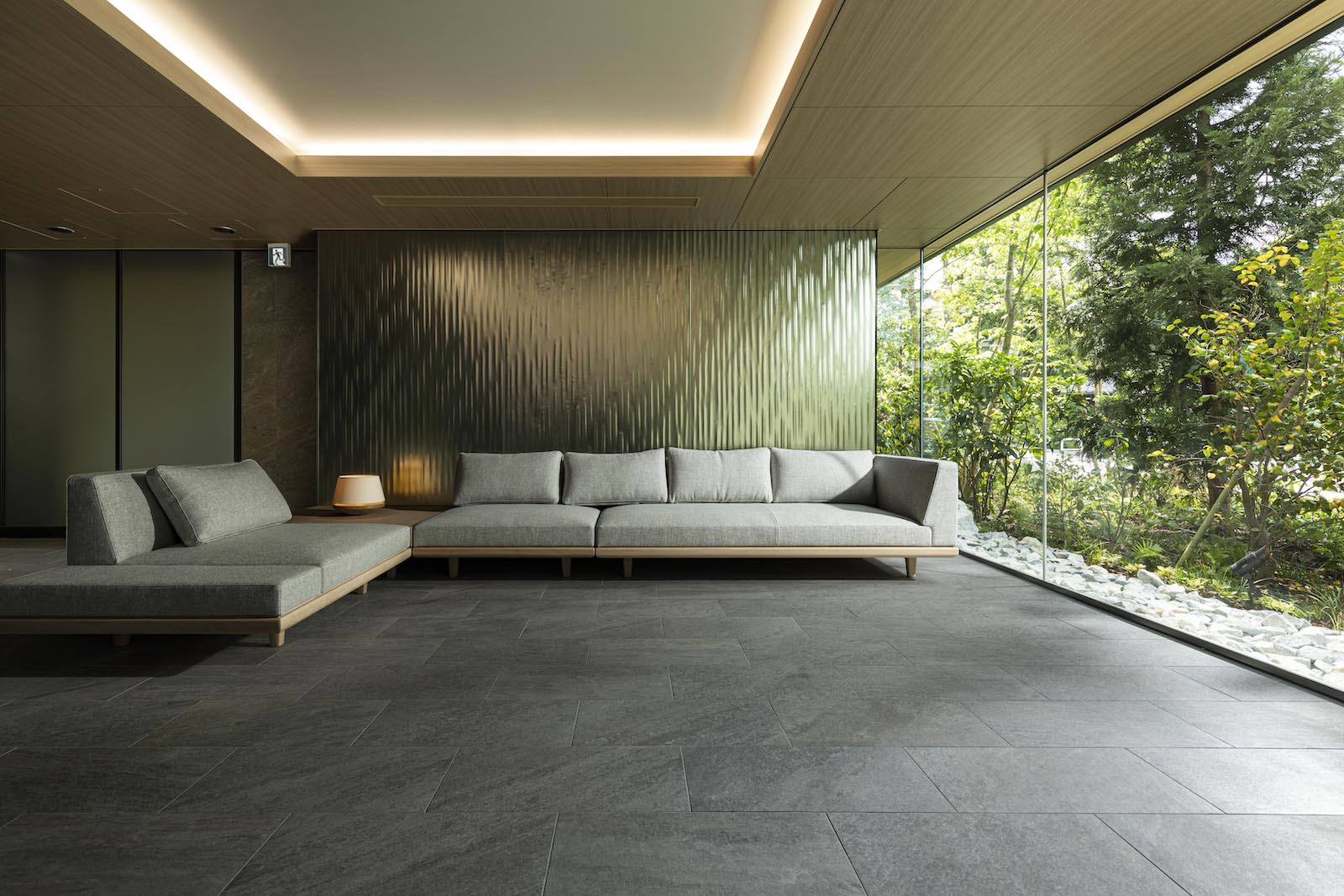 深沢の原風景を感じさせる緑の木立、水の流れをモチーフにしたガラスのアート壁に包まれた、まるで室内にいながら沢のほとりに佇んでいるようなバイオフィリックなエントランスラウンジ。大きな窓の向こうに自然を感じながら、上質かつ安らぎのひとときを過ごせます。大切なゲストを迎える瞬間も絵になる迎賓の空間です。