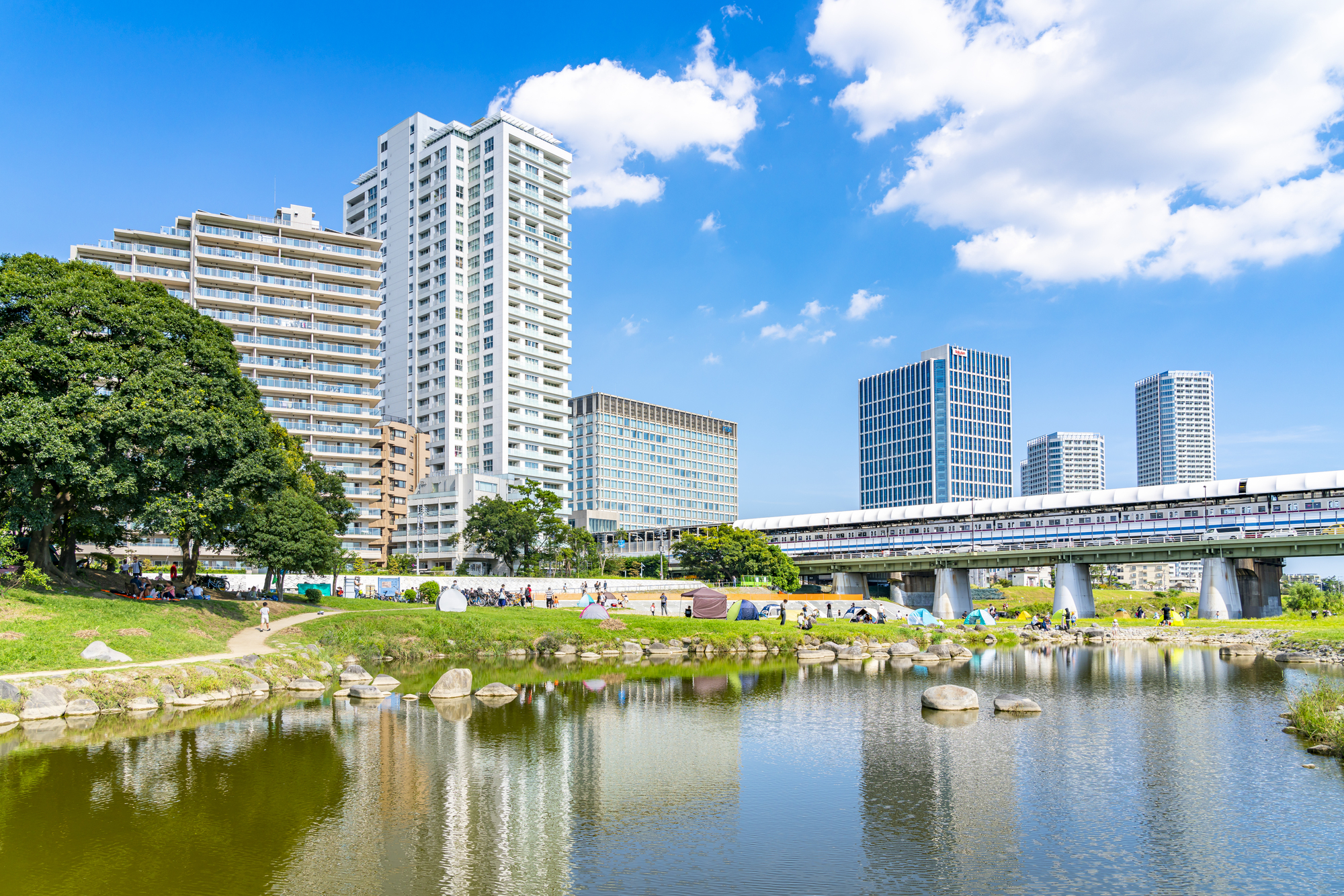 広大な河川敷を利用した多摩川緑地まで徒歩6分。川沿いにはサイクリングロードや広々とした公園が整備され、レジャーにスポーツに、爽やかで心地よいリバーライフがかないます。徒歩5分の東急田園都市線「二子新地」駅周辺には、各種専門店やコンビニエンスストアなどが並び、毎日のお買い物に便利。「玉川髙島屋S・C」を中心に洗練されたブティックやレストランが並ぶ「二子玉川」駅前エリア、デパートや専門店街が揃っている「溝の口」駅前エリアも身近な生活圏です。都市と自然の美しい二重奏が、心地よい暮らしを叶えてくれます。