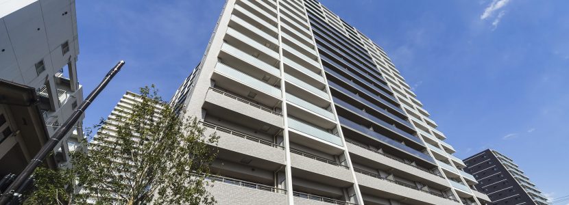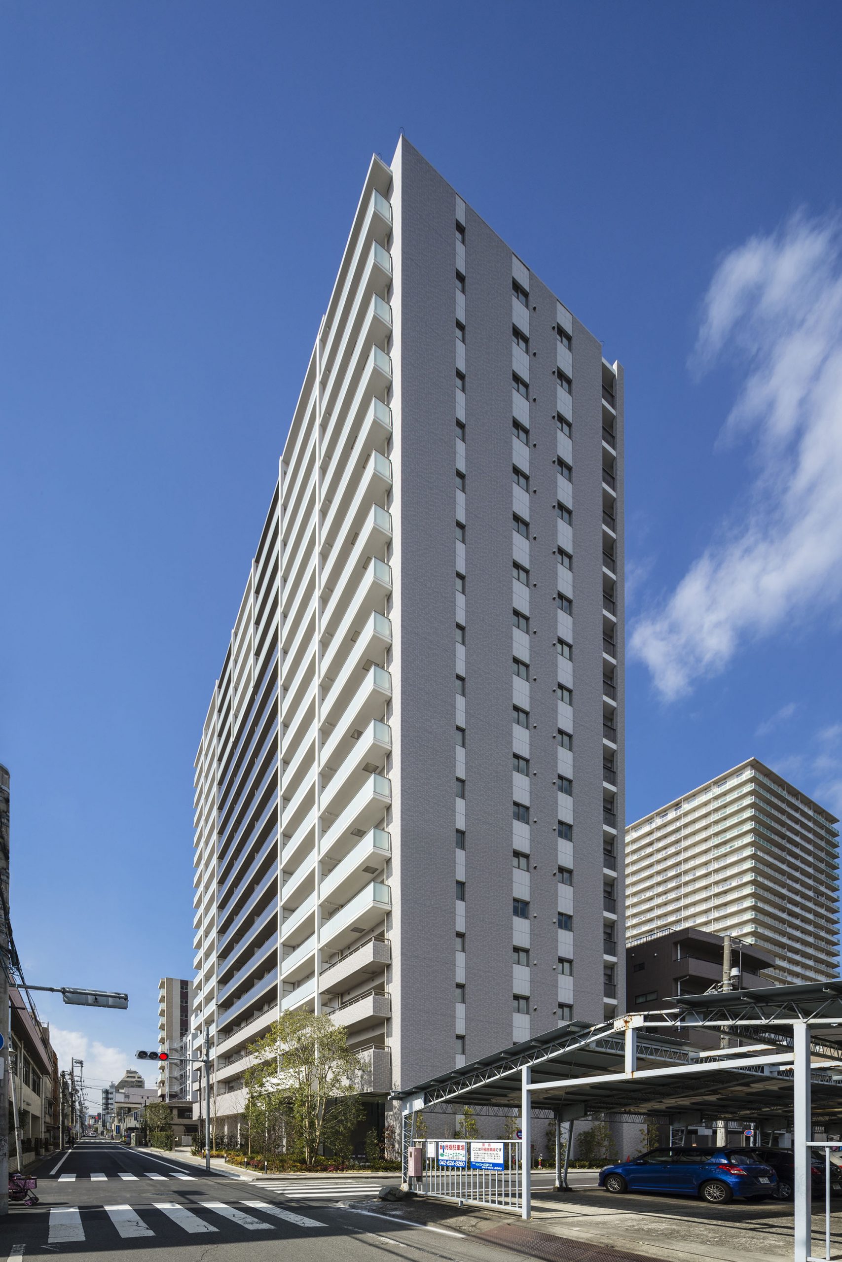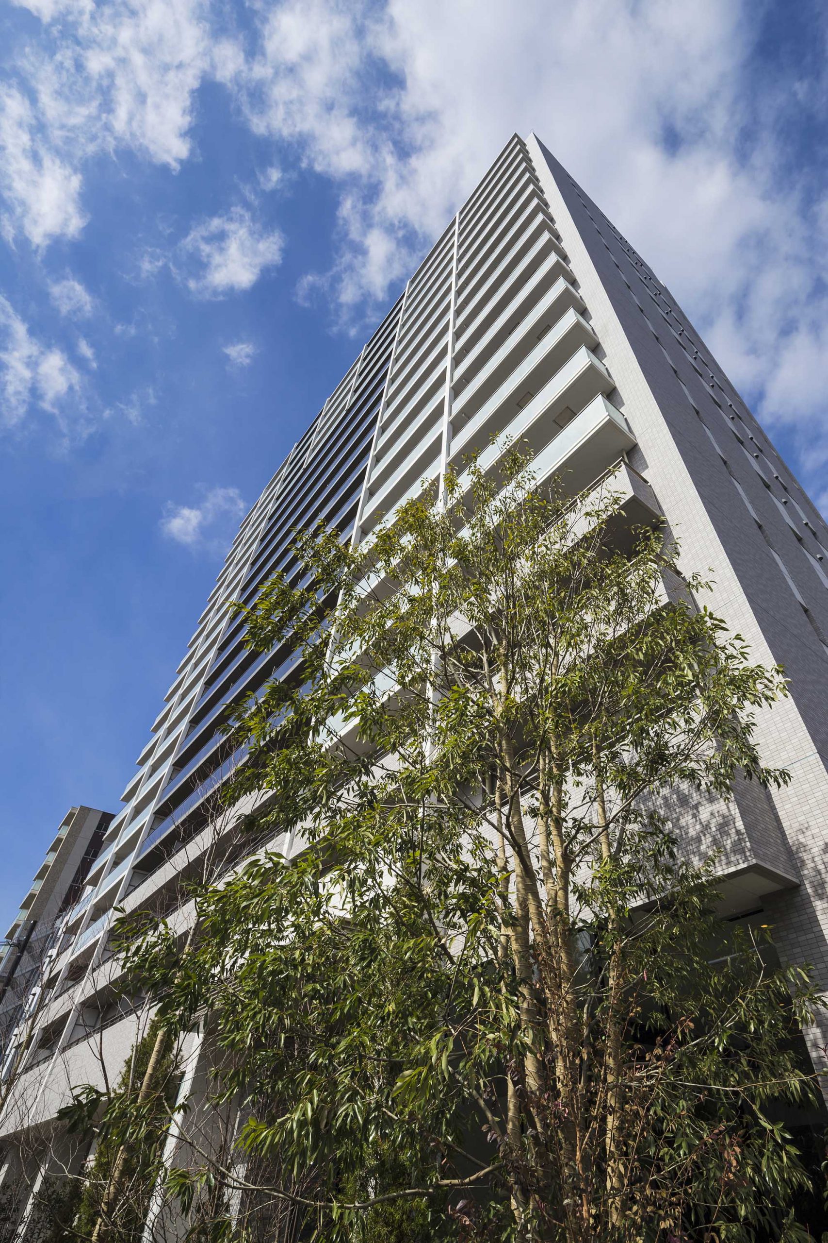 地上18階建ての存在感を放つフォルム。白とグレーのモノトーンカラーをベースに、バルコニーや外廊下の大部分にガラス手すりが採用されています。洗練された質感が印象的なタイルや、美しく陽光を透過するガラスが、空へと伸びるスタイリッシュな外観を演出。煌めきながら空にとけこむような佇まいです。