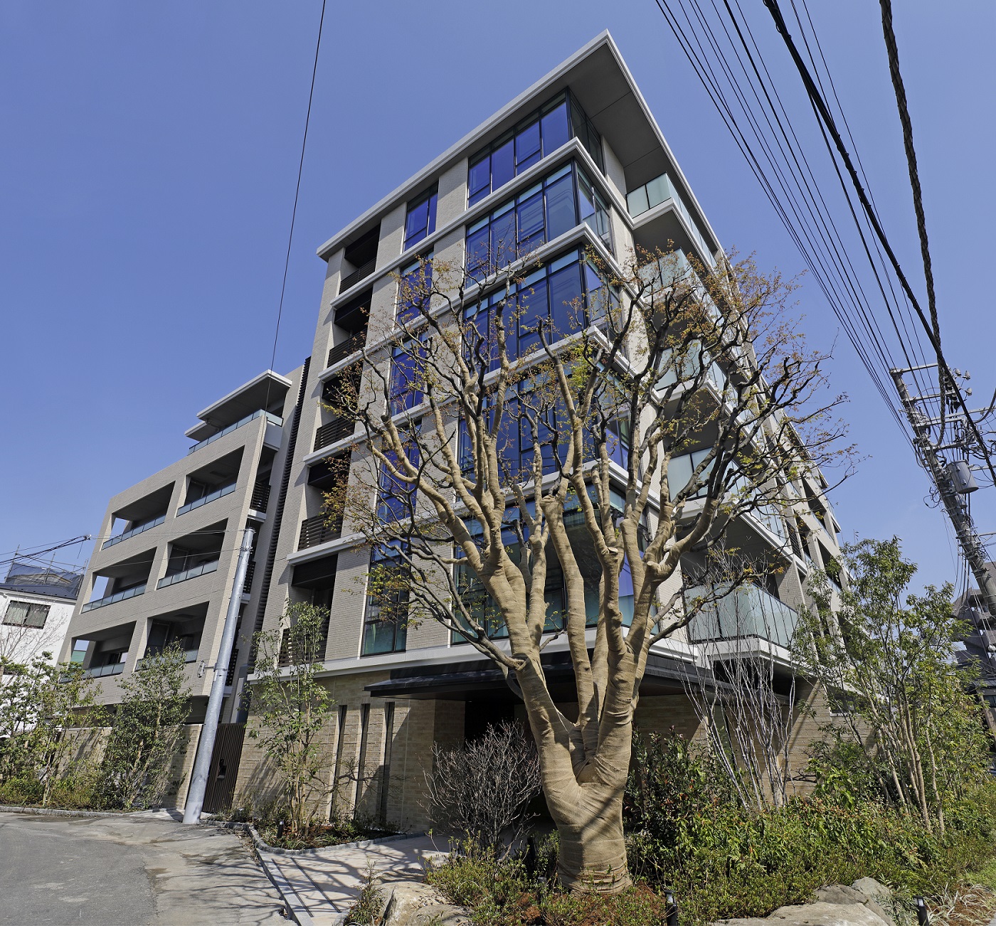 都市的な洗練、周囲にある緑や桜の景色、そして邸宅としてのアイデンティティを追求したファサードデザイン。コーナーサッシやマリオンを印象的に演出しながら、街に優しく溶け込むような美しいシルエットが創り上げられています。