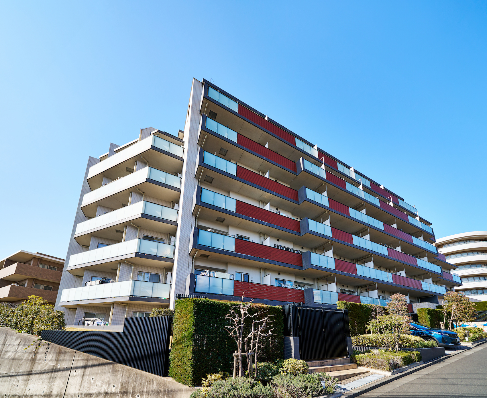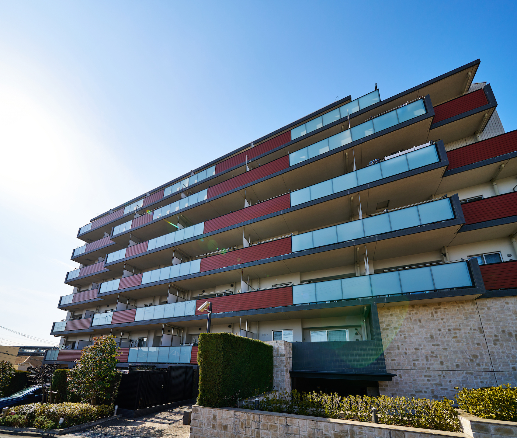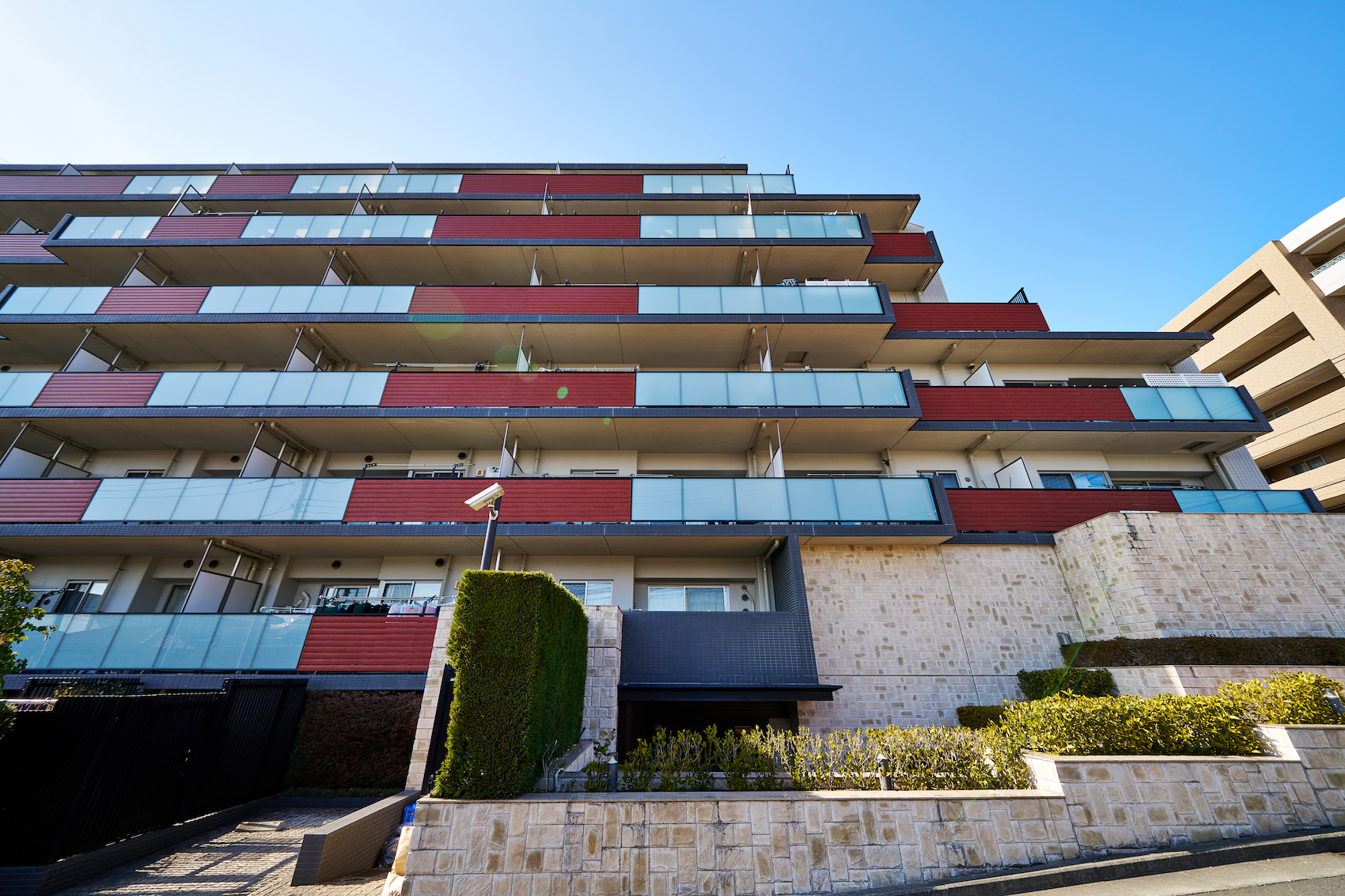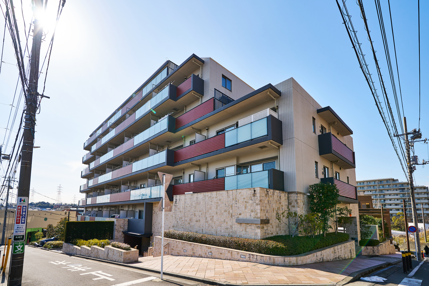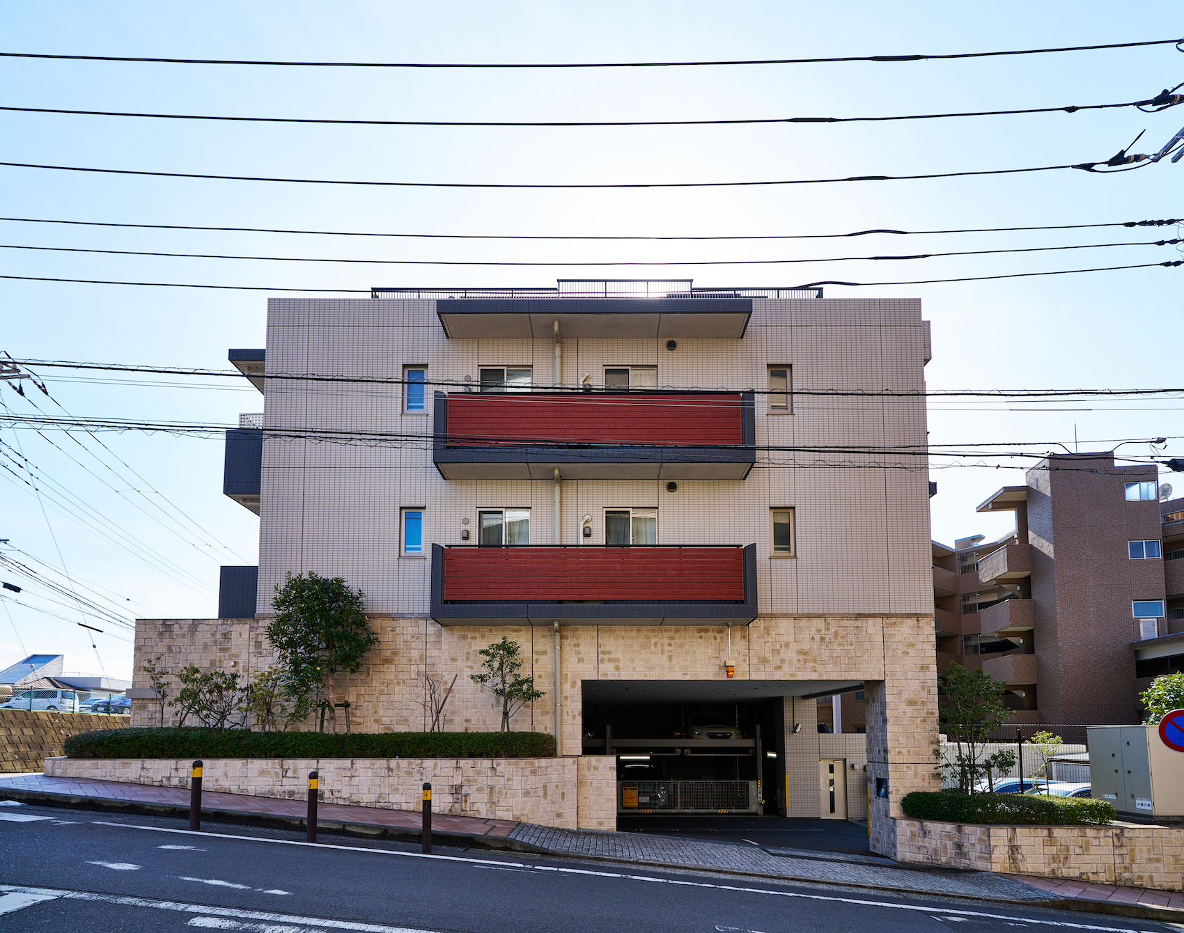 イチョウ並木を抜けて我が家へ辿り着く安堵感や、空の広さを感じさせる立地を際立たせるように、水平ラインを強調したフォルム。外観デザインには、自然の質感をもたらす木調素材で温もりと安らぎを、透明感のあるガラス素材で軽やかさを、タイルと手摺りなどの墨色のアクセントでシャープな印象を演出しています。基壇部の大判タイルは、自然の石調の質感で重厚感と安心感のある表情を描き、夜には光の陰影が外観を印象的に彩ります。