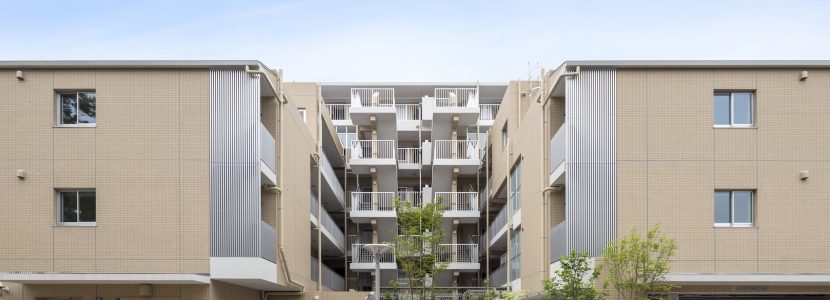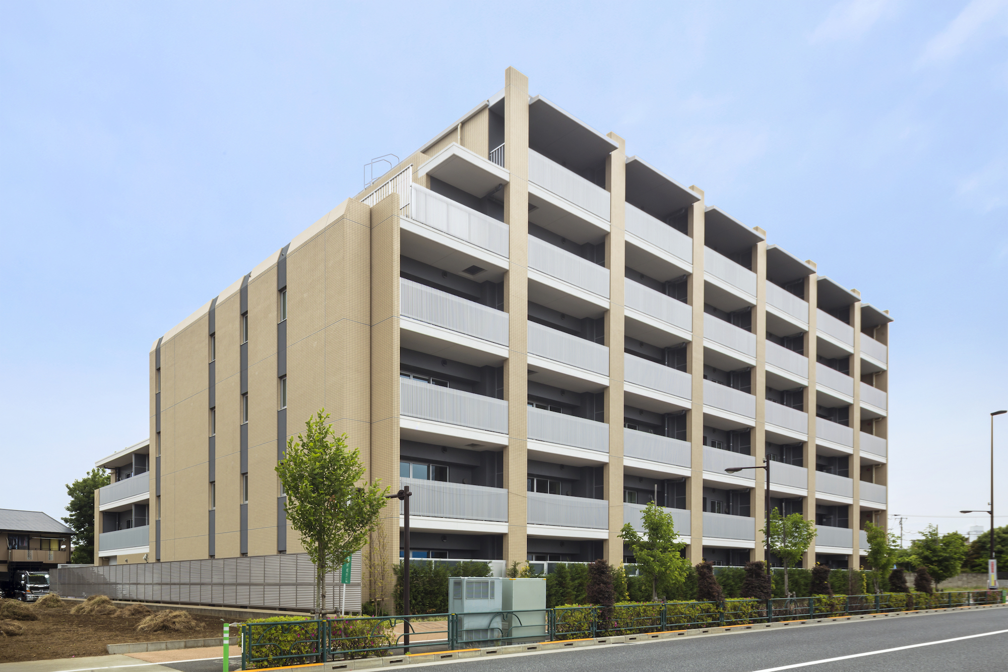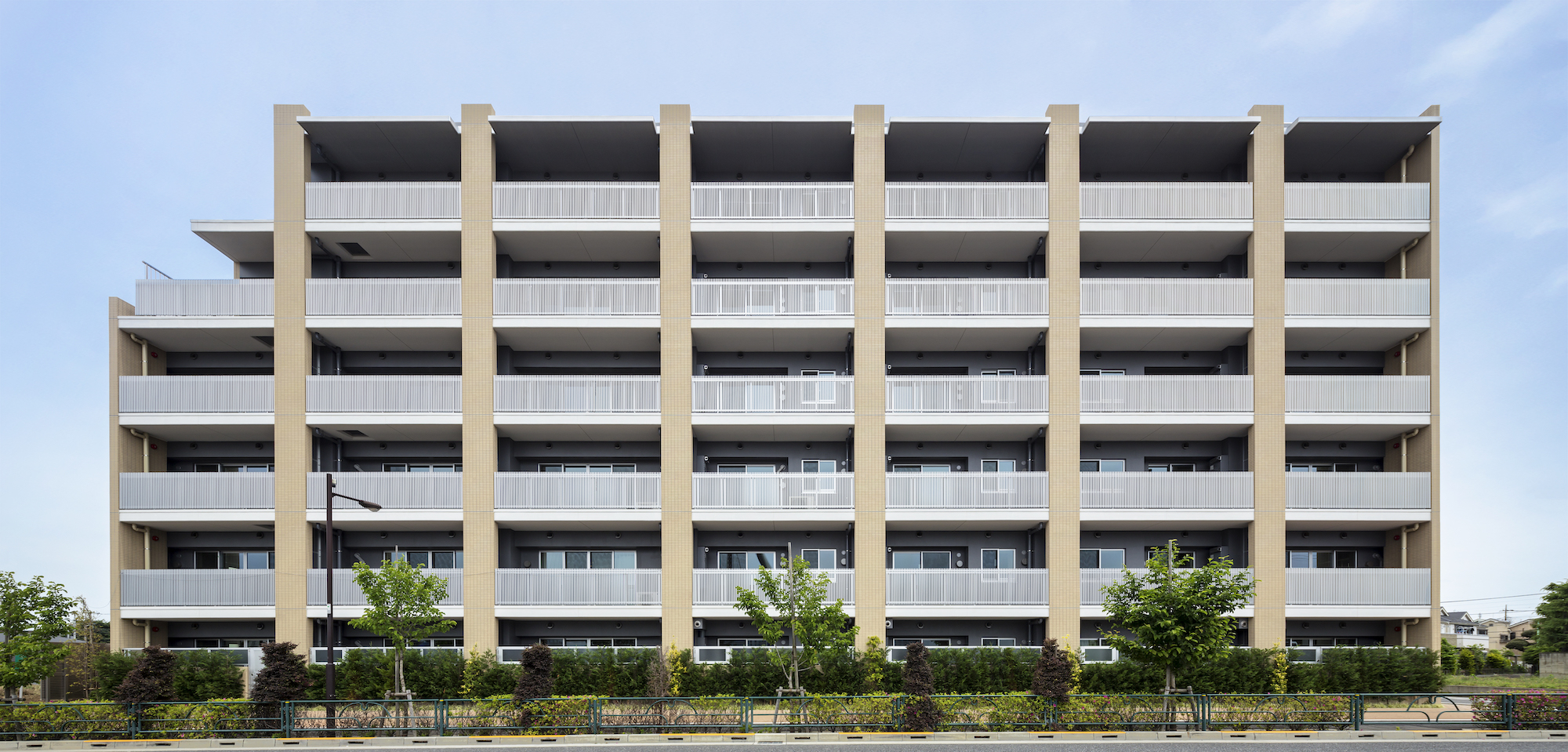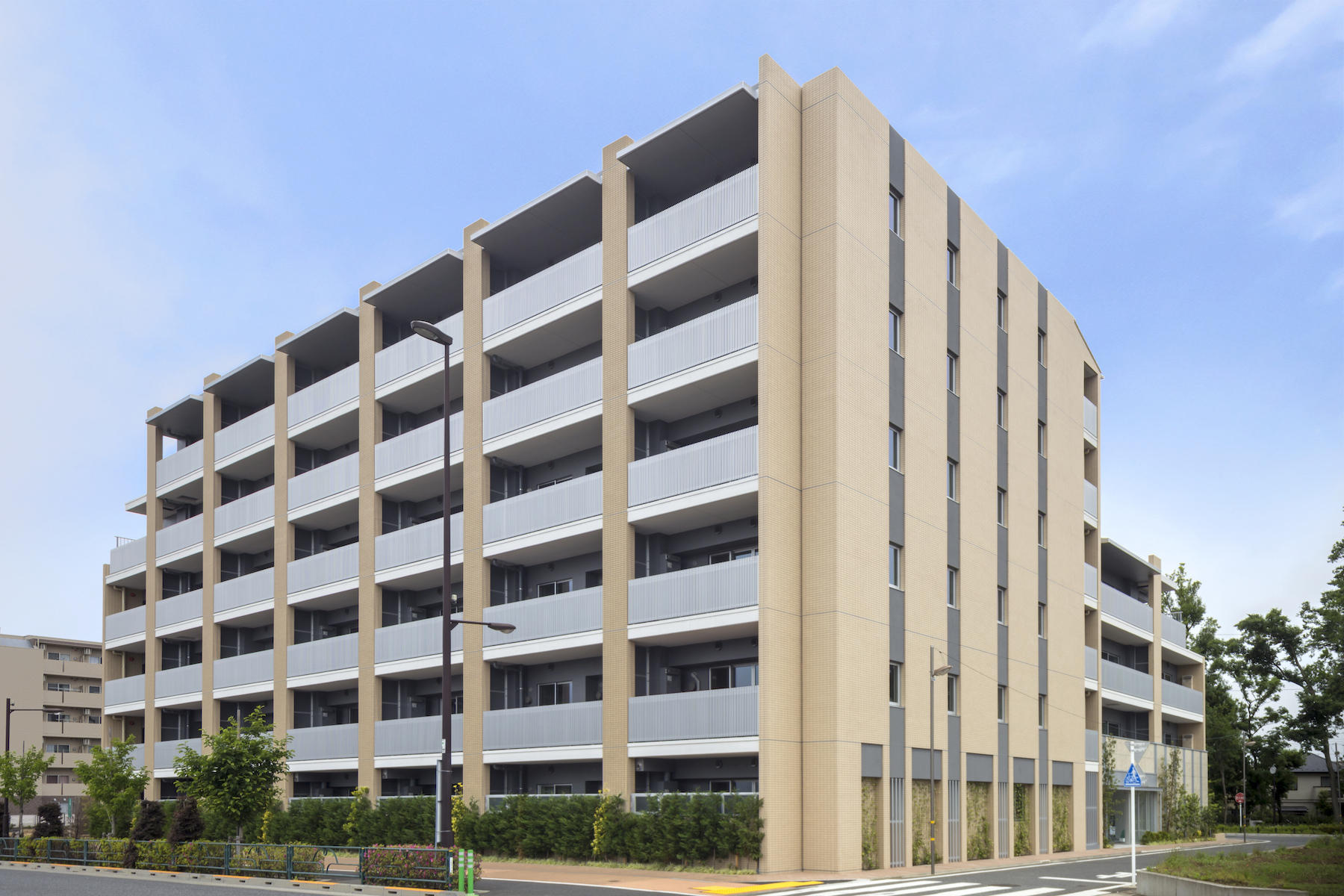 質感あるアースカラーに包まれた外観は、青い空や緑と調和。縦ラインを強調したスタイリッシュなファサードは、街路樹のリズムと呼応しながら、洗練された表情を創り出してます。バルコニーにはアルミの縦格子を採用し、シャープで繊細な印象に。住棟東側の低層部には、街並みとのつながりを意識した壁面緑化を採用。地域のランドマークとして、住まう誇りの源泉として、こだわりを尽くされた外観デザインです。
