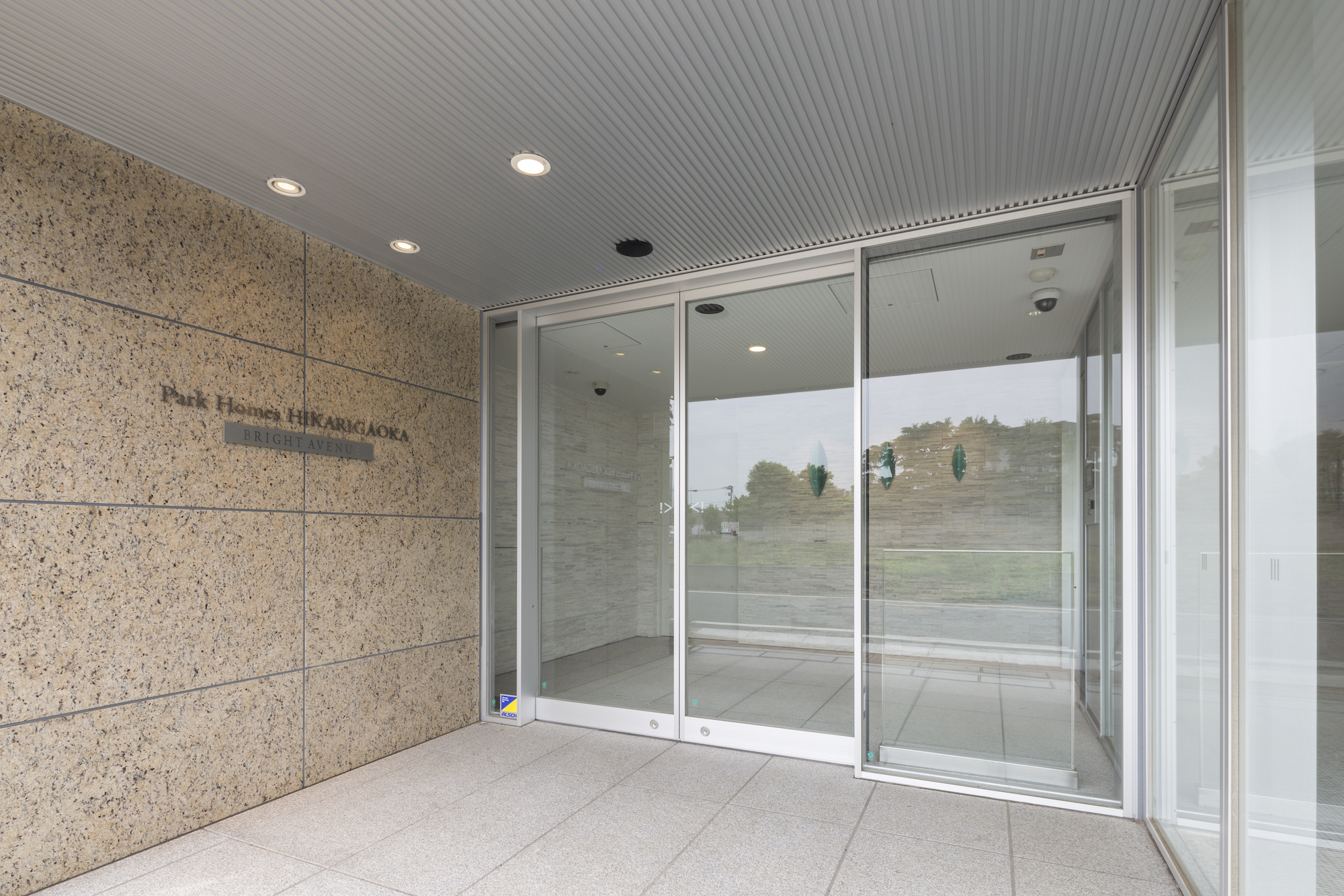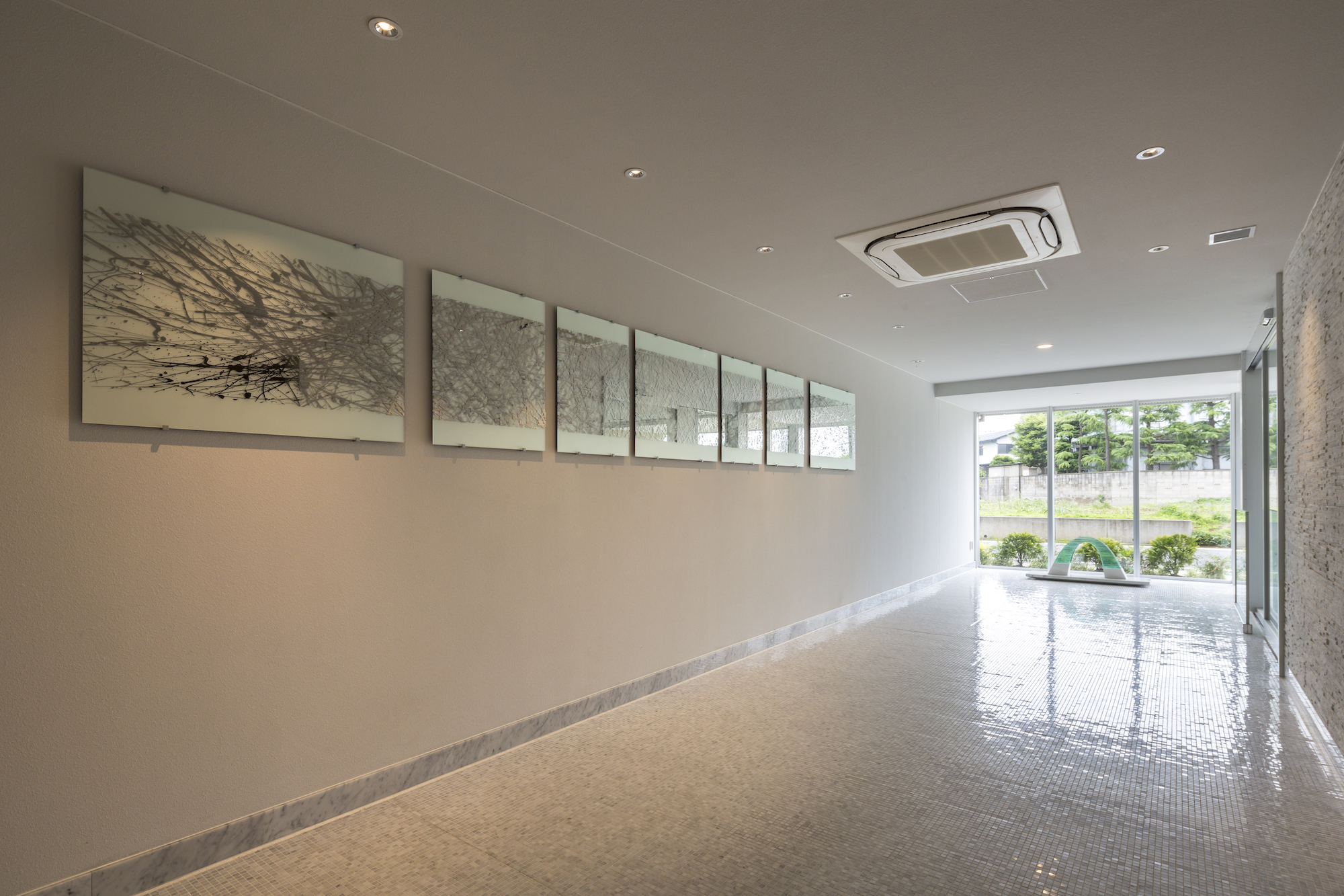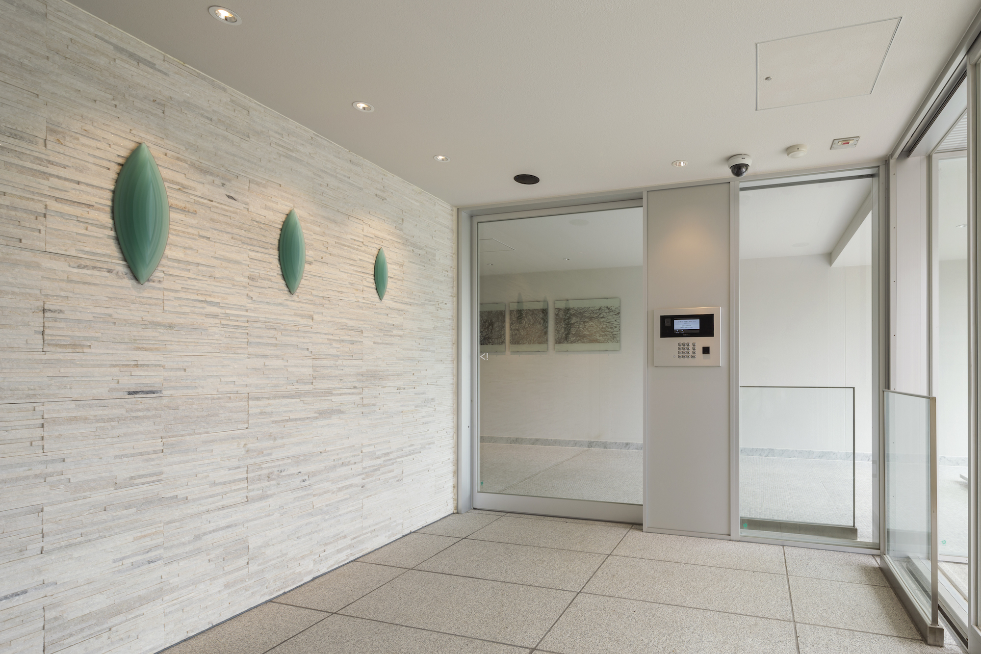 エントランスの側壁面の基壇部は、天然石が貼り込まれ、ステンレスのラインをアクセントに、邸宅の顔にふさわしい品格を漂わせています。エントランスホールと風除室の外部に面した壁面はガラスウォールとし、開放的な表情を演出。そして内部に足を踏み入れれば、その先には、ガラスをモチーフにしたアートやレリーフに彩られた、ギャラリーのようなエントランスホールが広がっています。