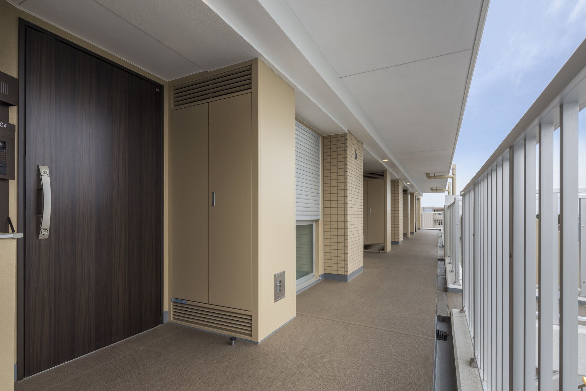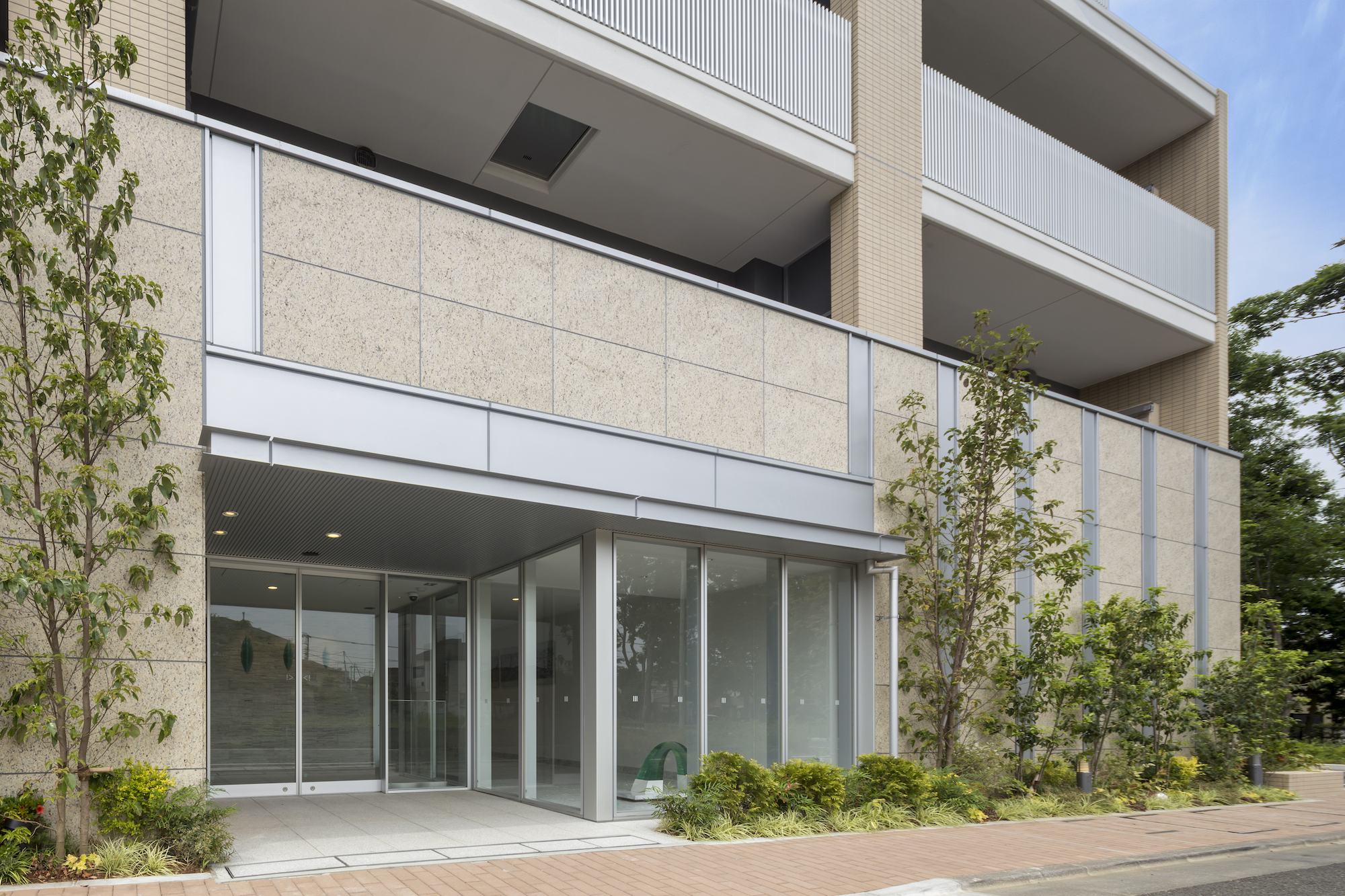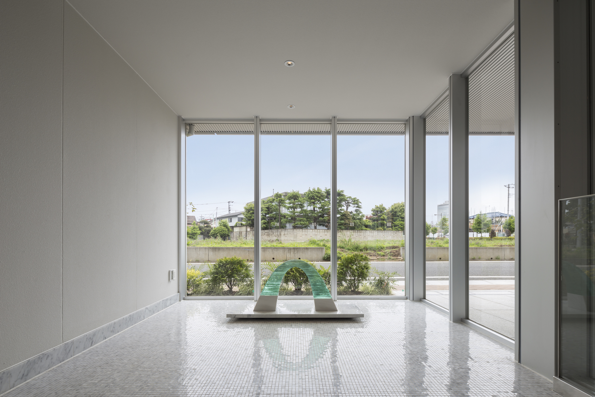 エントランスの側壁面の基壇部は、天然石が貼り込まれ、ステンレスのラインをアクセントに、邸宅の顔にふさわしい品格を漂わせています。エントランスホールと風除室の外部に面した壁面はガラスウォールとし、開放的な表情を演出。そして内部に足を踏み入れれば、その先には、ガラスをモチーフにしたアートやレリーフに彩られた、ギャラリーのようなエントランスホールが広がっています。