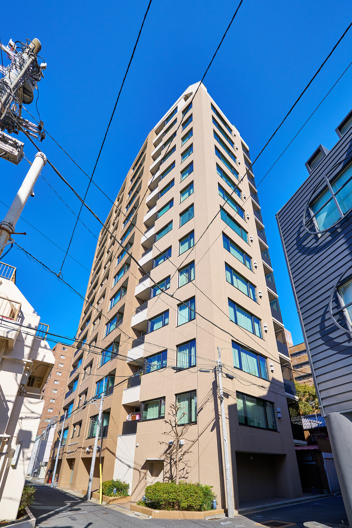 建物の外観は、敷地のほぼ真東に位置する東京大学の安田講堂の塔を意識したアースカラーをベースとし、重厚感と伝統ある趣に。そのフォルムは本郷通りの方向から見ると、細い塔が重なり合うようなデザインで、街に調和する美しい風景を創っています。そして本郷の街並みに相応しい落ち着いた佇まいを演出するのは、美しい風合いをもつこだわりのマテリアル。外観にはスクラッチ調のタイルが採用され、重厚な中にも温もりを感じさせます。エントランス空間全体の床に敷き詰めたライトブラウンの御影石も、バーナー仕上げで自然の質感をもたせ、壁面には糸の微妙な色合いが織りなすファブリックを用いて、心地よい迎賓空間を形づくっています。