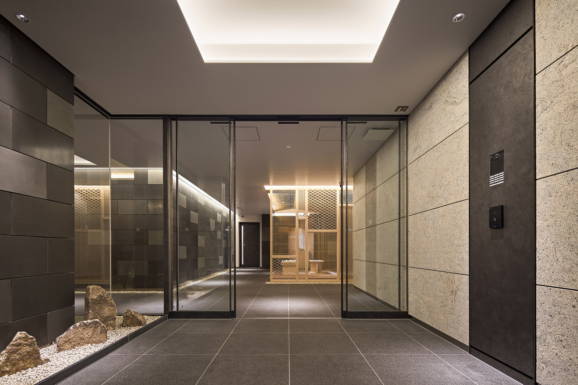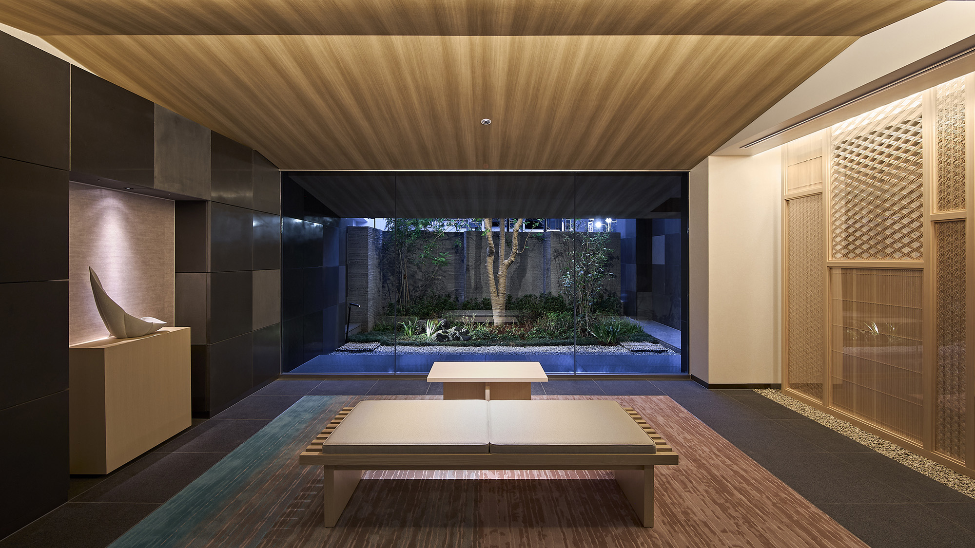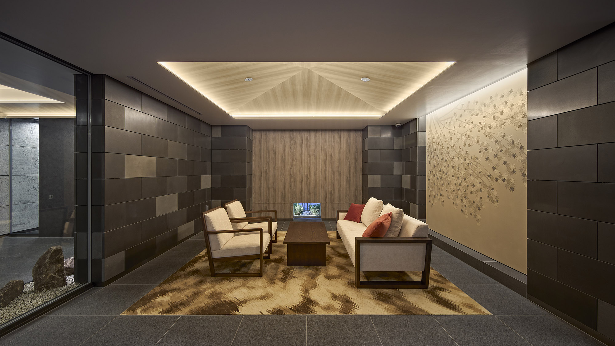 エントランスは邸宅の風格を醸す迎賓の意匠で、住まう人とゲストをやすらぎの私邸へと誘います。エントランスを抜けると、暮らしの中で季節を愛でる「紅葉ラウンジ」がお目見え。秋をテーマに、紅葉模様の壁や紅葉に馴染む色彩の木目と絨毯が採用されており、茶室を思わせるような静謐な空間です。さらに、奥には桜の格子が施された「桜ラウンジ」が備わり、目の前の中庭では四季の変化を映し出します。こちらは春をテーマに、桜色の絨毯とクロス、明るい色合いの木目天井と格子が採用されたのどかな空間。自然石の床や壁際の玉砂利が、中庭との一体感を演出しています。