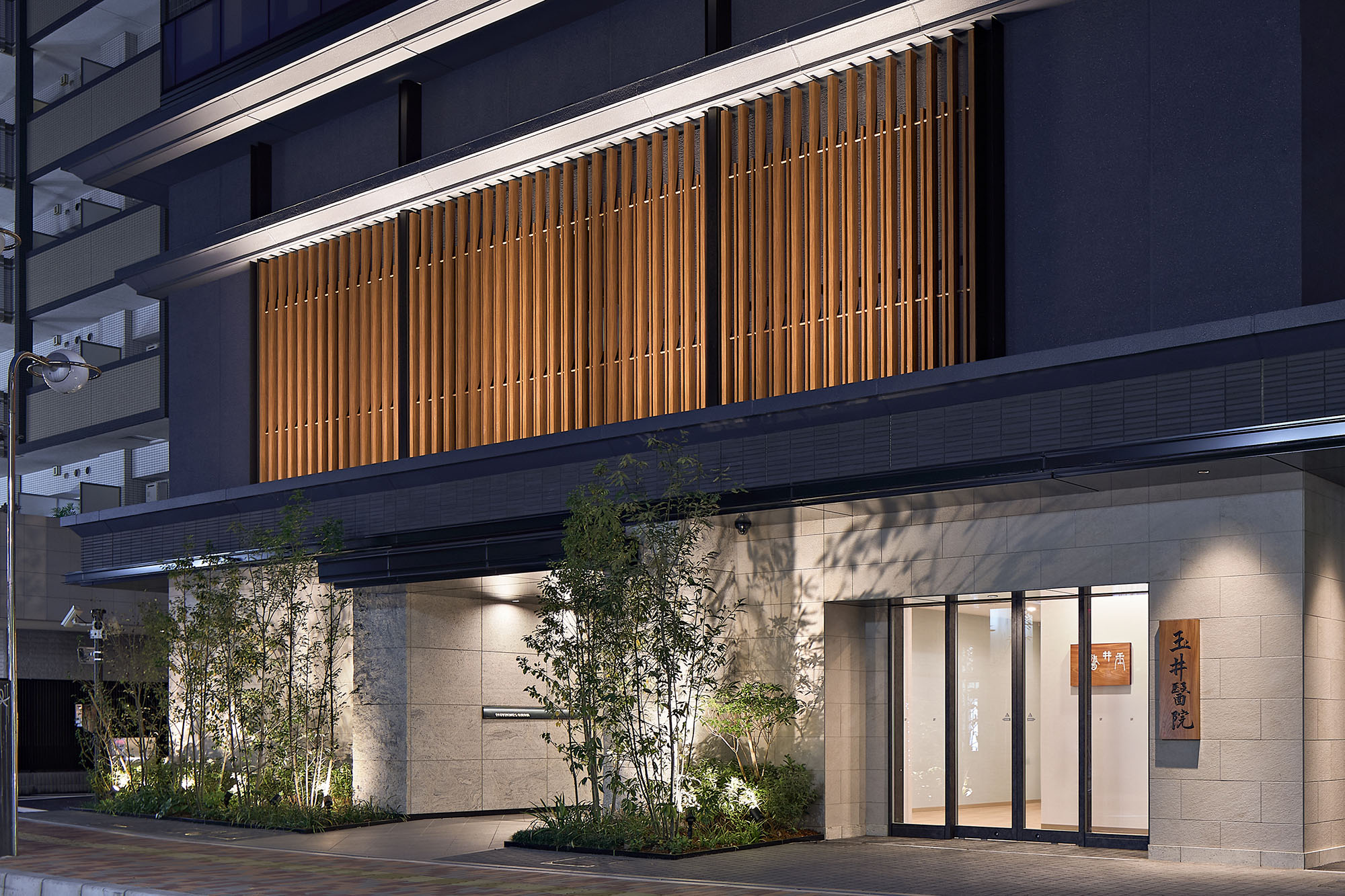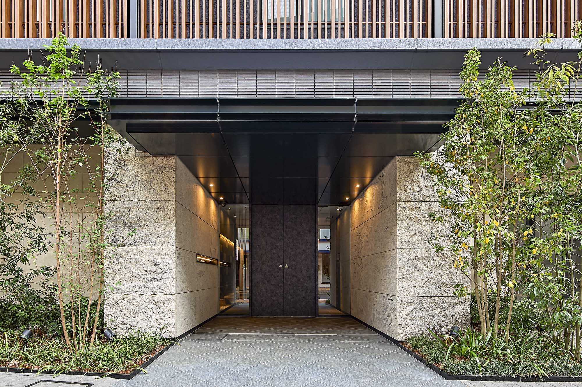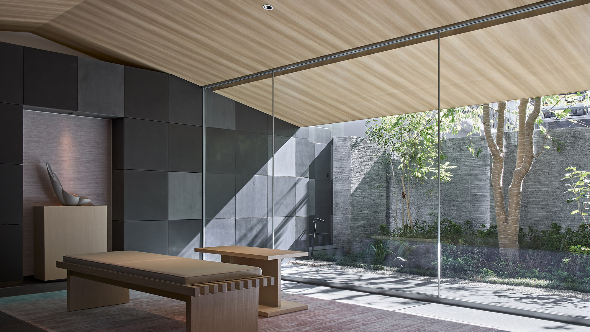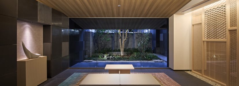 エントランスは邸宅の風格を醸す迎賓の意匠で、住まう人とゲストをやすらぎの私邸へと誘います。エントランスを抜けると、暮らしの中で季節を愛でる「紅葉ラウンジ」がお目見え。秋をテーマに、紅葉模様の壁や紅葉に馴染む色彩の木目と絨毯が採用されており、茶室を思わせるような静謐な空間です。さらに、奥には桜の格子が施された「桜ラウンジ」が備わり、目の前の中庭では四季の変化を映し出します。こちらは春をテーマに、桜色の絨毯とクロス、明るい色合いの木目天井と格子が採用されたのどかな空間。自然石の床や壁際の玉砂利が、中庭との一体感を演出しています。