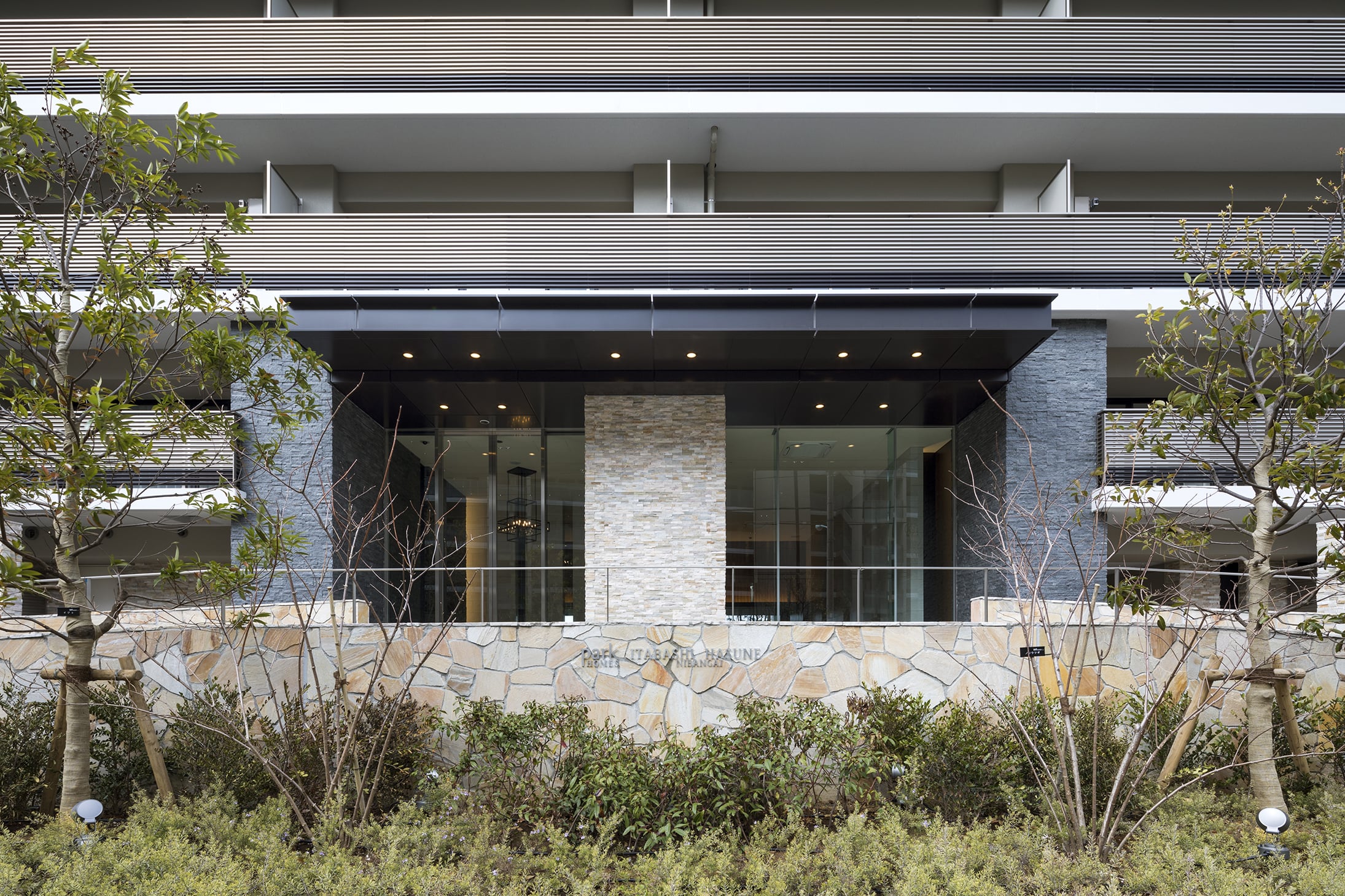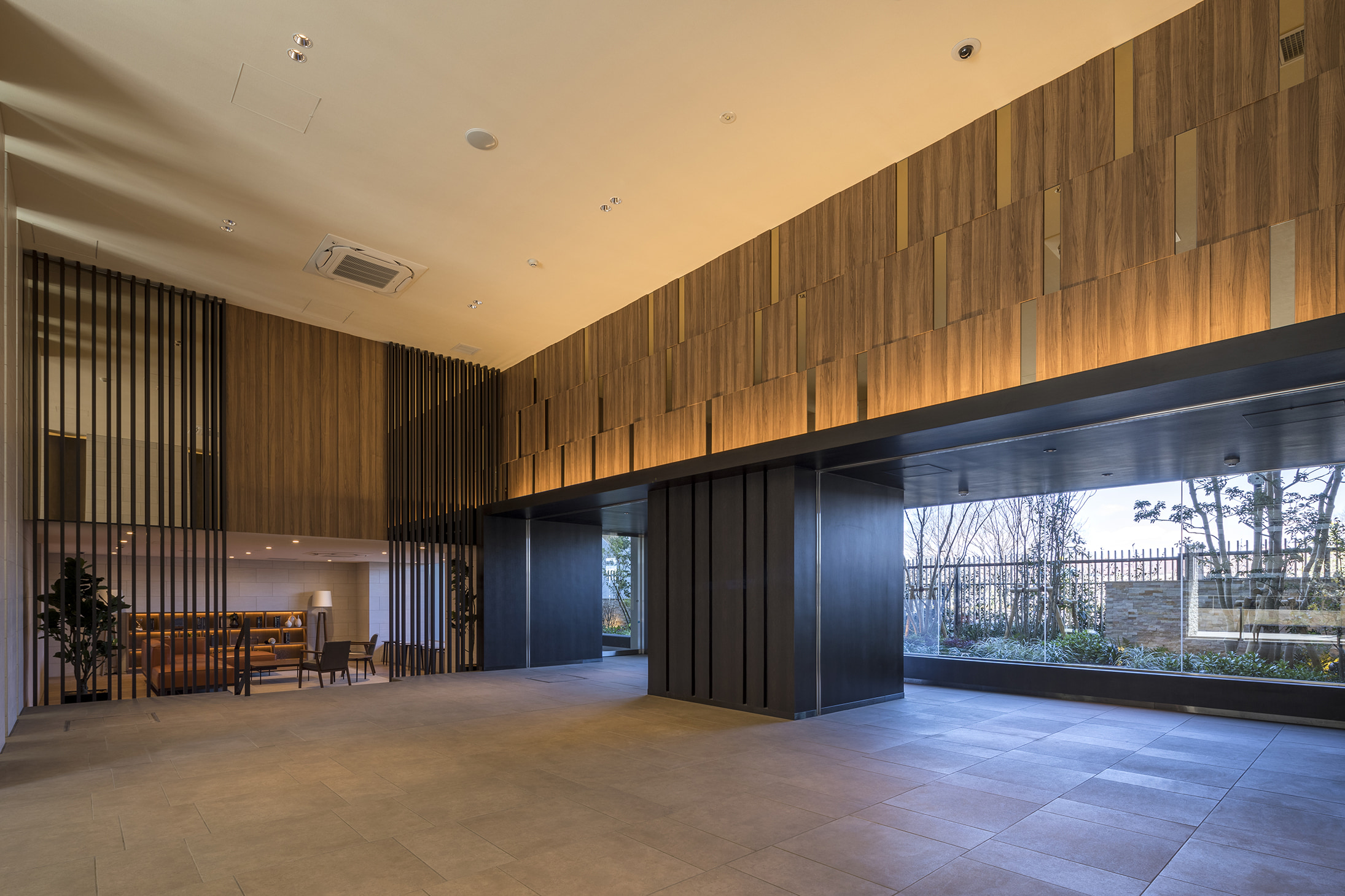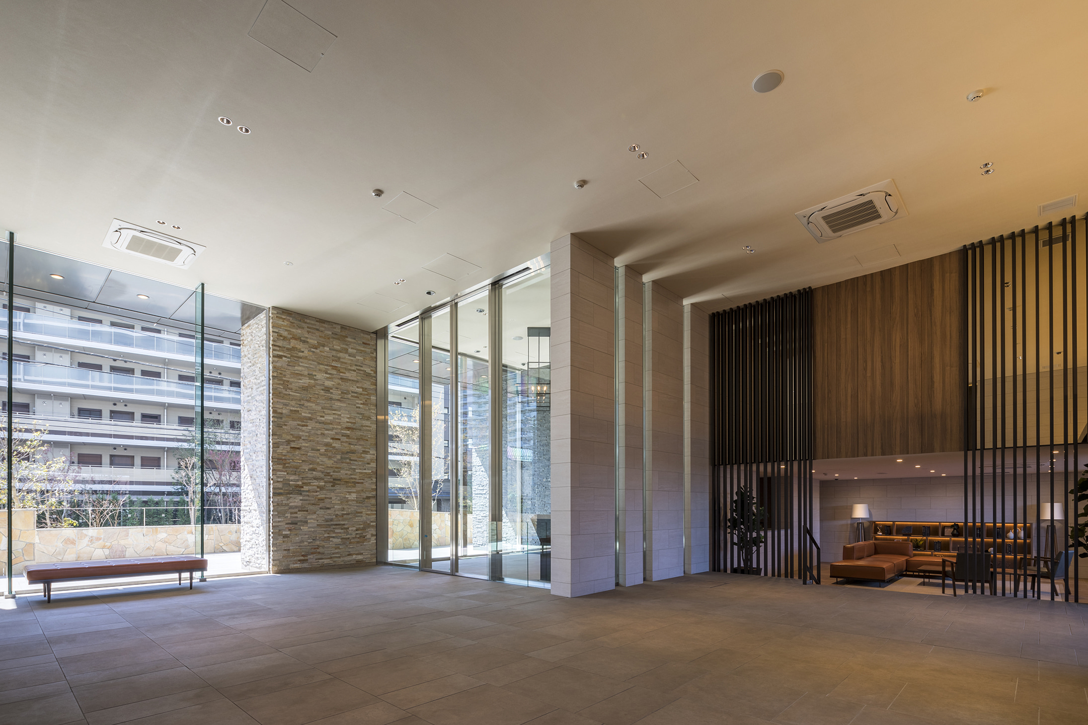 デザインコンセプトは、ゆったりとした温かみを表現した「Slow&Harmony」。外観は一番街と調和する、温かみのあるアースカラーで、南面左部にはベイウィンドウを採用、縦に伸びるマリオンやホワイトのグリッドラインで建物全体にリズム感を与えています。エントランス部分には、石壁などの自然素材による柔らかな印象とともに、ワイドなガラス張りと重厚な庇でスケールに相応しい「品格」を表現。曲線を描くスロープのアプローチを抜けた先には、二層吹抜けの上質な迎賓空間が広がります。