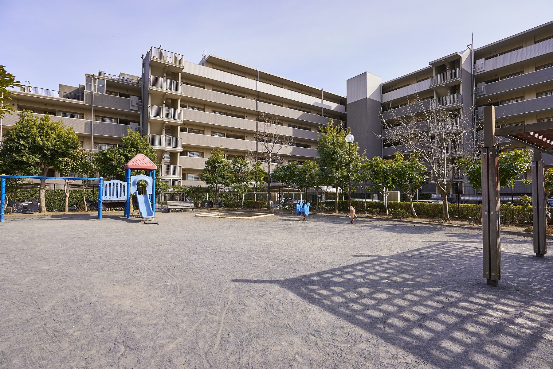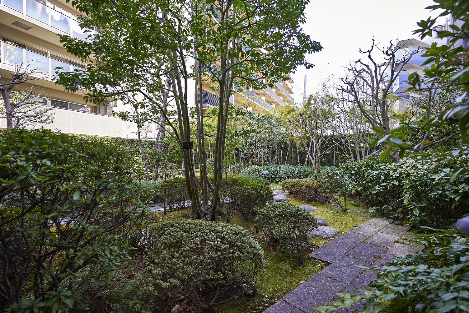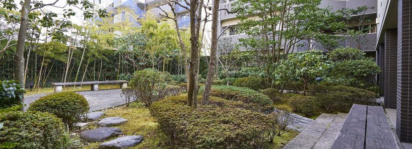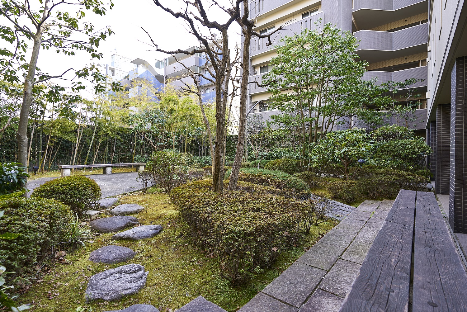 2階の“離れ”部分には、雨の日の子供の遊び場や各種会合など多目的に利用できる、約100㎡のゆとりある「集会室兼キッズルーム」が用意されています。また、屋外にも約480㎡の提供公園が隣接。子供達がのびのびと遊べる環境が広がっています。敷地周縁は豊かな緑で包み込まれ、スモールパティオやプライベートコートといった景観に贅を凝らした庭園も随所に設置されています。プライベートコートにはベンチが配され、踏み石などで歩く楽しさも演出。居住者同士のコミュニケーションが楽しめるスペース、居住者が安らげる憩いの空間が備わっています。