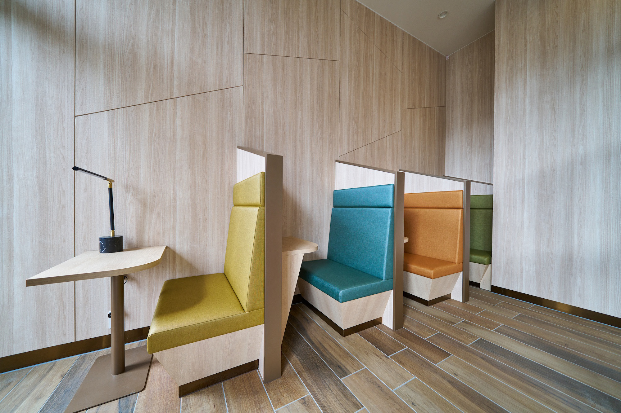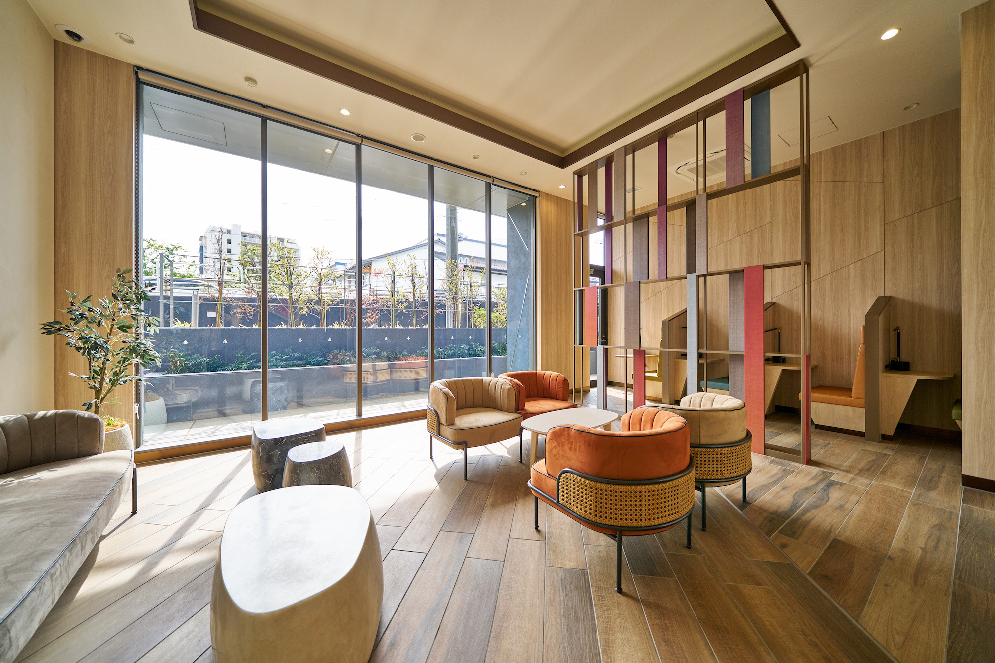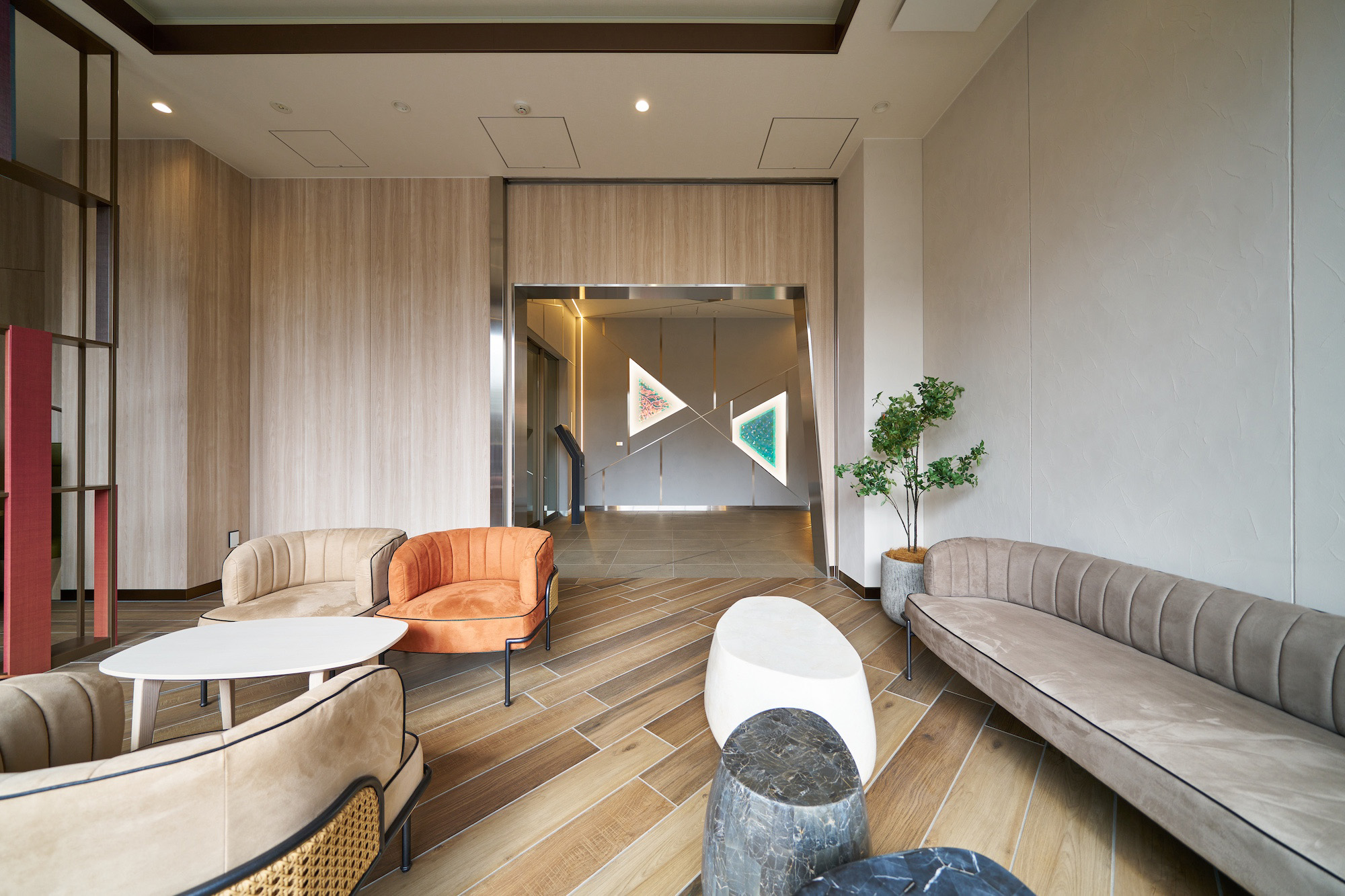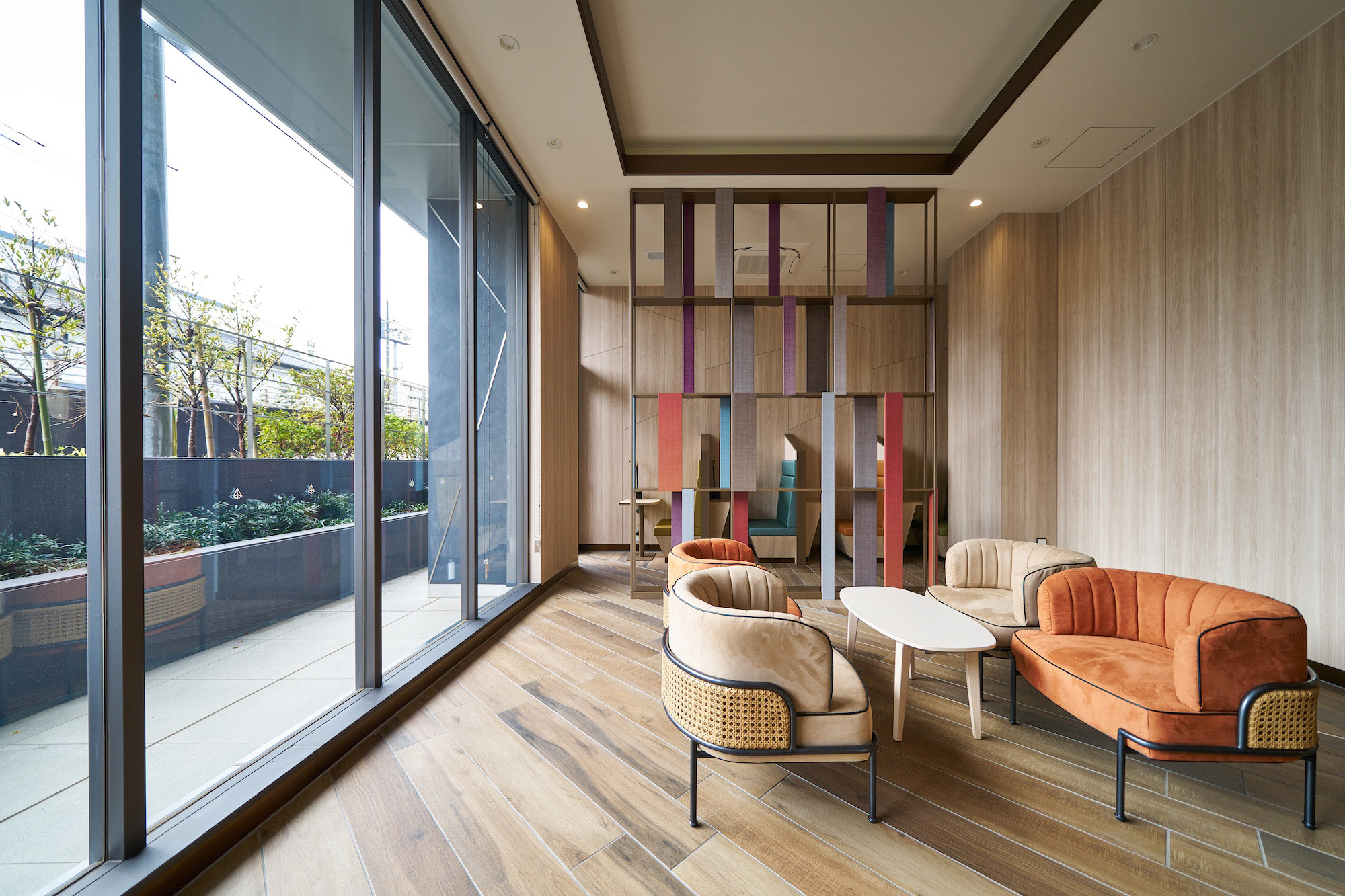 エントランスをくぐると広がるのは、ライン照明が縁取る折り上げ天井を施した、伸びやかなエントランスホール。天井と壁、床にもライン照明を配置することで、プリズムから光が広がっていく印象を演出しています。ラウンジは、プリズムが通った光が反射して虹色に輝いている様子をカラフルなアートや共用部の家具で再現。ブース席も整えられており、歓談や読書、リモートワークなど、サードプレイスとしてさまざまな活用ができる便利な空間です。