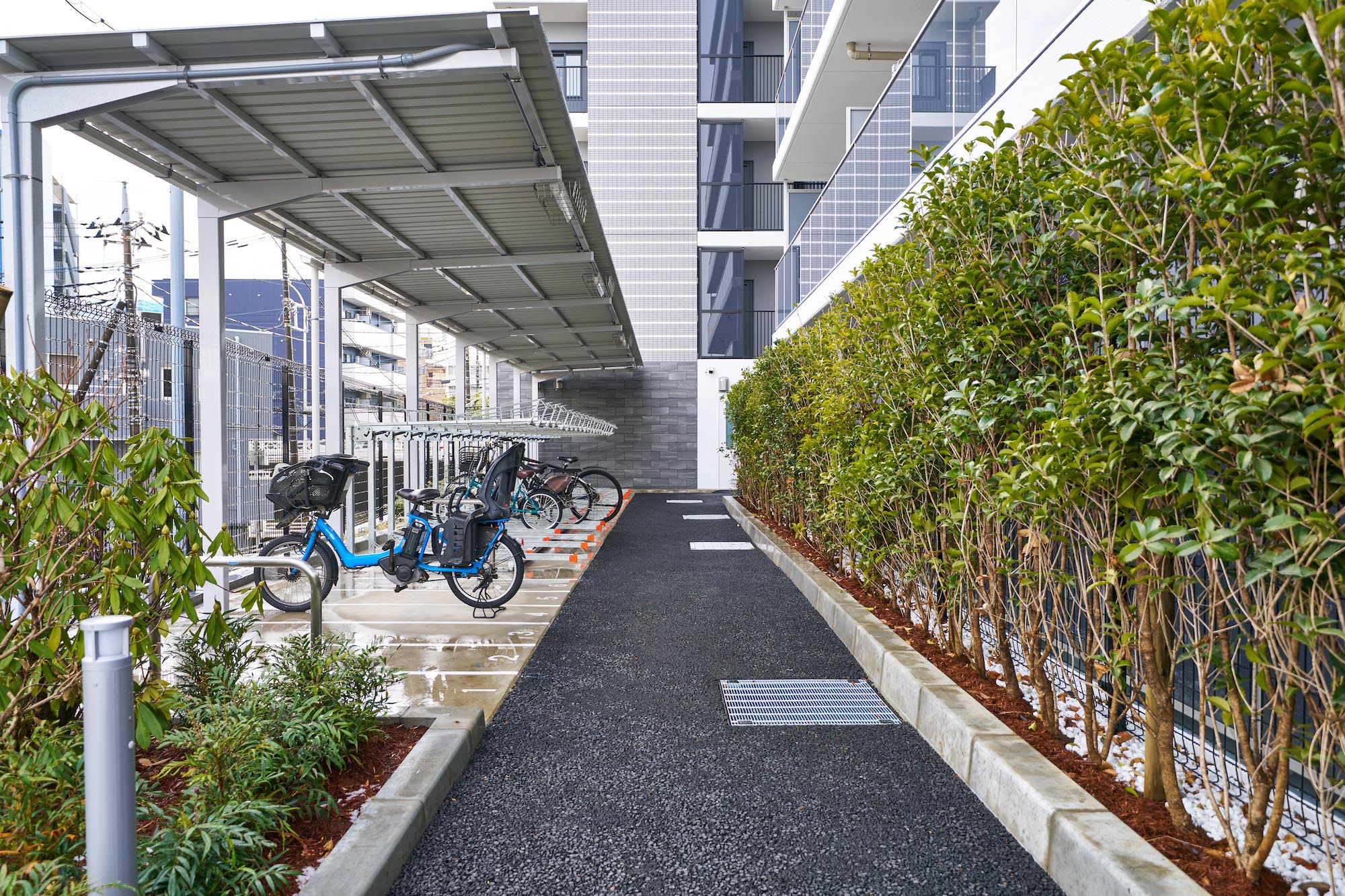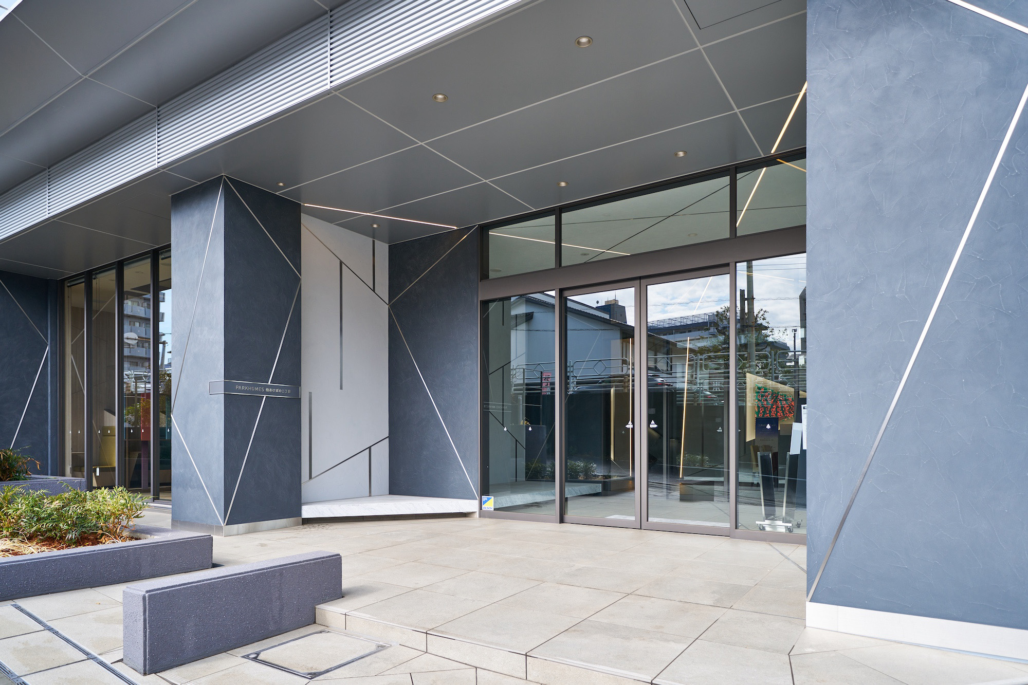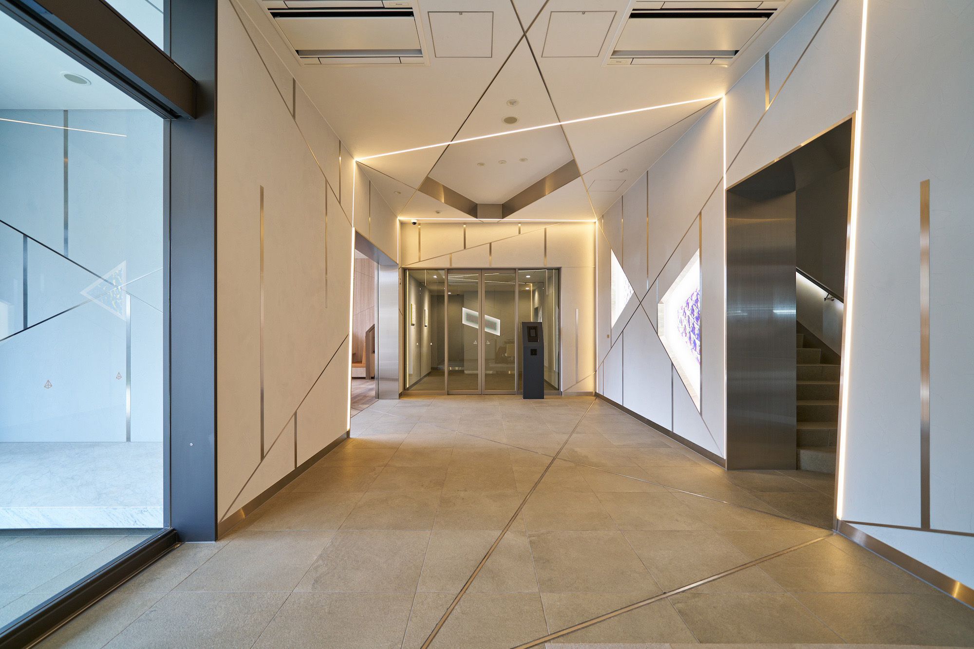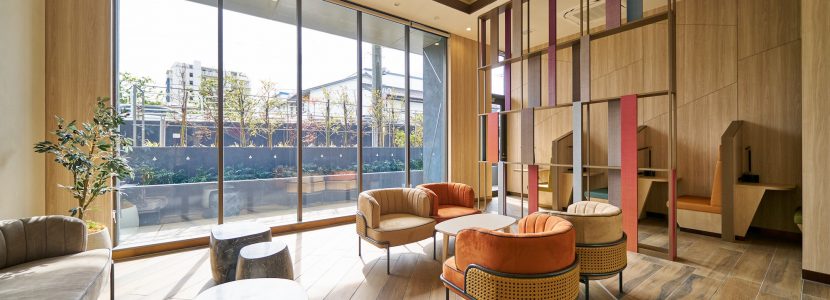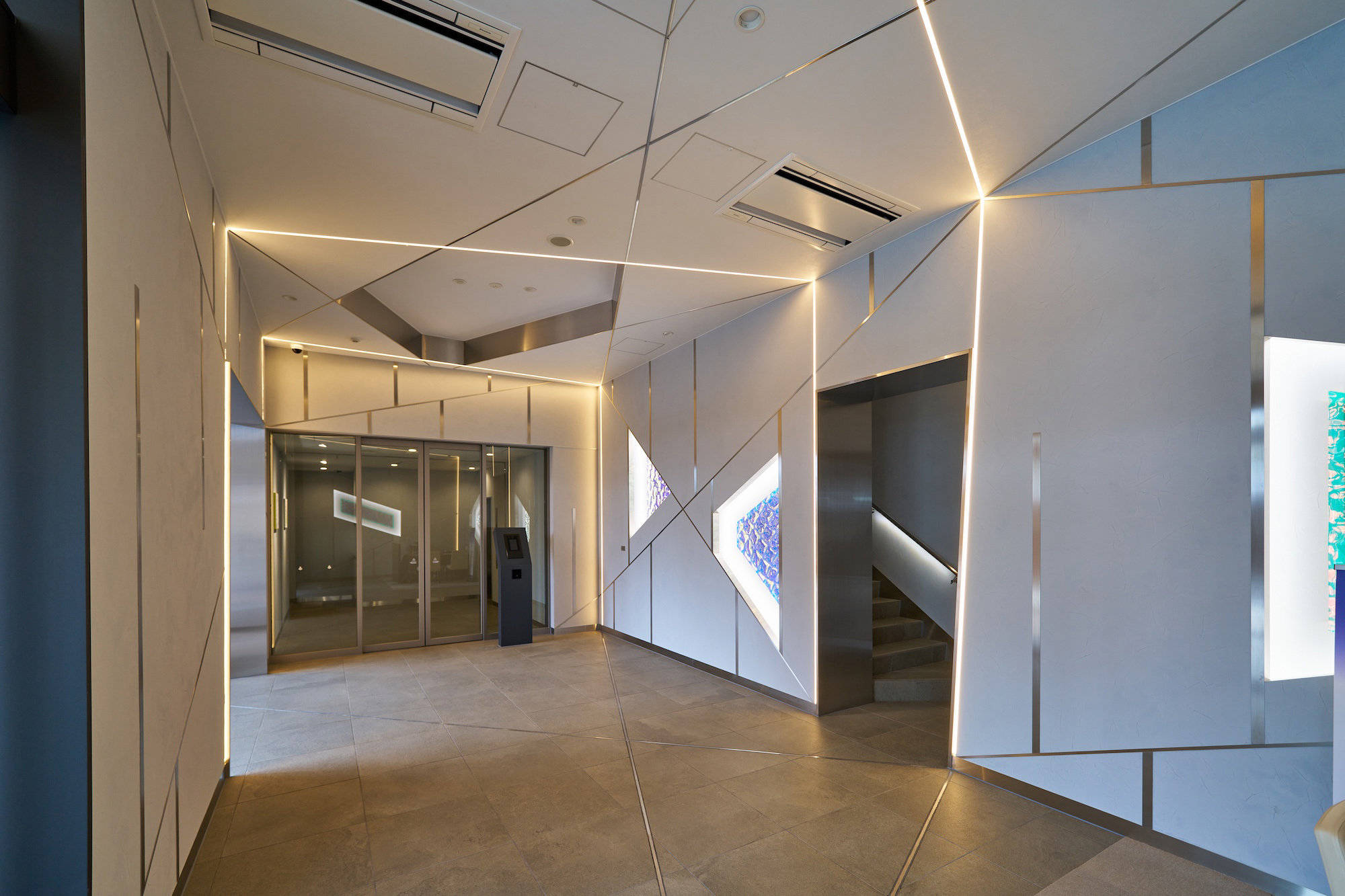 エントランスをくぐると広がるのは、ライン照明が縁取る折り上げ天井を施した、伸びやかなエントランスホール。天井と壁、床にもライン照明を配置することで、プリズムから光が広がっていく印象を演出しています。ラウンジは、プリズムが通った光が反射して虹色に輝いている様子をカラフルなアートや共用部の家具で再現。ブース席も整えられており、歓談や読書、リモートワークなど、サードプレイスとしてさまざまな活用ができる便利な空間です。