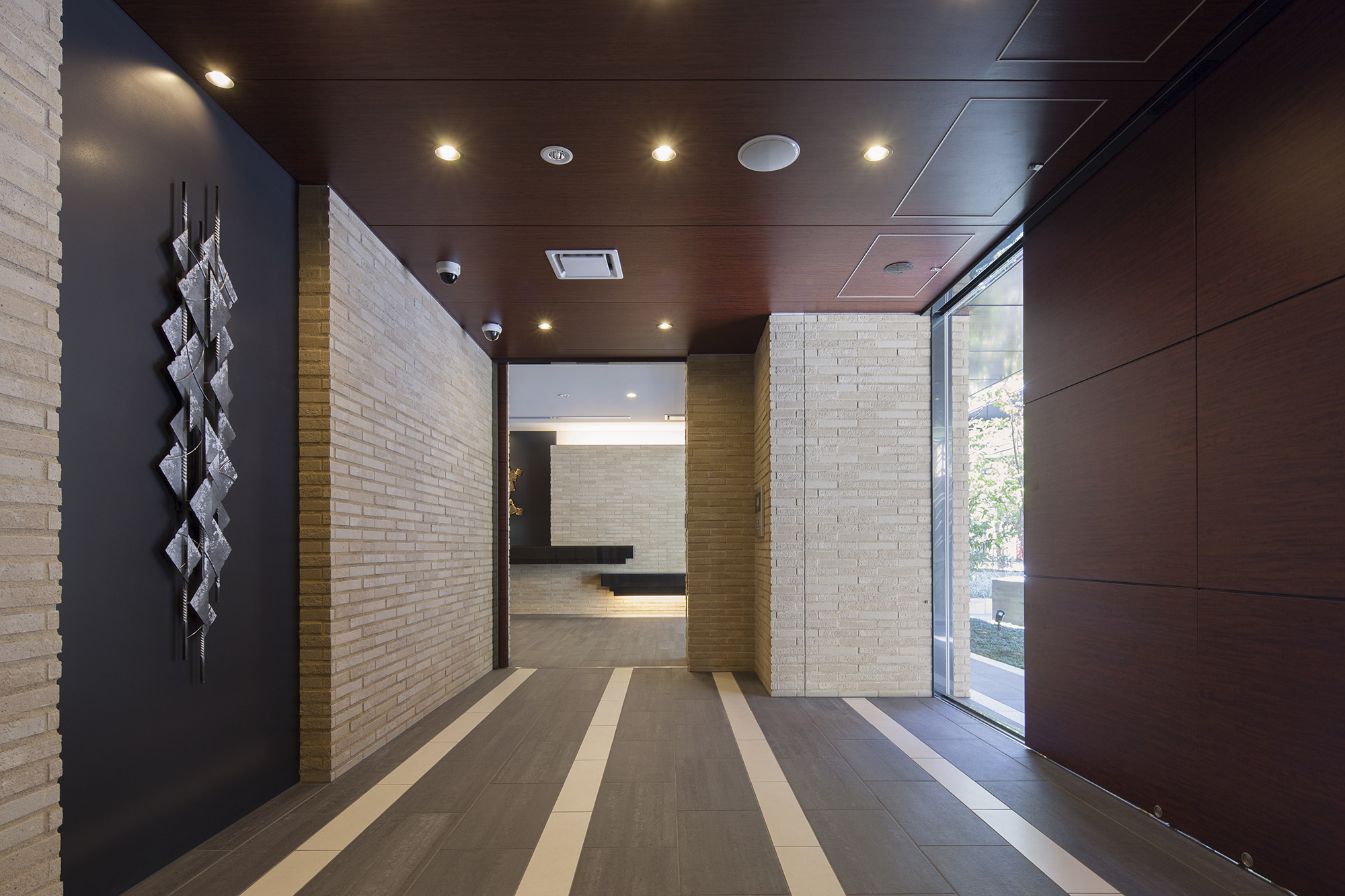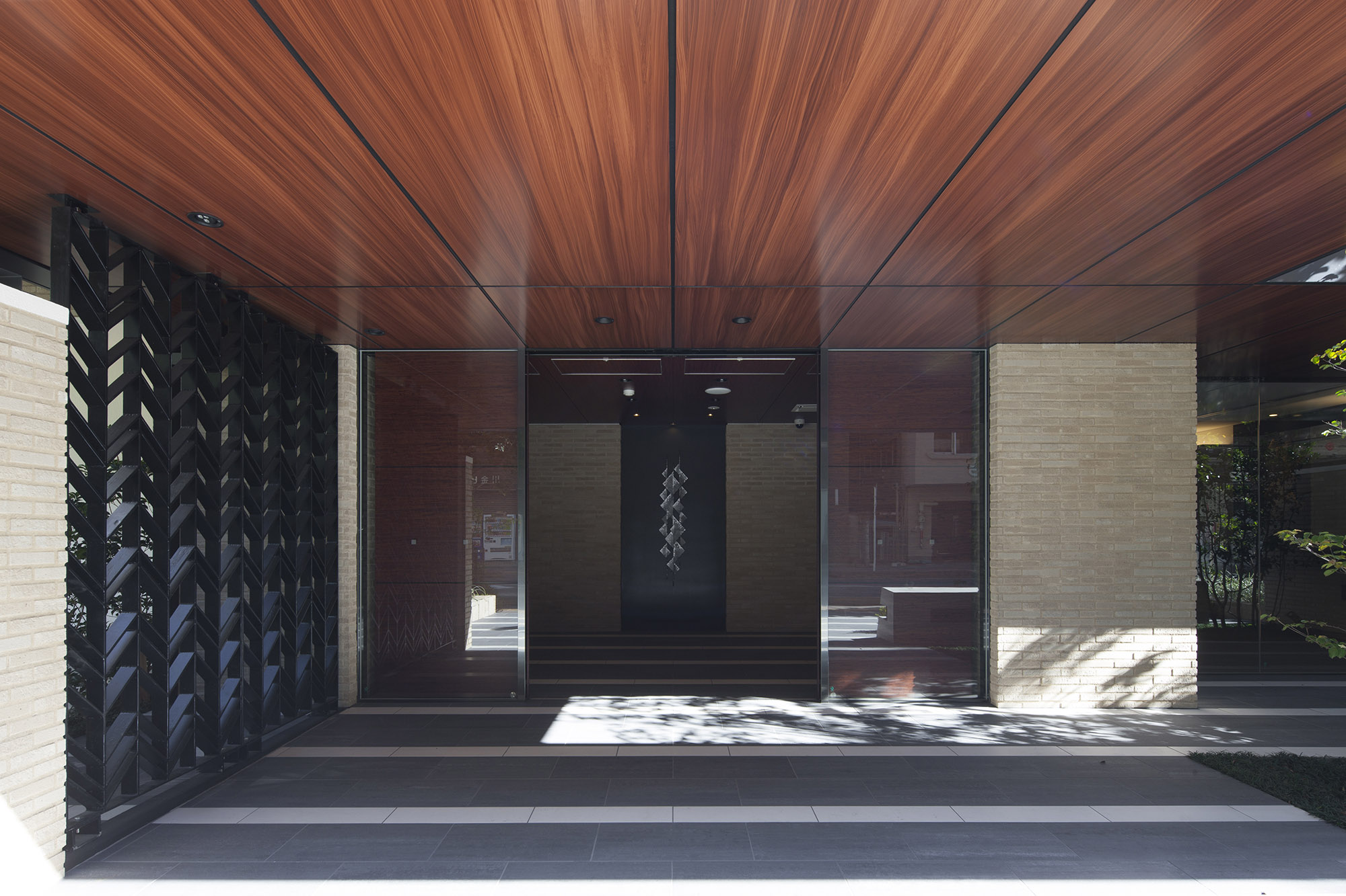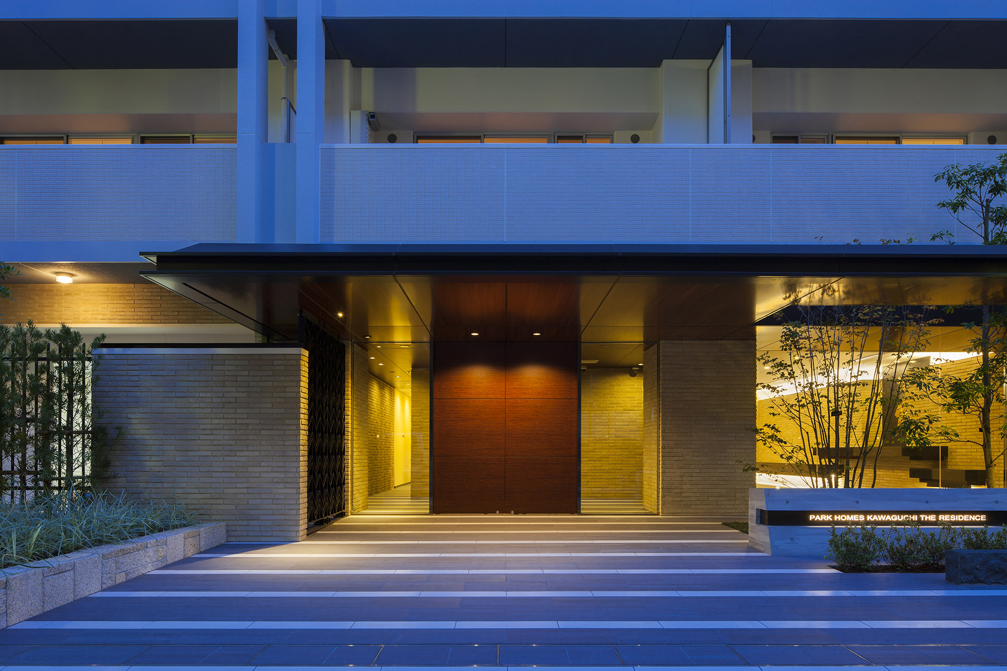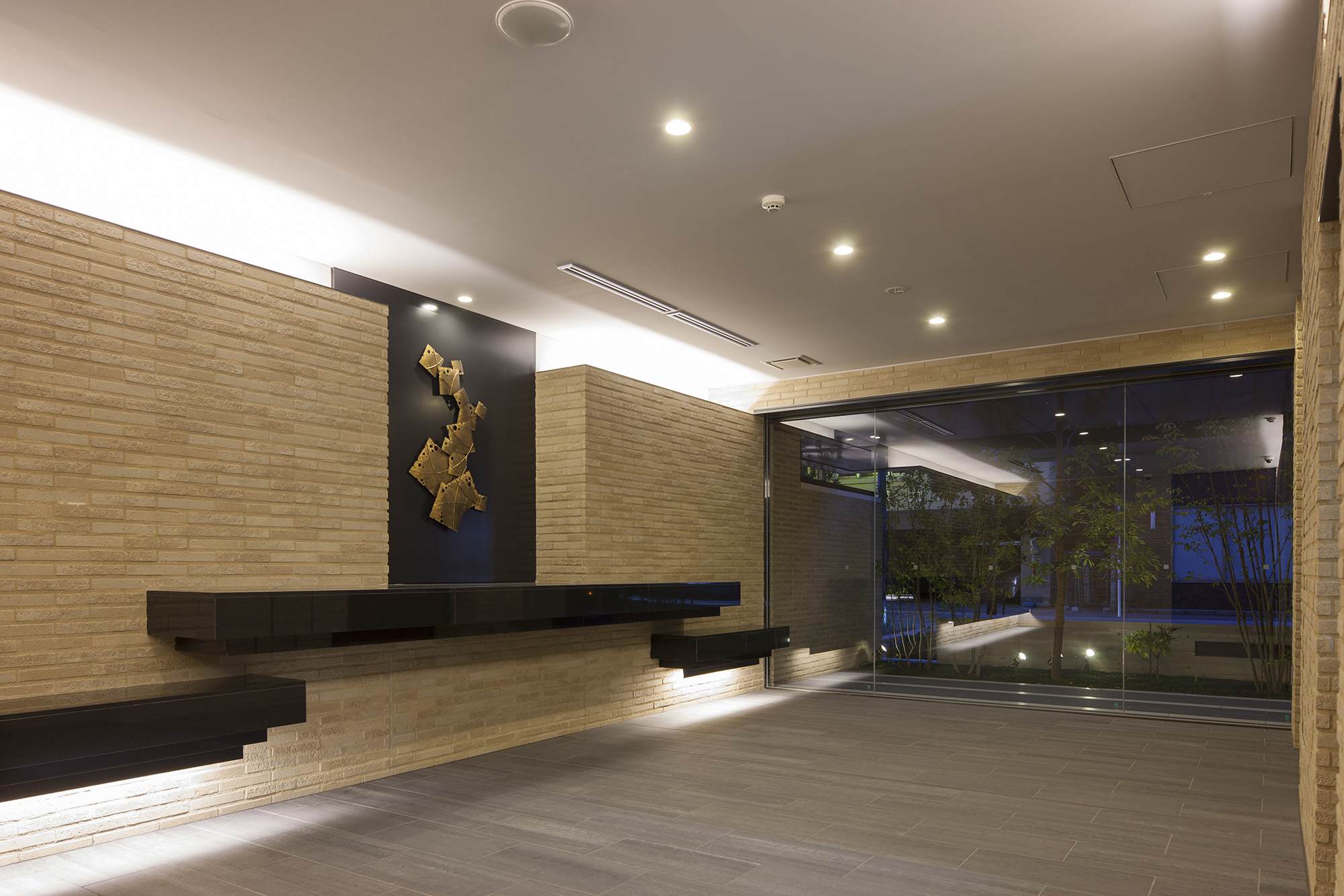 全幅約11.2mの堂々とした広さのエントランスには、約4.5mの奥行きがある大庇が設けられています。大庇の一部を切り取ることで、植栽の高木がその庇を突き抜ける形で立ち上がり、豊かな緑と住まいが協調する優美な趣きを創出。エントランスの庇裏は木調仕上げ、ドアも木調にすることでナチュラルな質感も大切にしています。エントランス左手には川口の歴史を偲ばせるロートアイアンのブラインドパネルを採用。さらに両脇にタイルの壁を配して、格調ある雰囲気を演出。ONとOFFを切り替え、やすらぎに満ちた「私」の時間へと誘う優雅な迎賓の世界が広がります。風除室とエントランスホールには、川口の歴史を汲み取ったオブジェを配置。川口の街の原風景を表現した風除室の「炎の街」、川口の過去から現在へ、そして輝く未来へとつながる時間の流れを表現したエントランスホールの「明日へ」。いずれも、鋳物の街として歴史を重ねてきた川口へのオマージュとなる作品で、訪れる方々を癒す落ち着いた空間を創出しています。