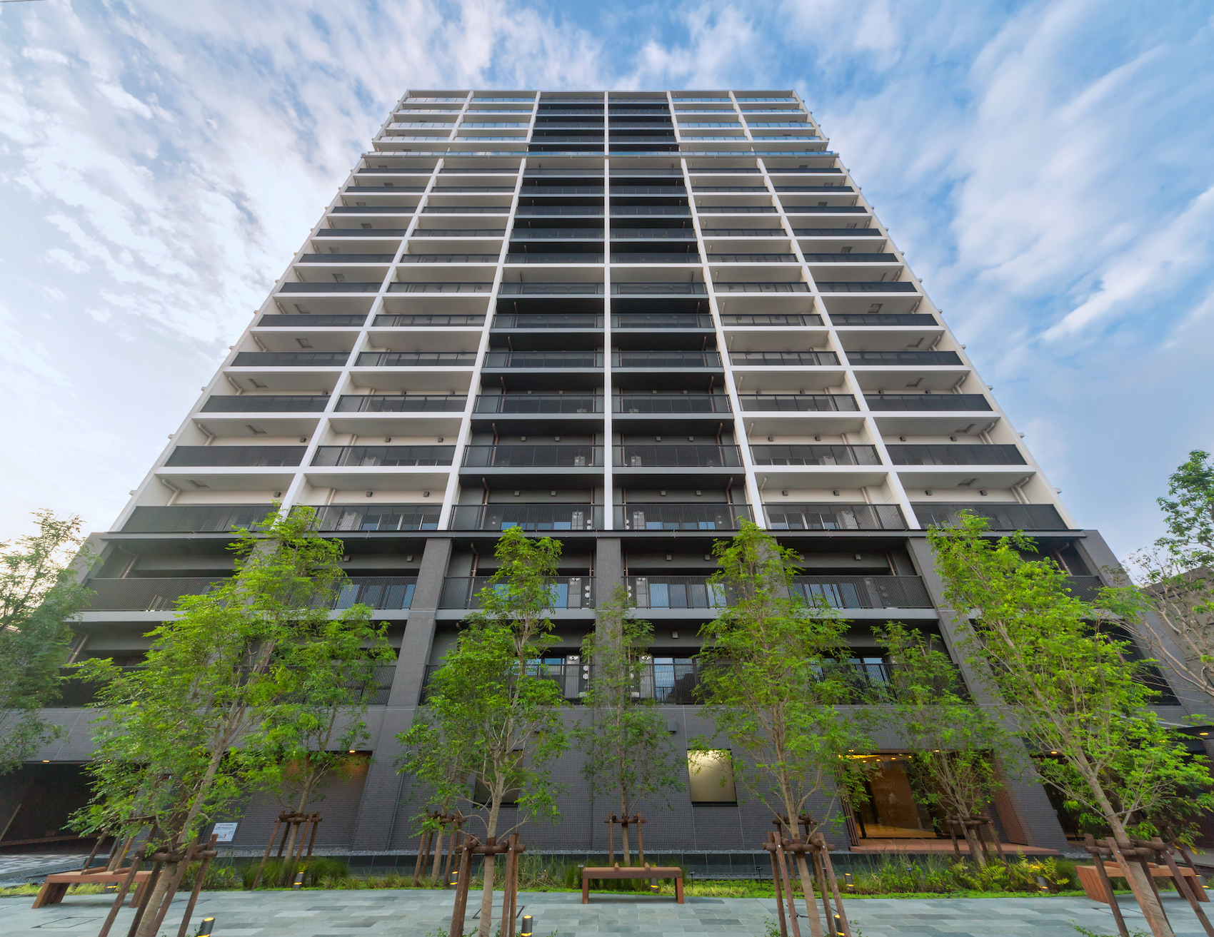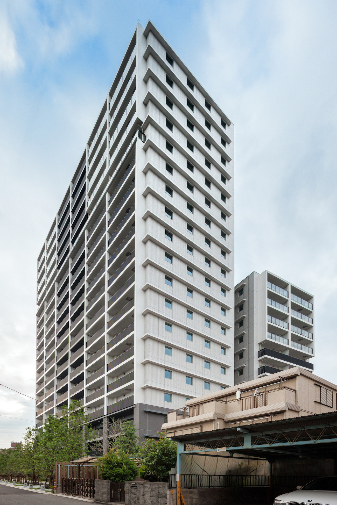 川崎大師の歴史ある石灯籠をモチーフに取り入れ、フォルムを造形。北側立面の切り妻屋根や縦格子など、日本建築の様式も意匠に活かしています。中層部までのバルコニー手摺は、縦格子を採用したスリット形状。上層部には、灯籠のほのかな灯りをモチーフに透明ガラスが用いられ、「静寂」と「上昇感」と「和」を表現しています。普遍的な美しさをたたえながら、都市の感性にも響く洗練された外観デザインです。