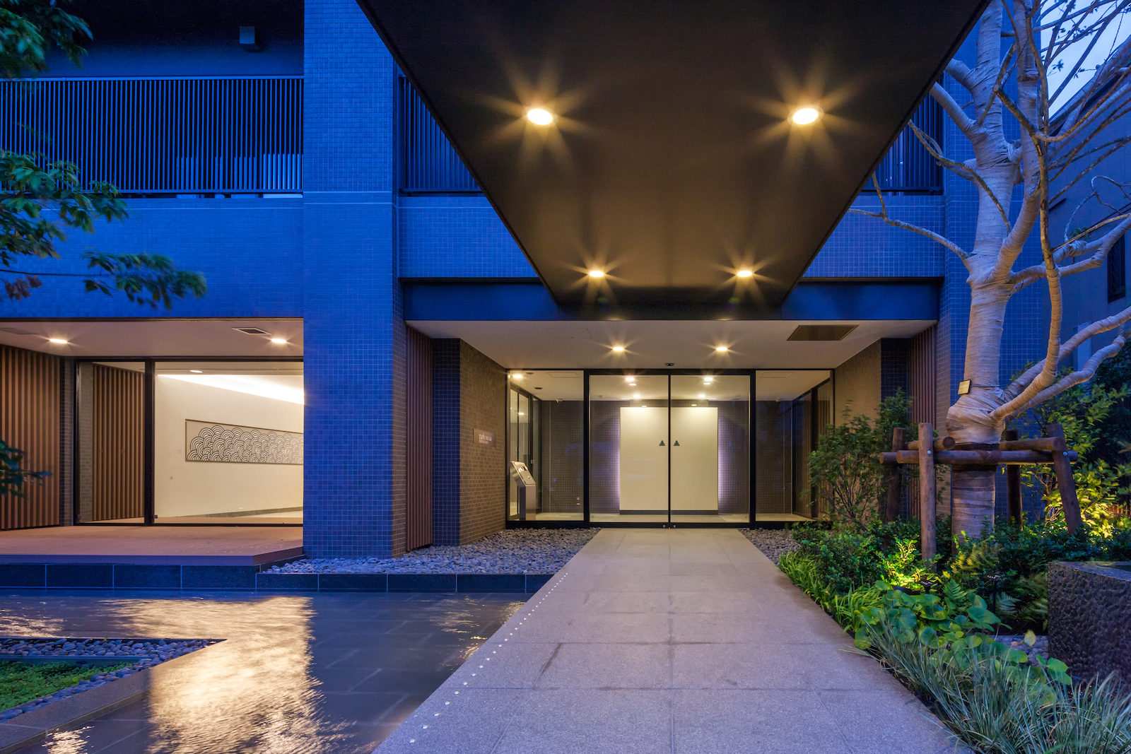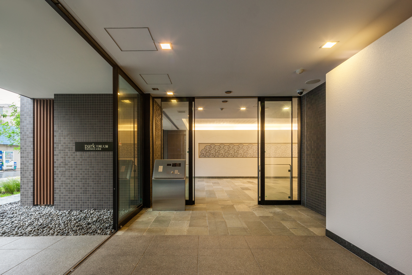 光を受けてきらめく水庭越しに広がるのは、静寂のエントランスホール。港町として栄えてきたかつての川崎の姿をイメージしたこの空間は、日本の伝統的なデザインを進化させ、幅広い分野で活躍するアーティストの高橋理子氏が手がけています。壁を飾るのは、平安や繁栄の意味を持つ日本伝統の「青海波」を継承した文様で、住まう家族と訪れる人の幸せが繰り返し連なるようにという願いが込められています。