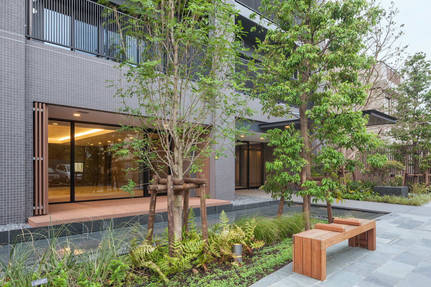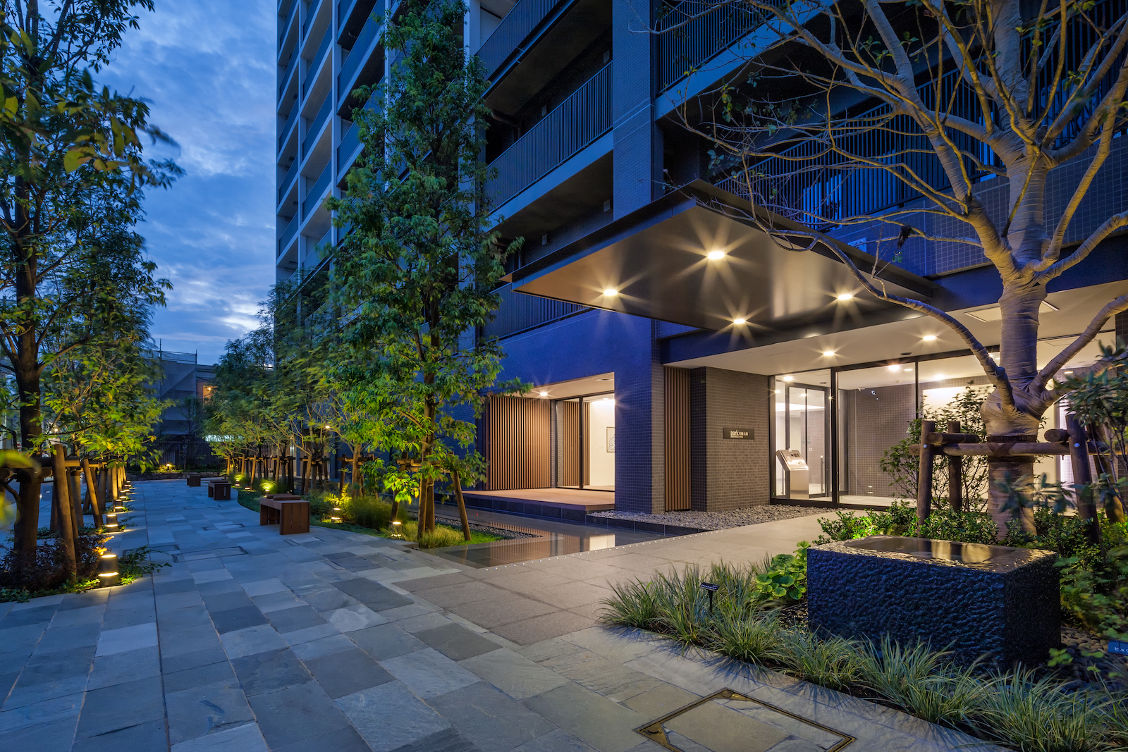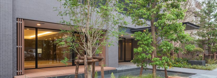 エントランスは、賑わいのある表参道から奥まった位置にあります。緑豊かな「通り庭」や潤い溢れる「水庭」も配され、街並みとの共存を考慮しつつ、程よい距離感を保った配棟計画で、暮らしを育むにふさわしい落ち着きが確保されています。