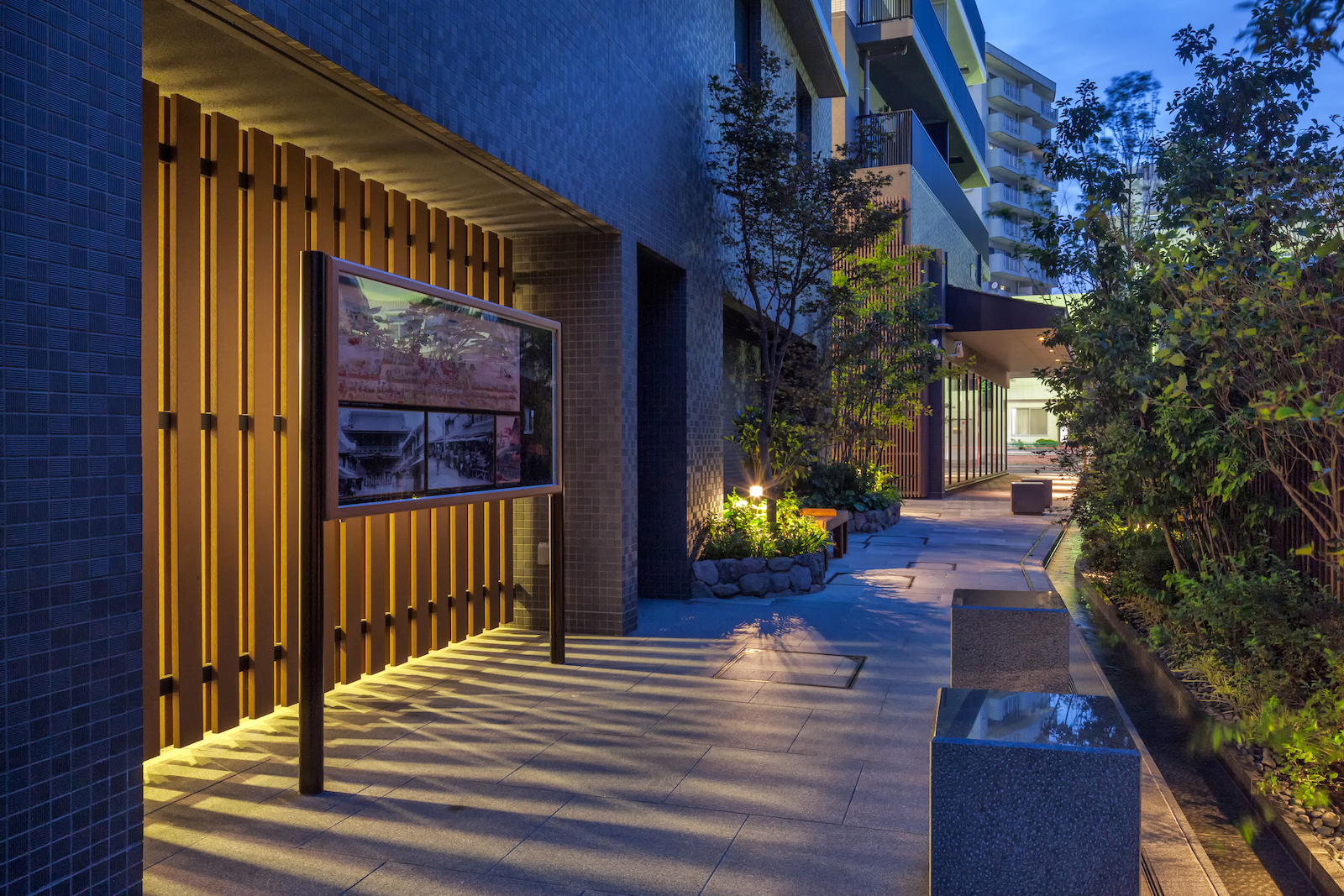 緑や水の流れに誘われるようにして、賑わいの表参道から、ゆったりと暮らしを営むためのエリアへ。ソトとウチとが程よい距離感を保ちながら、ゆるやかにつながる空間です。南北を貫く水路や、 水琴窟の情趣あふれる音色が癒しの世界へいざないます。
