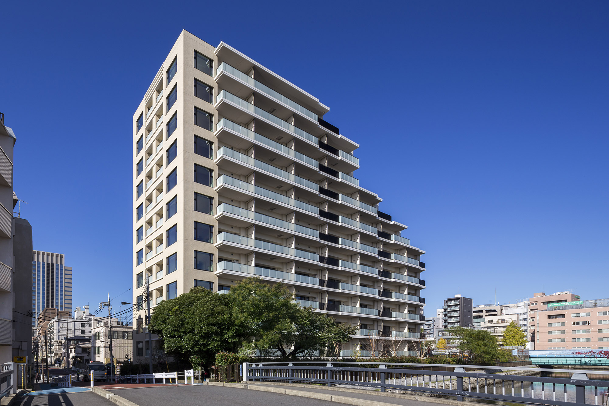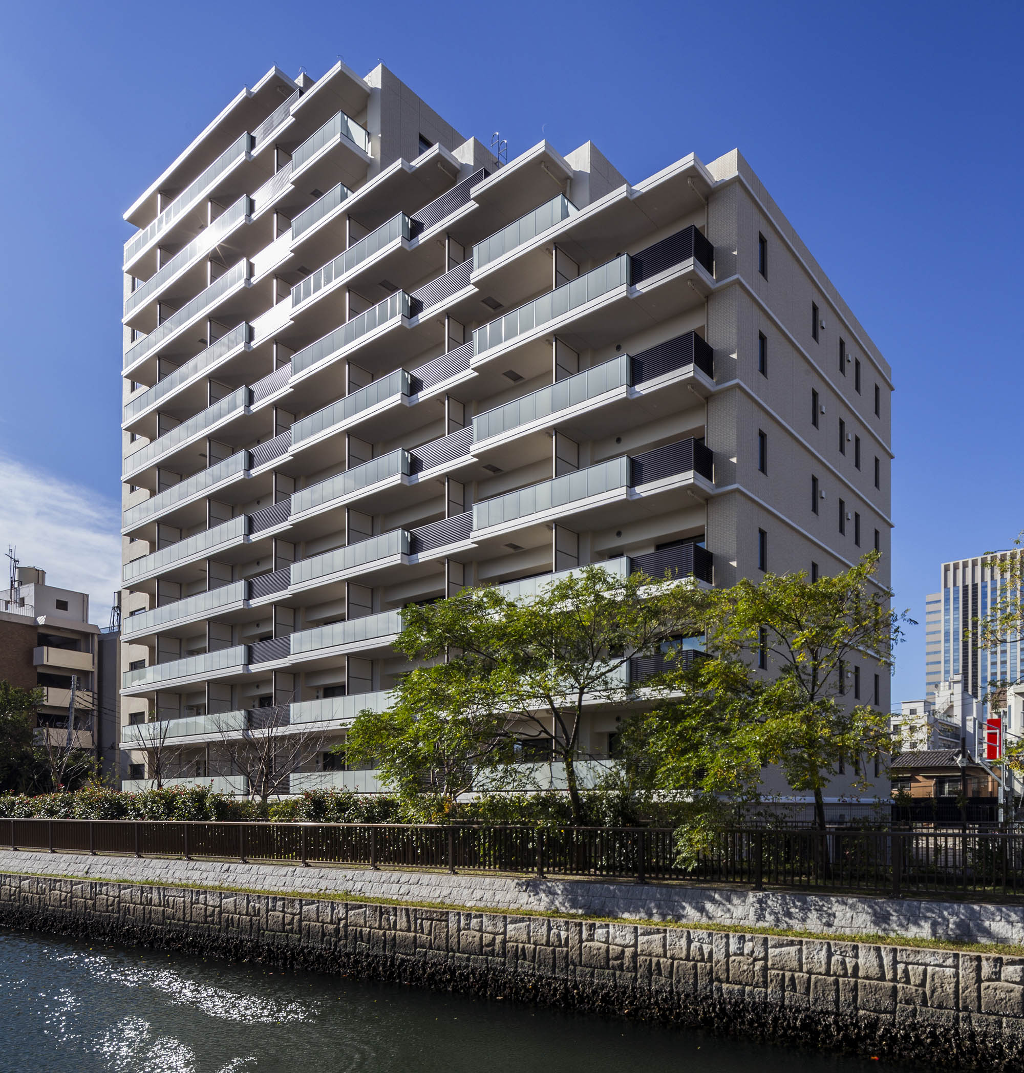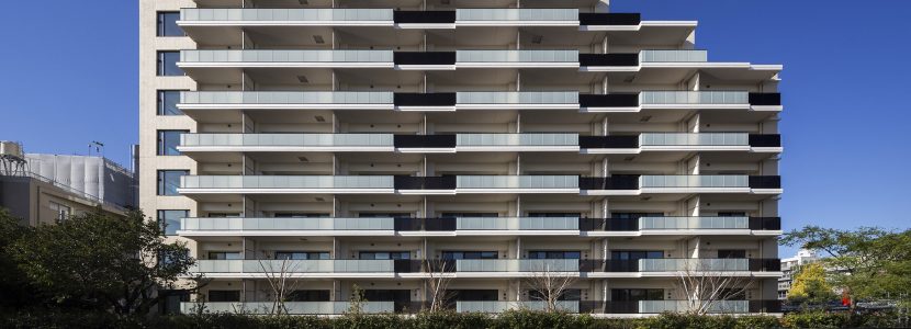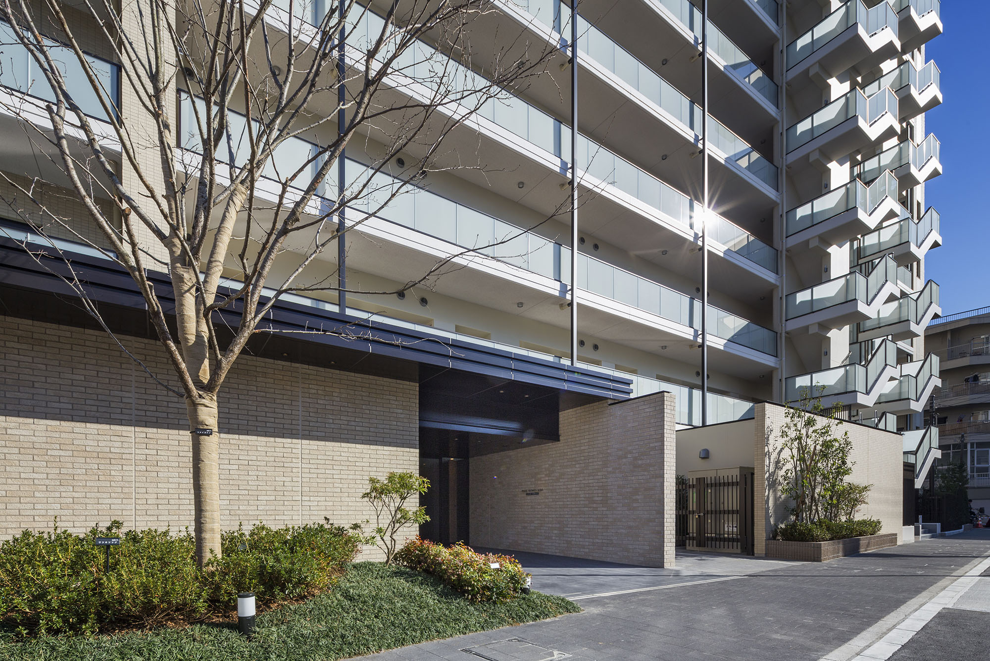 日本の御屋敷の周りをお堀が囲むように、「パークホームズ木場クリアテラス」は、敷地の東側を流れる川や、敷地を囲む塀で結界がつくられ、中が見えにくいデザインとなっています。エントランスアプローチには庇を配し、壁には「土壁」をモチーフとしたタイルを採用。建物内部へ誘われるとともに、徐々に気持ちを変化させ、心を緩ませる工夫が施されています。川沿いには既存樹のソメイヨシノとともにサクラ並木を設え、「水辺とサクラのある景観」を創出。エントランスの横にもシンボルツリーとしてソメイヨシノサクラが配され、住まう方を優雅に邸宅の内部へと導きます。