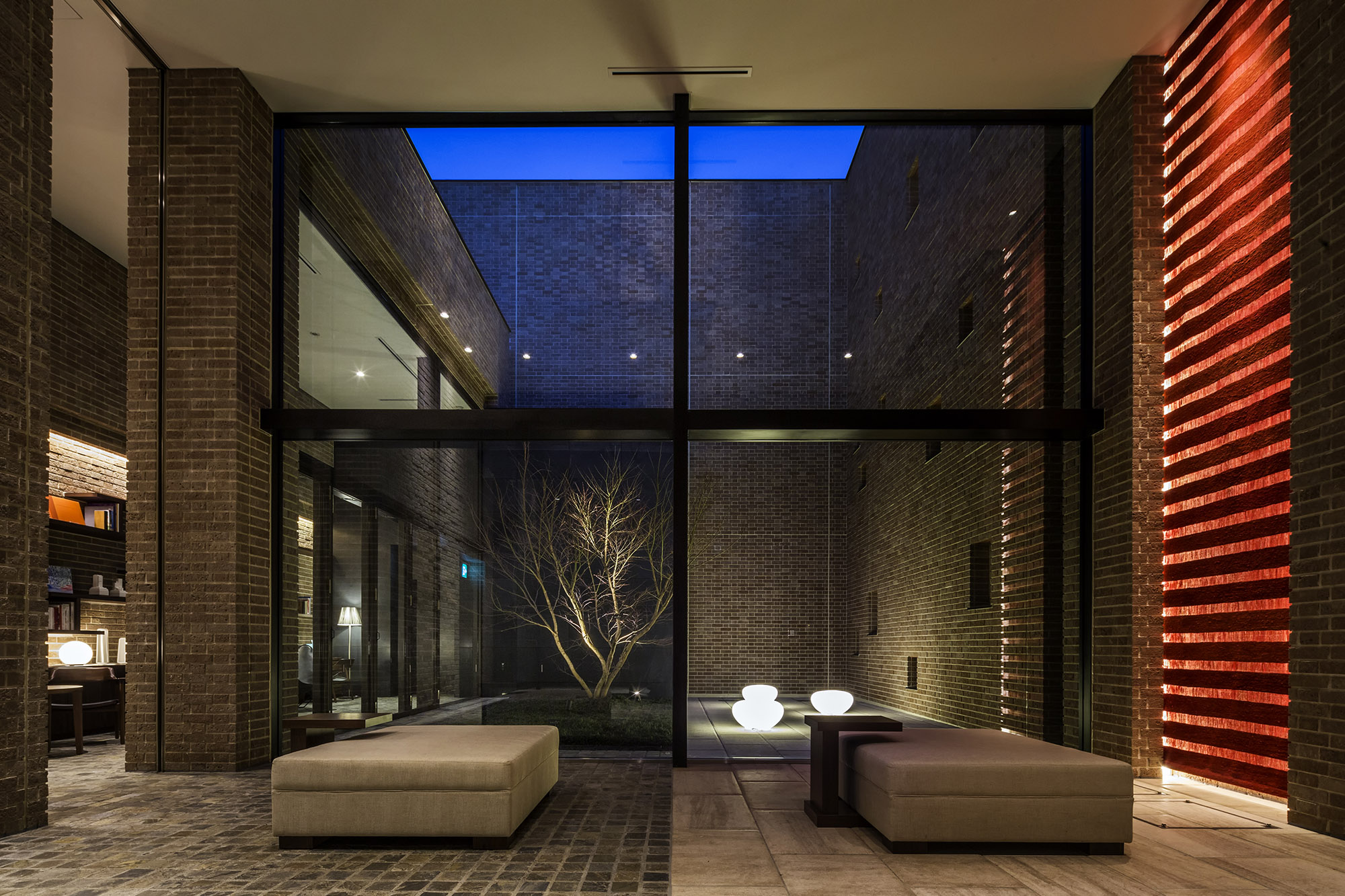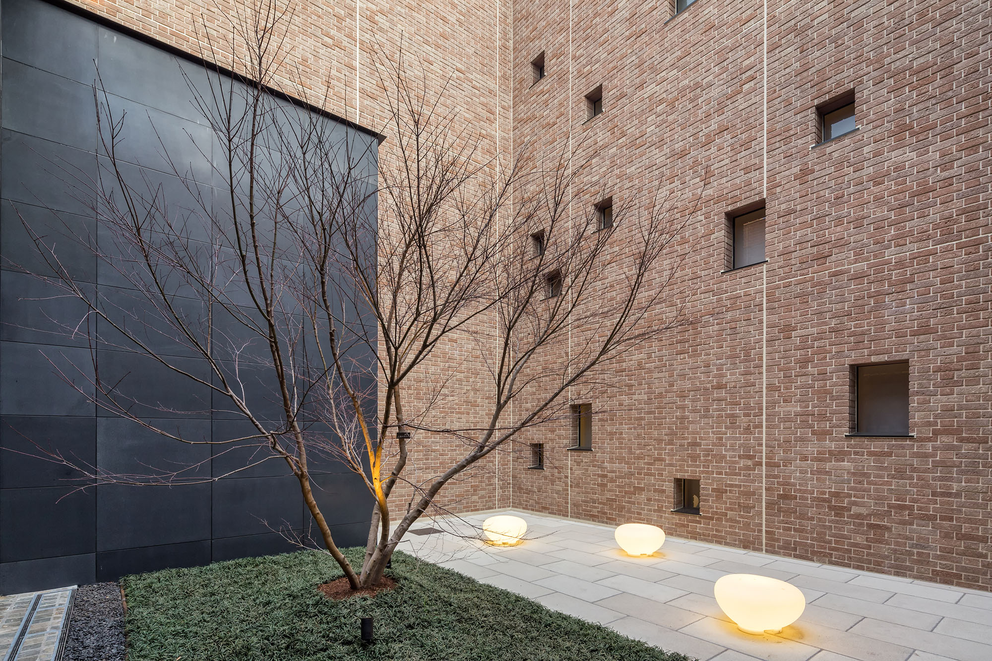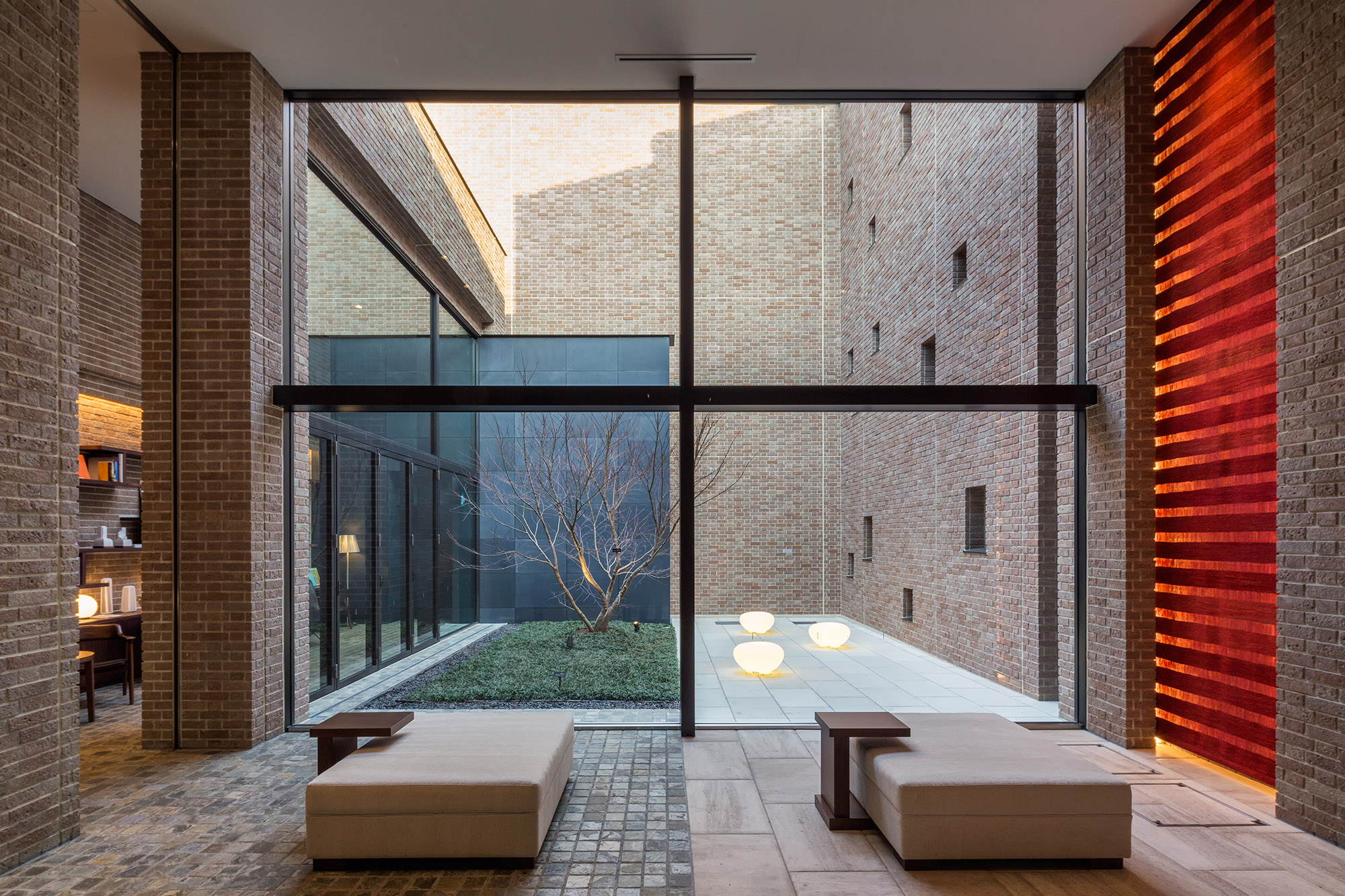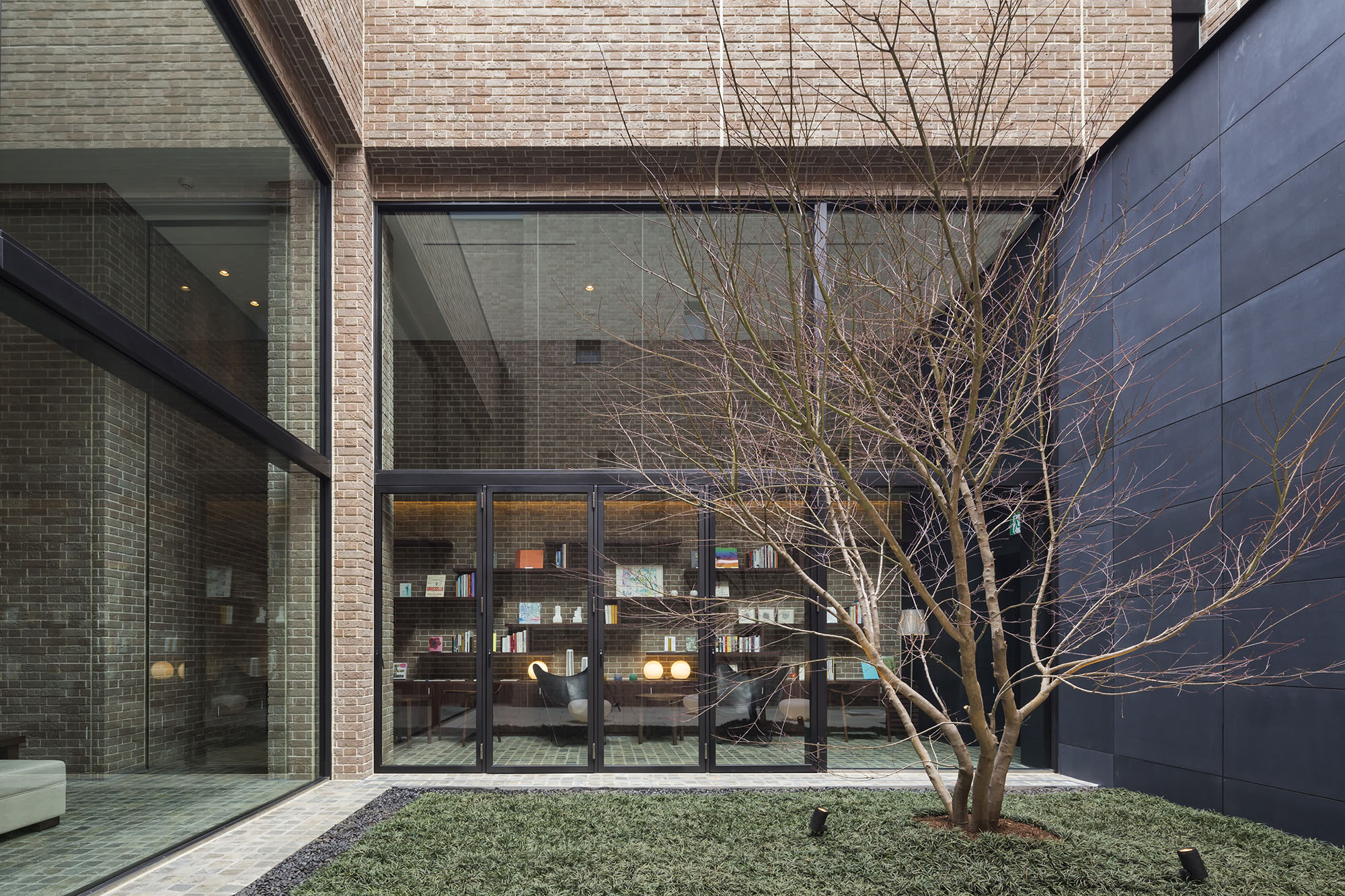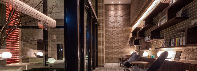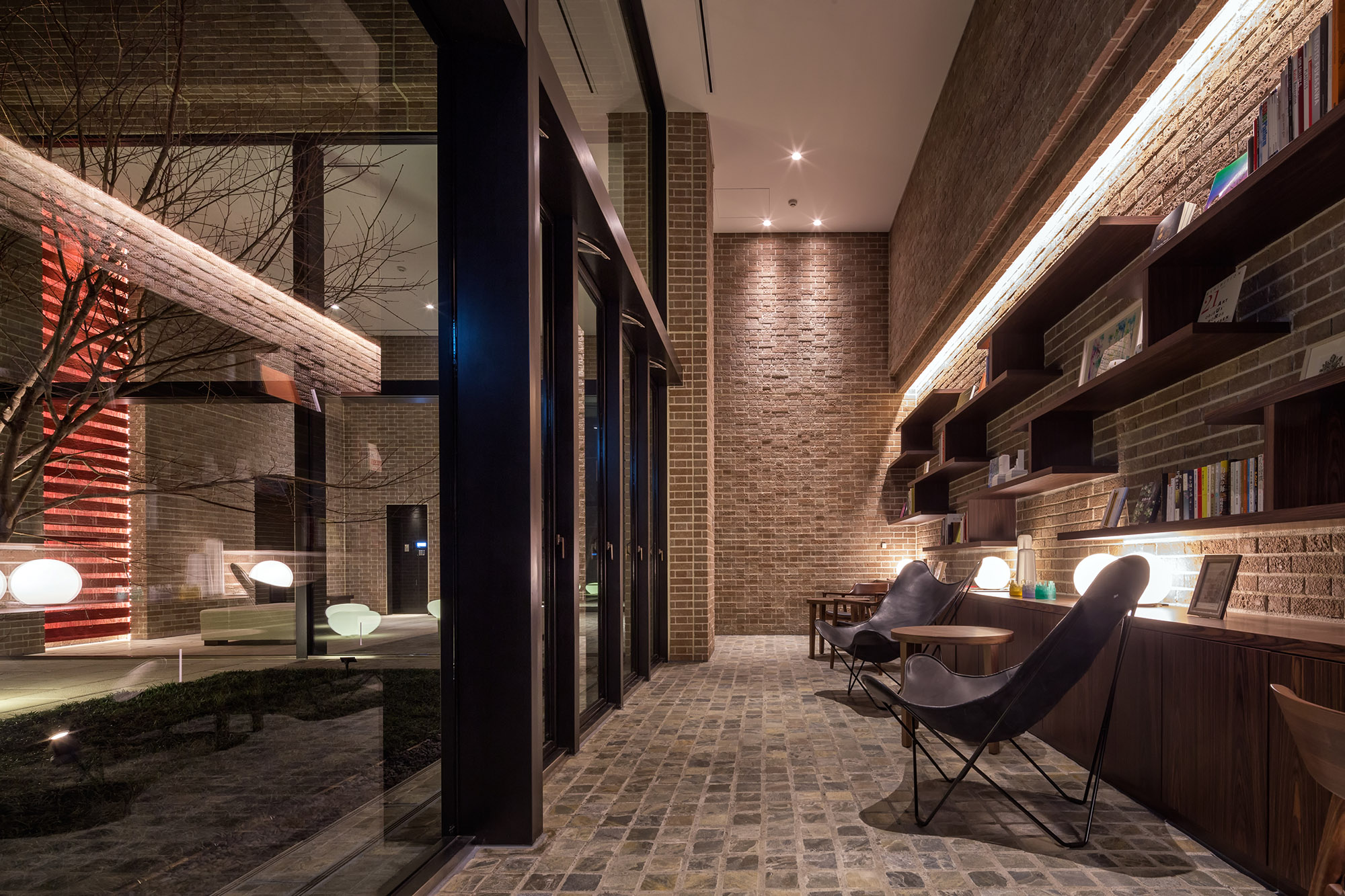 約4mの扉を抜けると、2層吹き抜けの「エントランスホール」が広がり、「中庭」に向けて大きな開口面が設けられています。「中庭」は、人の出入りも可能で、居住者同士のコミュニケーションスペースとしても利用可能。イロハモミジやランダムに配された照明が、温もりを感じられる雰囲気を創りあげています。また「ライブラリーラウンジ」には、本や小物をオブジェの様に配置できるよう、天然木の棚や机を設置。木製家具を配置することで、住民の憩いの場として、知的で温かみのある空間となっています。都会的な中にも親しみやすさの薫る「吉祥寺らしさ」が演出された共用空間です。