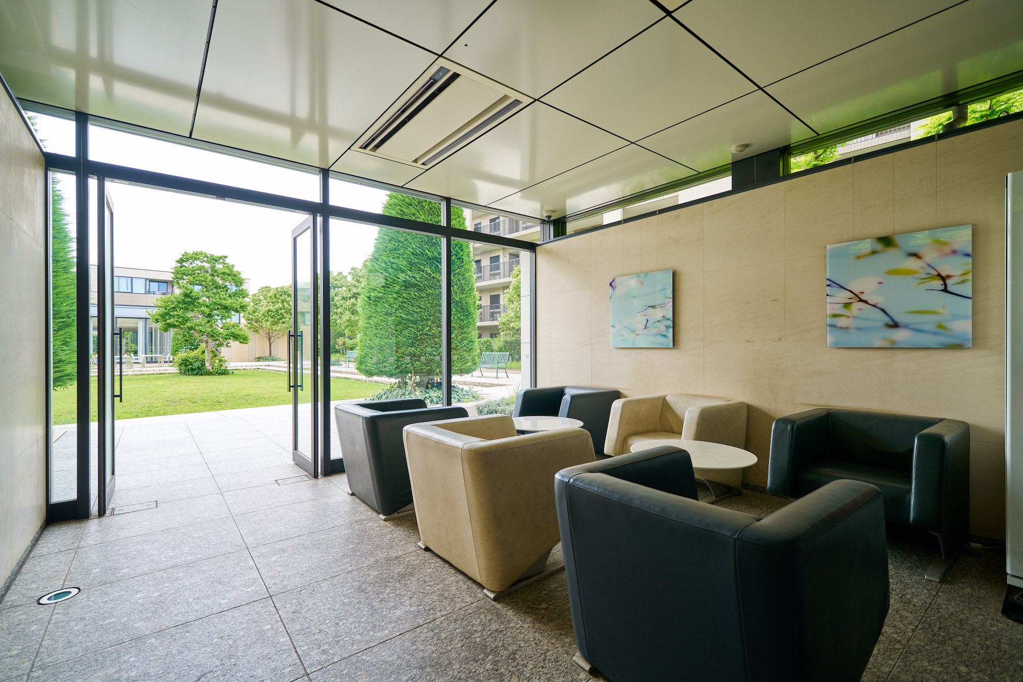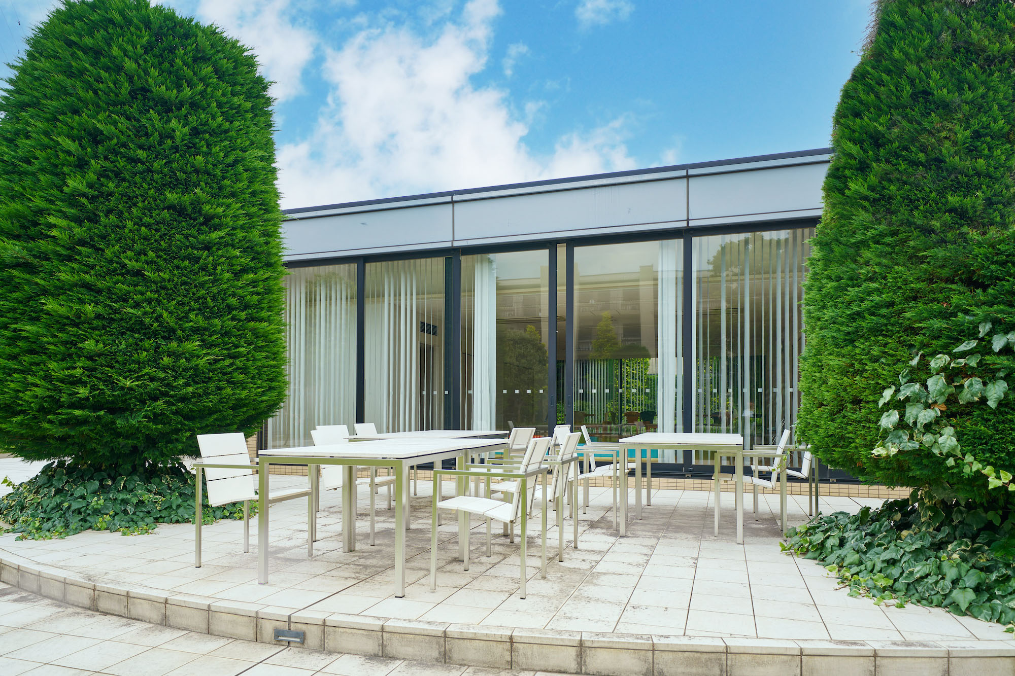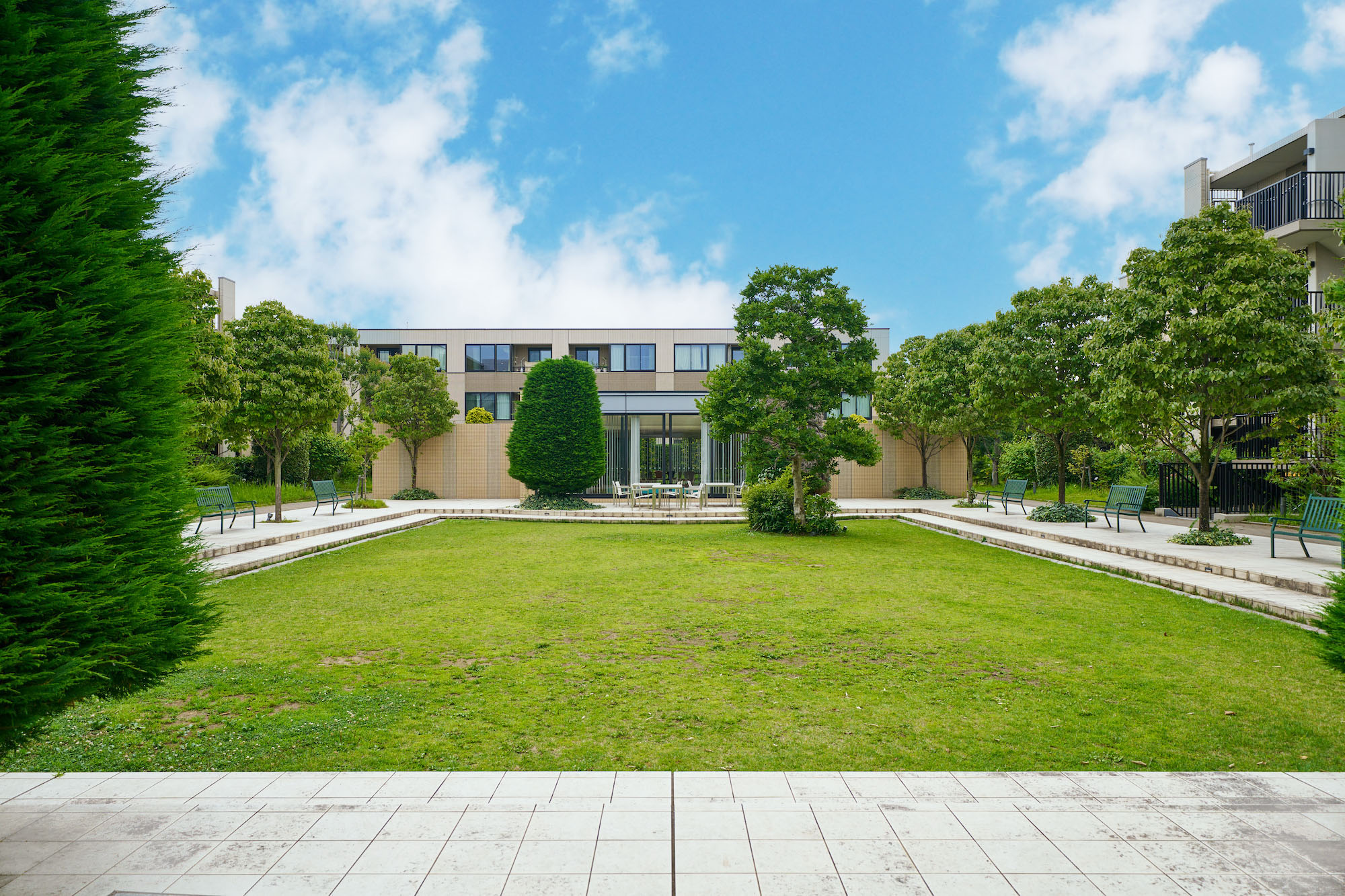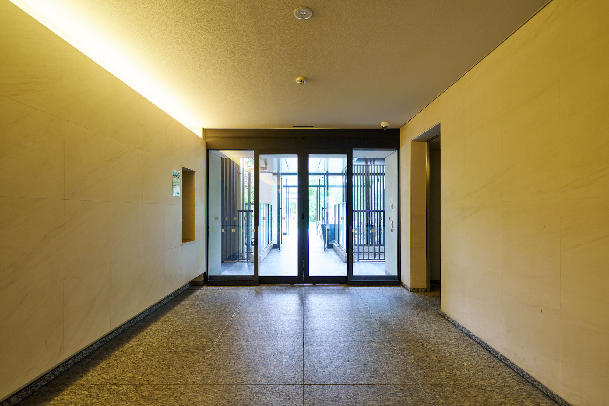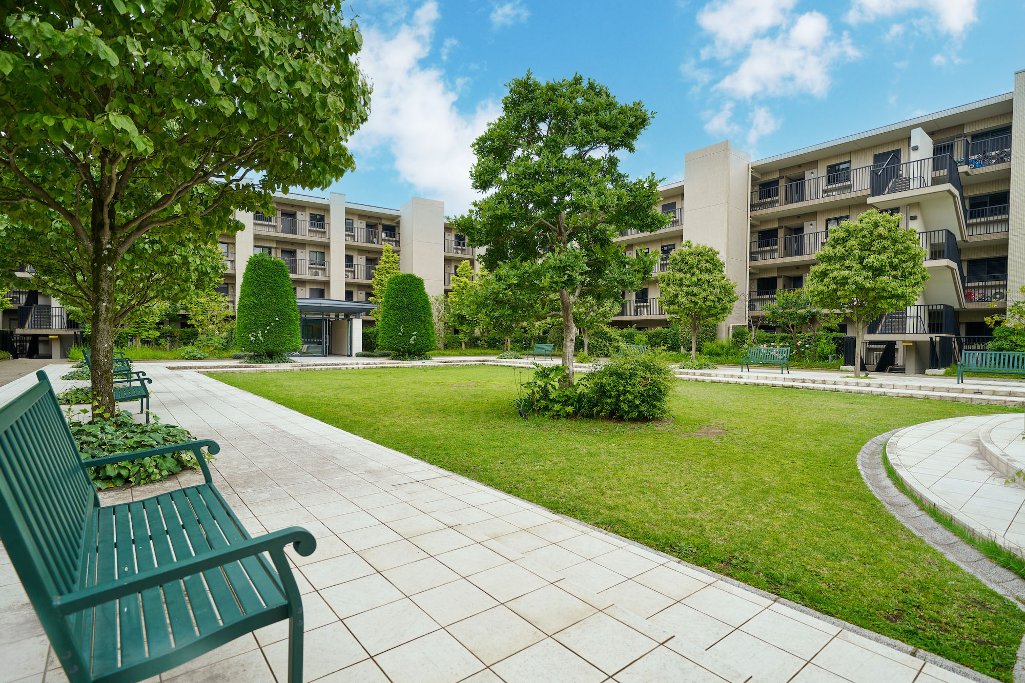 堂々とした門構えの、重厚さを設えたエントランス。大きなシンボルツリーとの妙を演出するシャープなデザインのキャノピーが、風格を醸し出しています。アプローチ両側の壁面には御影石を使用され、正面の存在感ある黒檀調の重厚な扉が、内部へと静かに誘います。敷地中央に広がるのは、奥行き約54mの「クロイスターガーデン」。テニスコート4面分の敷地面積で、四季を楽しみながら優雅な時間を過ごせる空間です。そして、その中庭に面して建つのは「コミュニティハウス」。ゆったりとしたソファが配され、キッズコーナーでは子ども達がのびのびと遊ぶことができ、テラスのテーブルに座って居住者同士のコミュニケーションを育むこともできます。