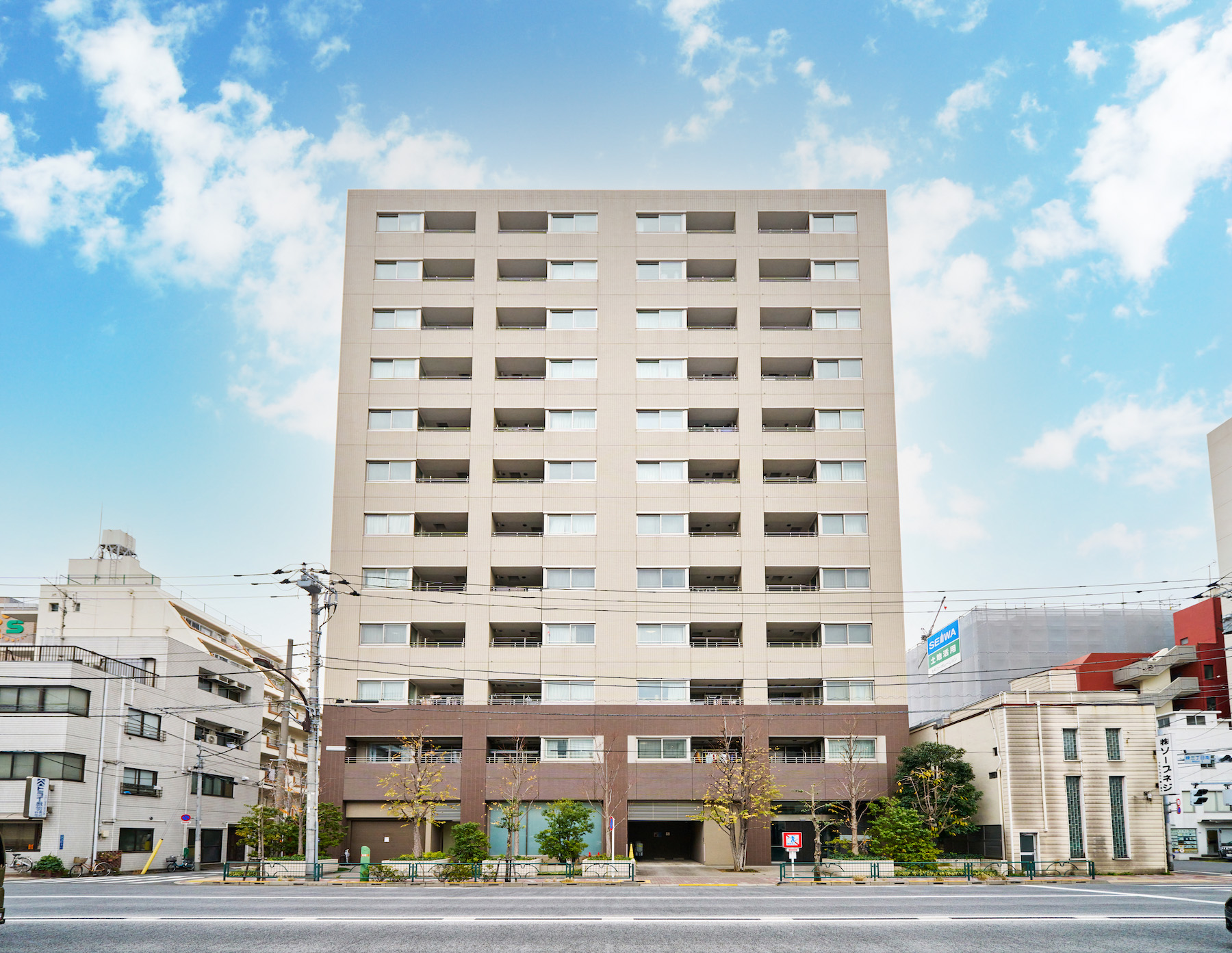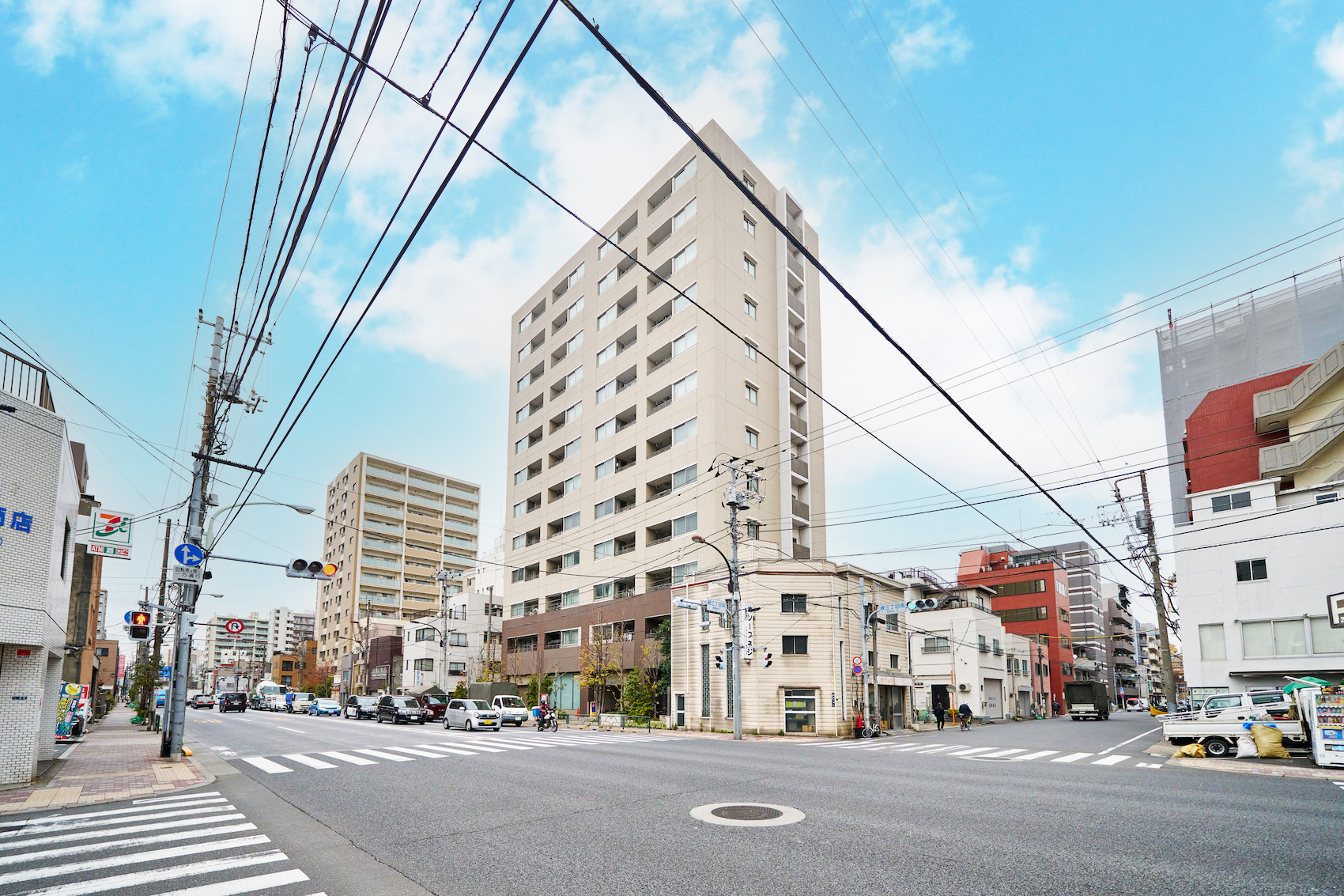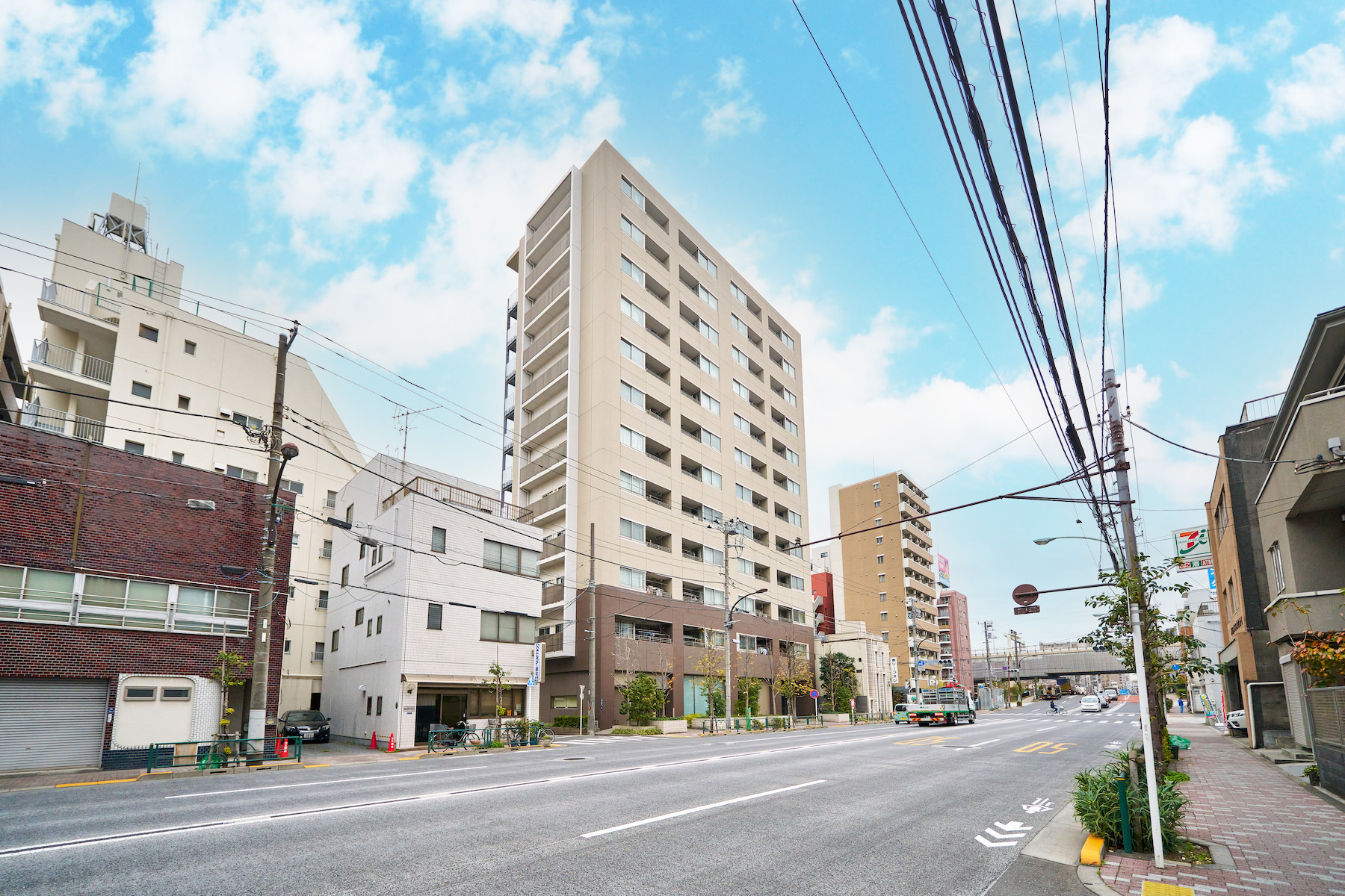 江戸の文化や伝統が今も息づく土地の歴史に敬意を払い、和の「粋」が外観デザインに生かされています。江戸茶や白茶をベースに土壁風ボーダータイルを取り込んだ基壇部、着物の袖口や袂から見える色や柄を隠喩した壁面の鮮やかな白のボーダーなど、今尚継承される江戸文化をモダンテイストにちりばめ、この地にふさわしい風格ある建物となっています。