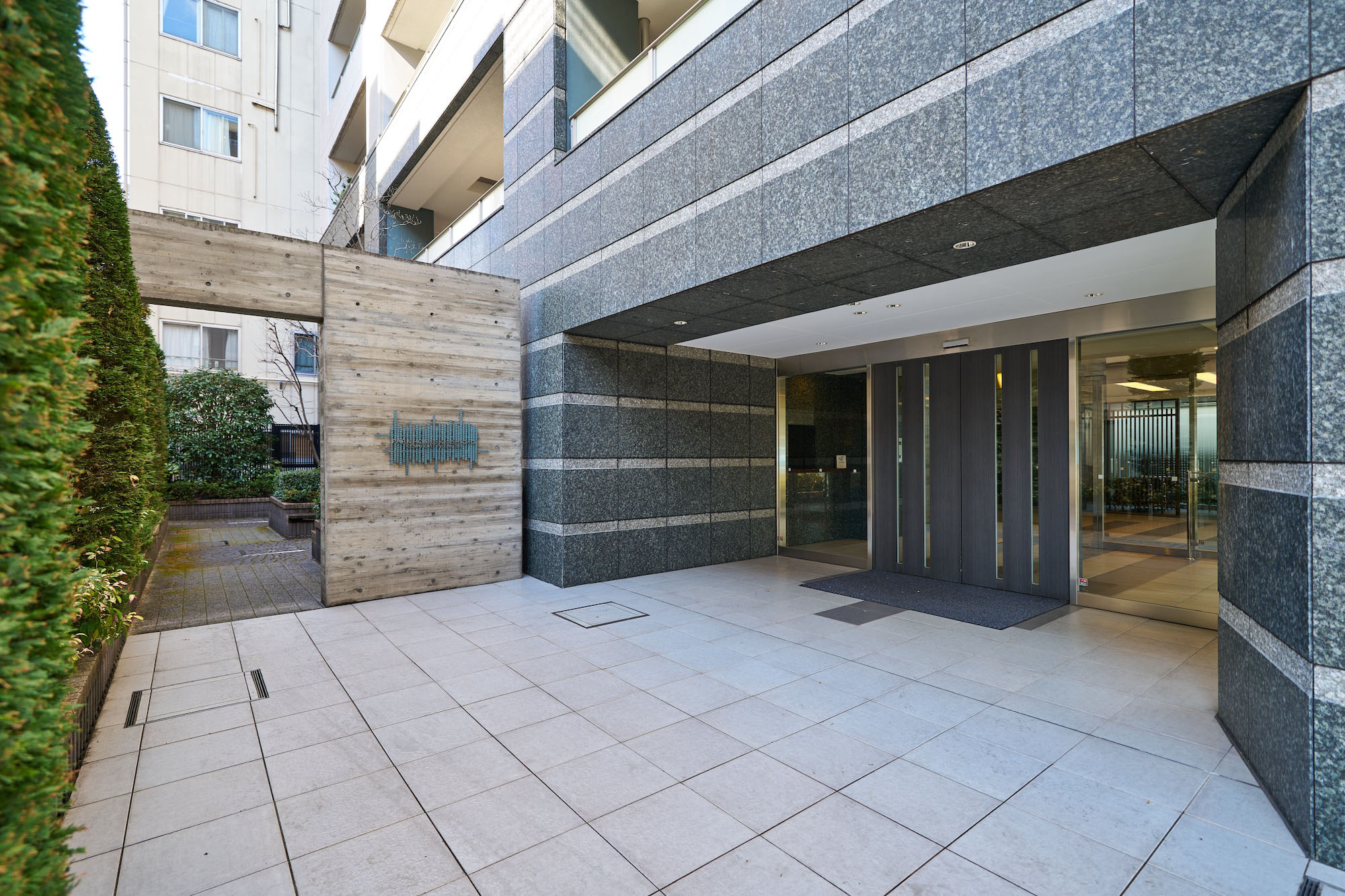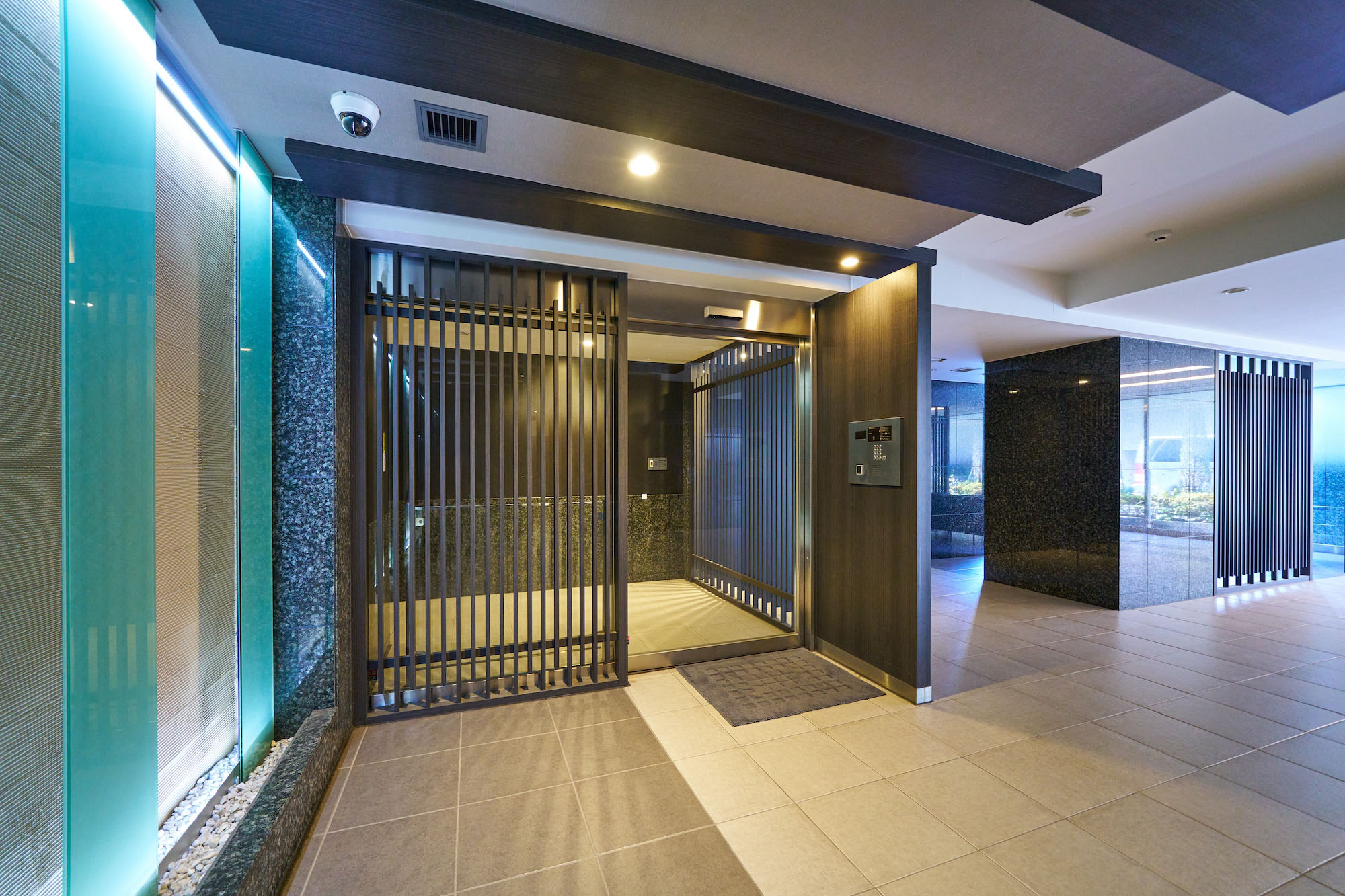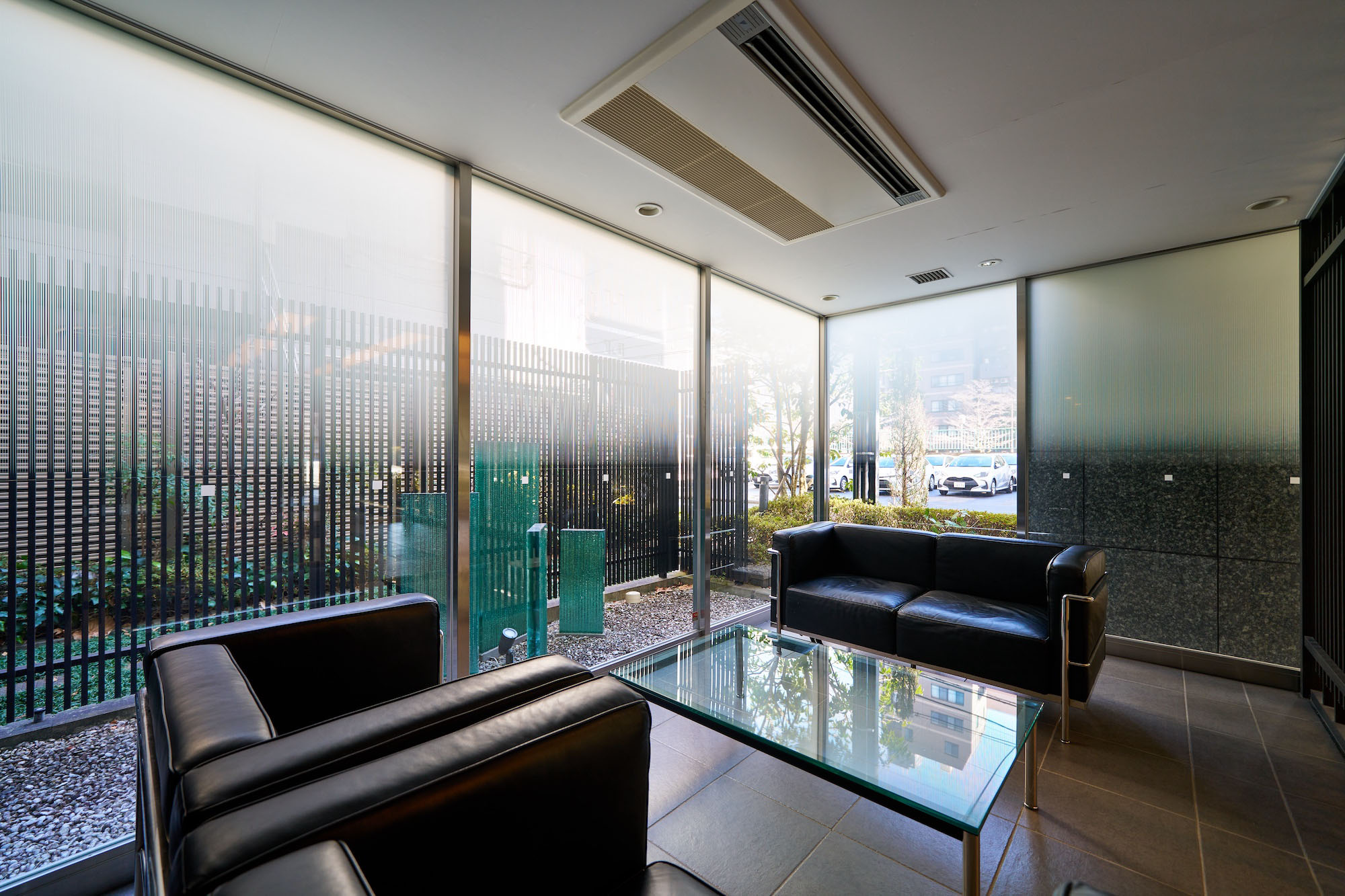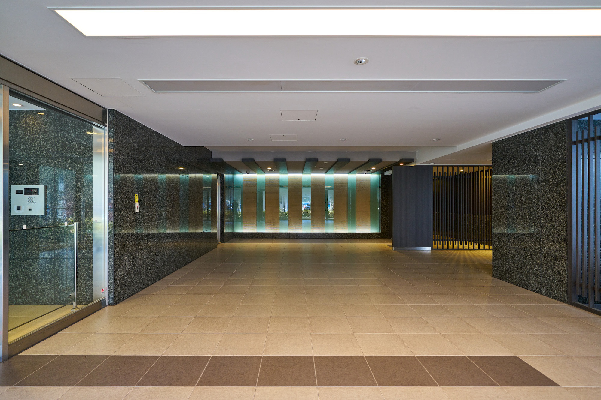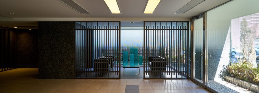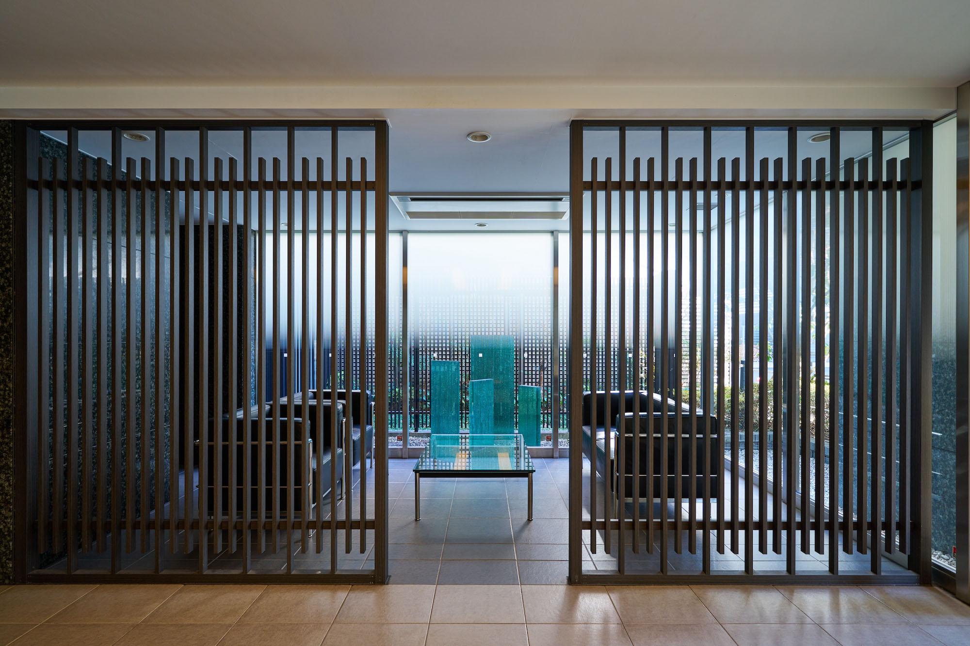 リズミカルに連なるウォールと植栽の印象的なアプローチ。重厚な天然石の壁面に守られたエントランスは、それまでの賑わいの時間を切替え、やすらぎの時へ心地よくエスコートします。その先に広がるエントランスホールは、格子デザインなど日本の伝統をアレンジし、繊細さとモダンが巧みに調和した、凛とした雰囲気の空間。奥のラウンジからは、化粧玉砂利敷きの優美な坪庭が伺え、ちょっとした待ち合わせや日々の歓待の時を豊かに演出します。