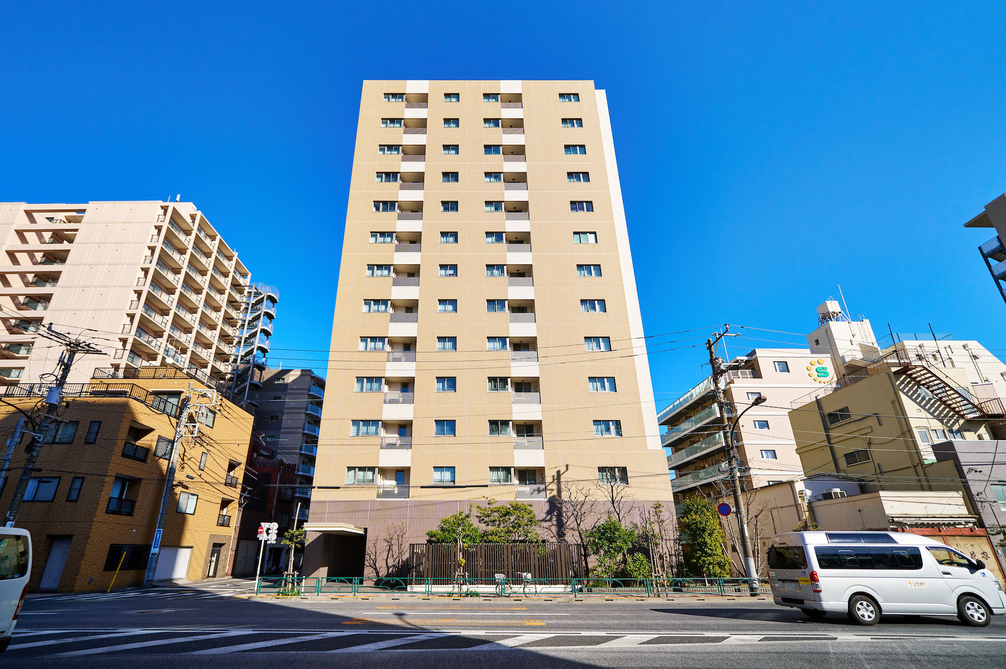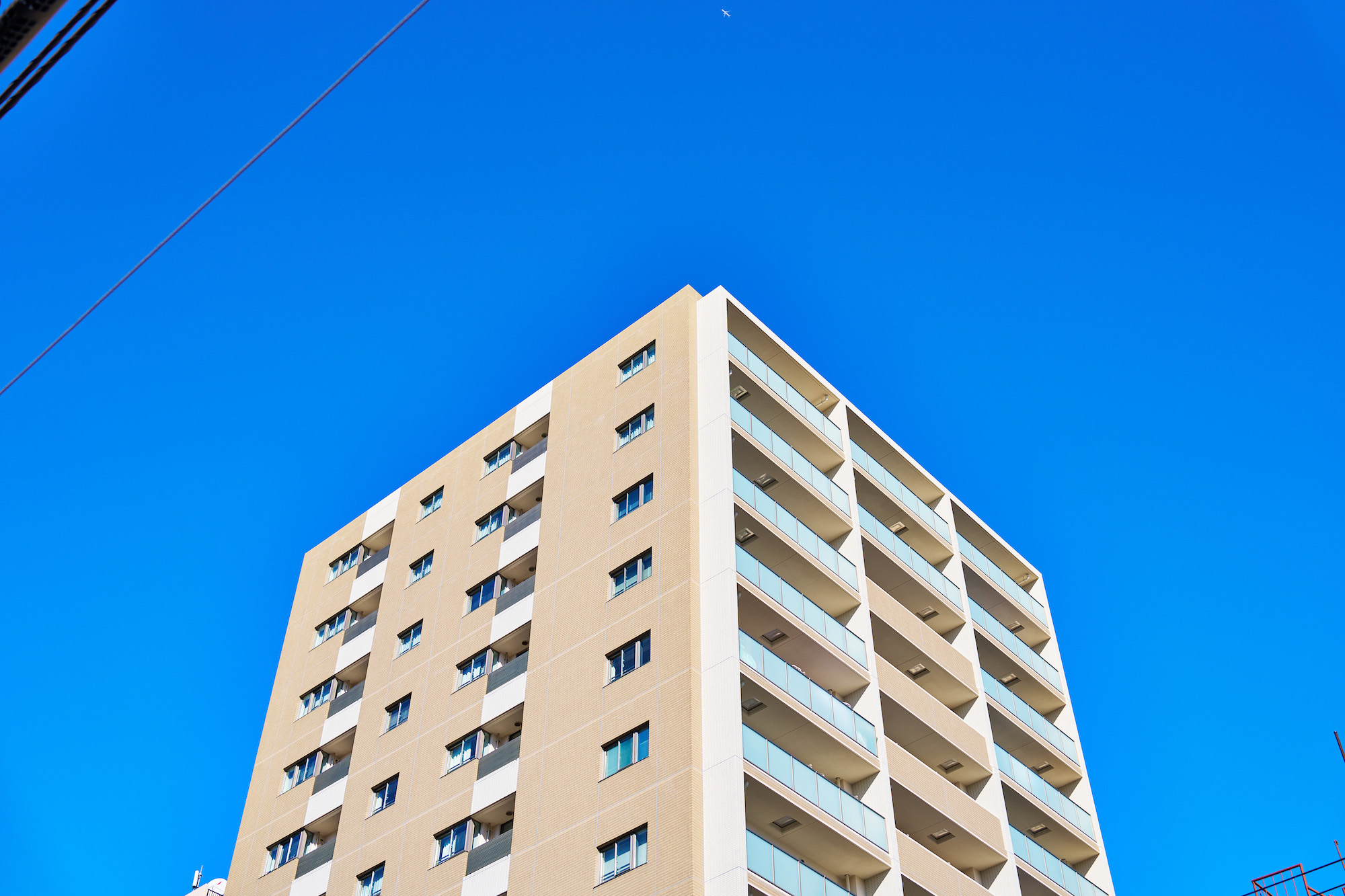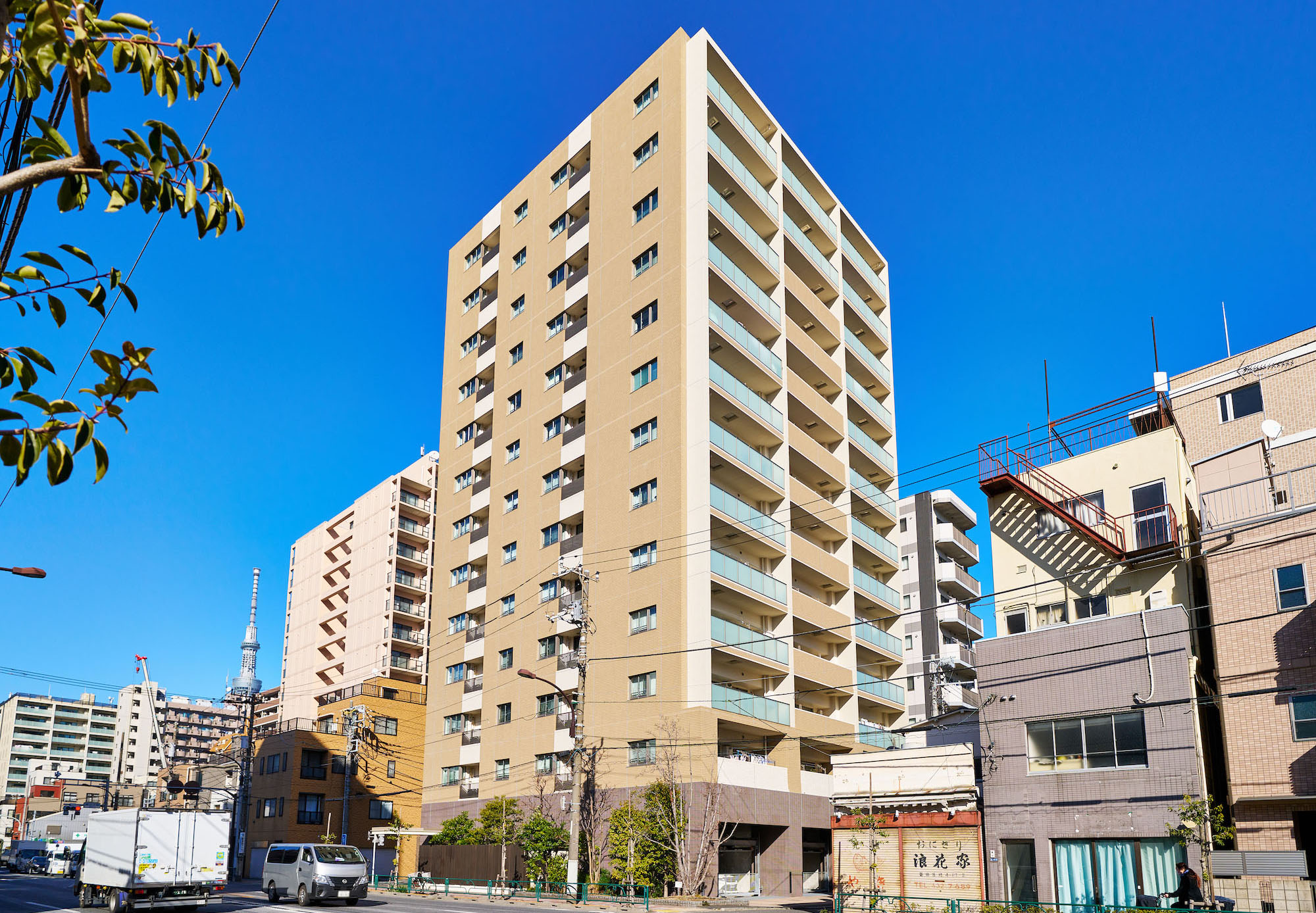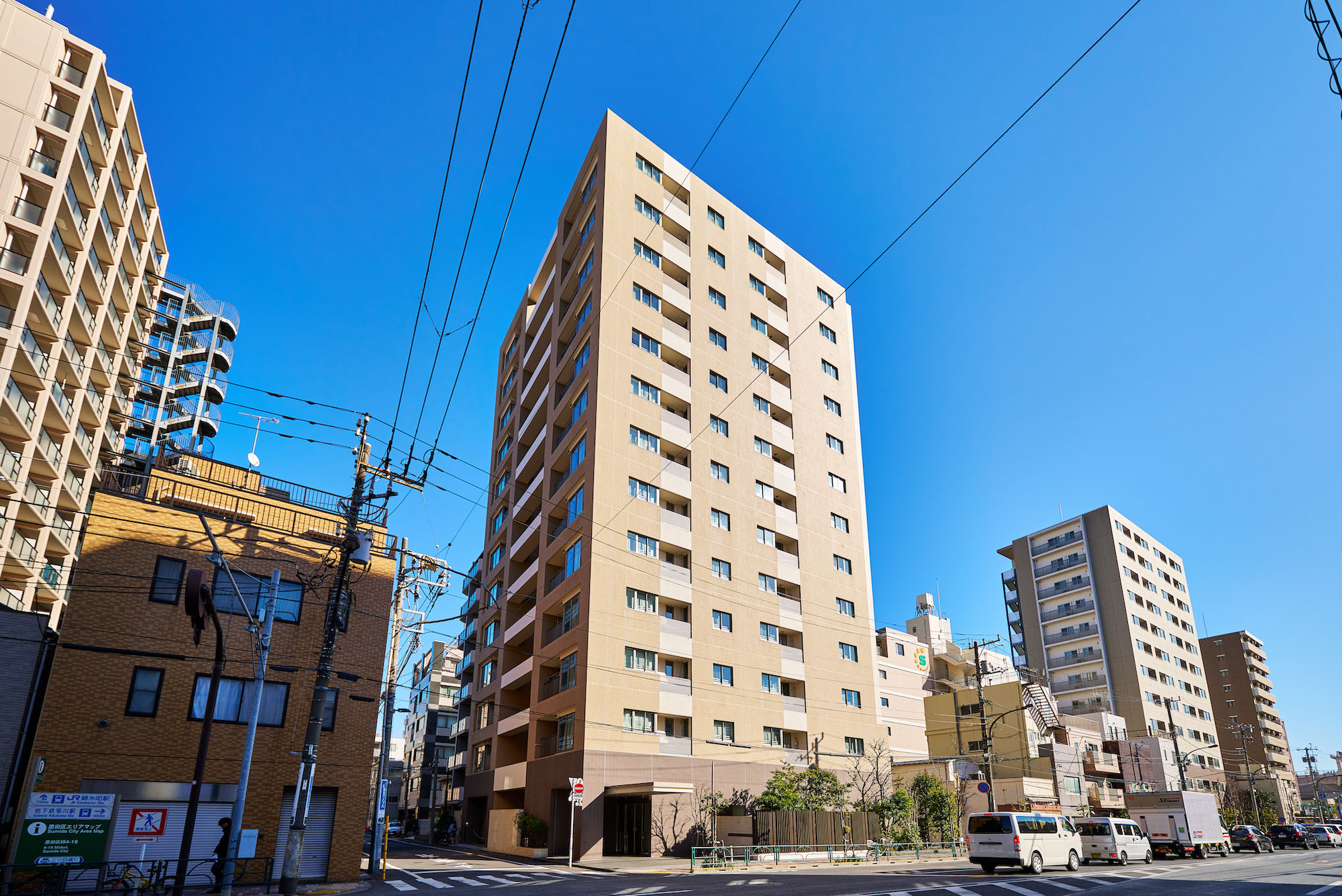 江戸時代より栄えたこの土地柄からイメージされる「粋」をコンセプトとし、洗練を内に秘めた美しさを外観で表現。基壇部にはマットなボーダータイルを使って上質感を演出し、上層部にかけては2種類のタイルを使い、外観の表情に変化をつけています。南面のバルコニー手摺は角住戸をガラス手摺、中住戸はタイル貼りに。シンメトリーなデザインを施しつつ、メリハリの利いたファサード造形としています。