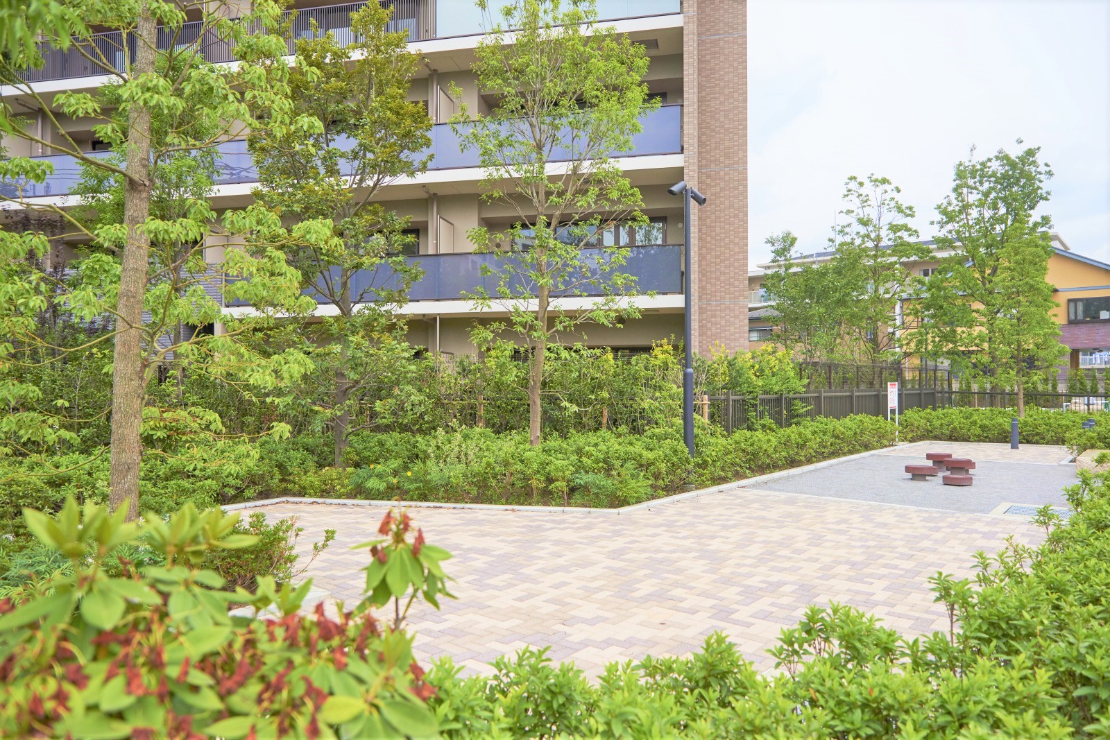様々な樹木に抱かれた交流スペース。