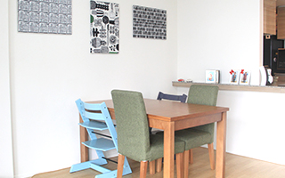 新居に合わせて購入されたダイニングテーブルはふだん四人掛けとして使っているが、実は伸張できる仕様。奥様が仕事のときには、双方のご両親どちらかが必ずサポートに来てくれるが、お二人とも実家は遠方。泊まりがけとなるため、みんなで座れる食卓が必要なのである。