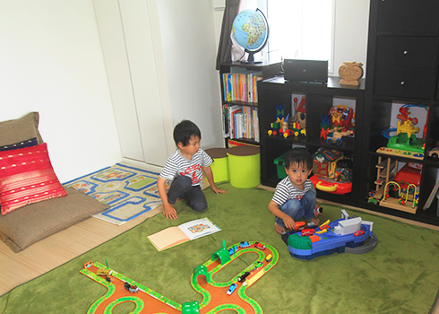 リビング隣の居室で伸び伸び遊ぶお子様たち。おもちゃはグリッド式の棚に整然と収納されている。