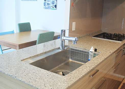 お気に入りの大理石カウンターには何も置かずいつもスッキリ。バックカウンターに置かれた家電も黒色をメインに統一感を。
