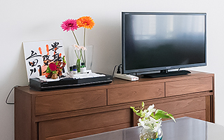 リビングボードは年を経た色の変化も楽しむため、ウォールナットをチョイス。色鮮やかな花々から細やかな心配りが感じられる。