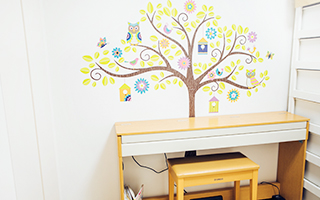 シンプルな空間が好きで、キレイ好きな奥様。部屋はどこを眺めても美しく整理整頓されていて見事だ。シンプルな中にも温かさを感じるのは、手づくりのアイテムが印象的なためだろう。ダイニングやキッズルームの壁に飾られたファブリックパネルは、気に入った柄のクロスを木枠に打ち付けて製作したもの。ソファに置かれたクッションカバーやカーテンを束ねるタッセルもハンドメイドとのことだ。