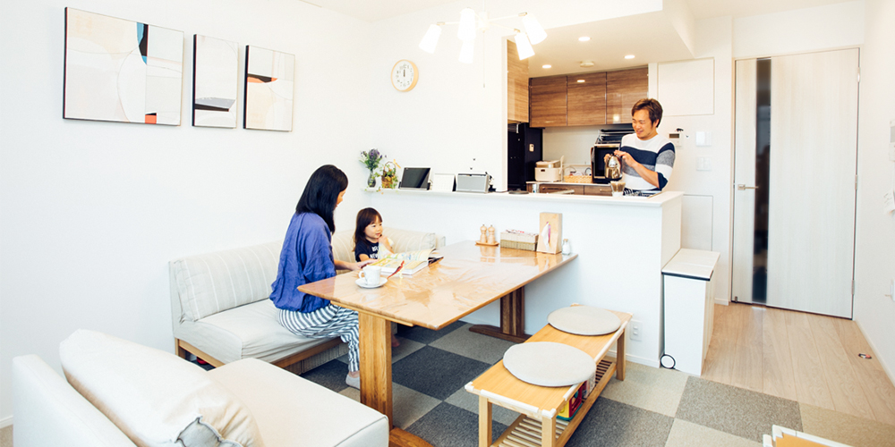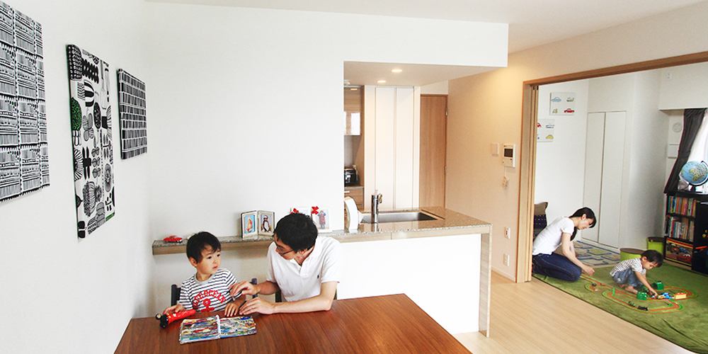 二人目のお子様誕生をきっかけに、同区内の分譲マンションから現在の住まいに引越してきたKさんご夫婦。お二人とも仕事に就かれているが、新居はどちらの通勤にも便利な場所。家族が一緒にいられる時間を大切に暮らしている。