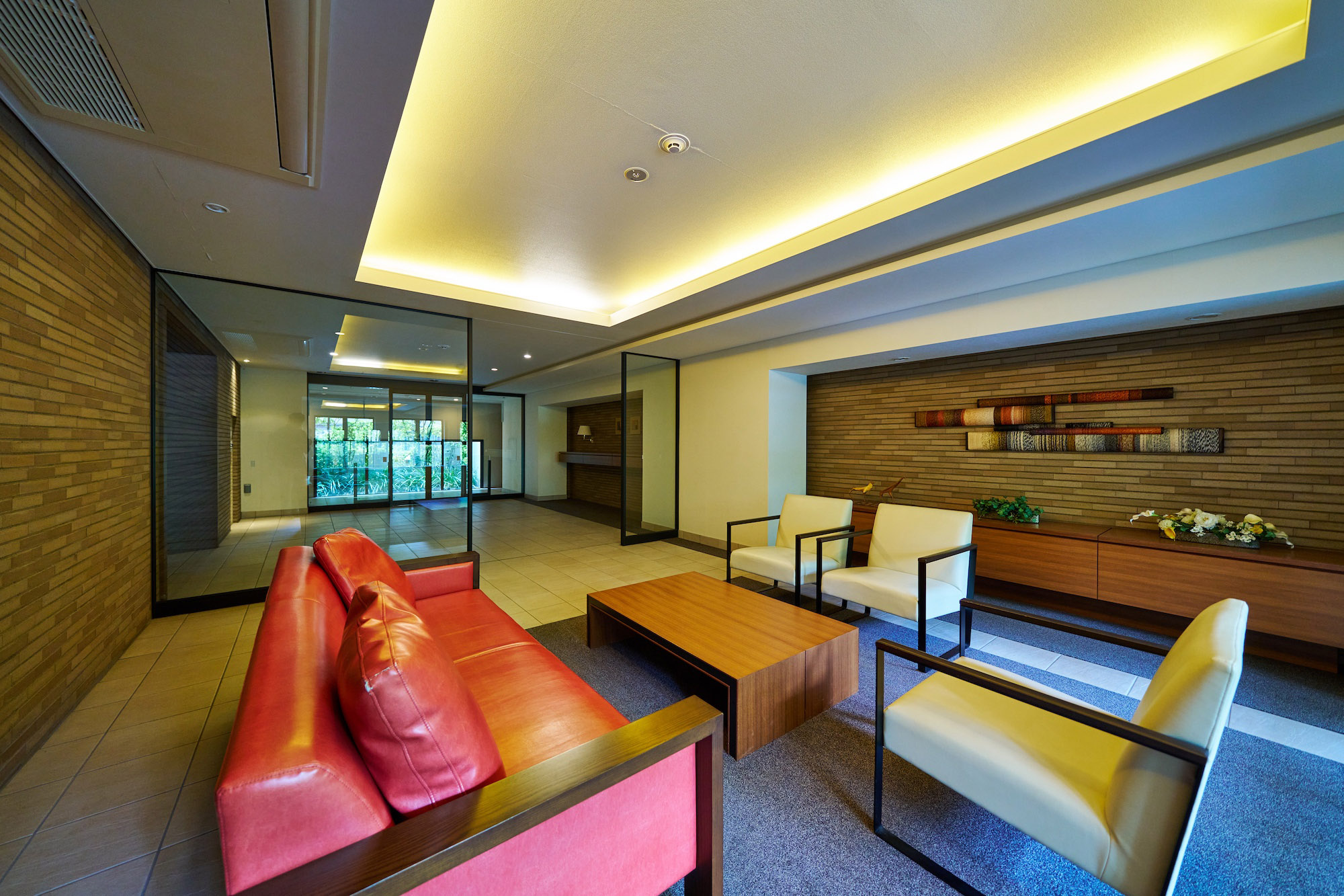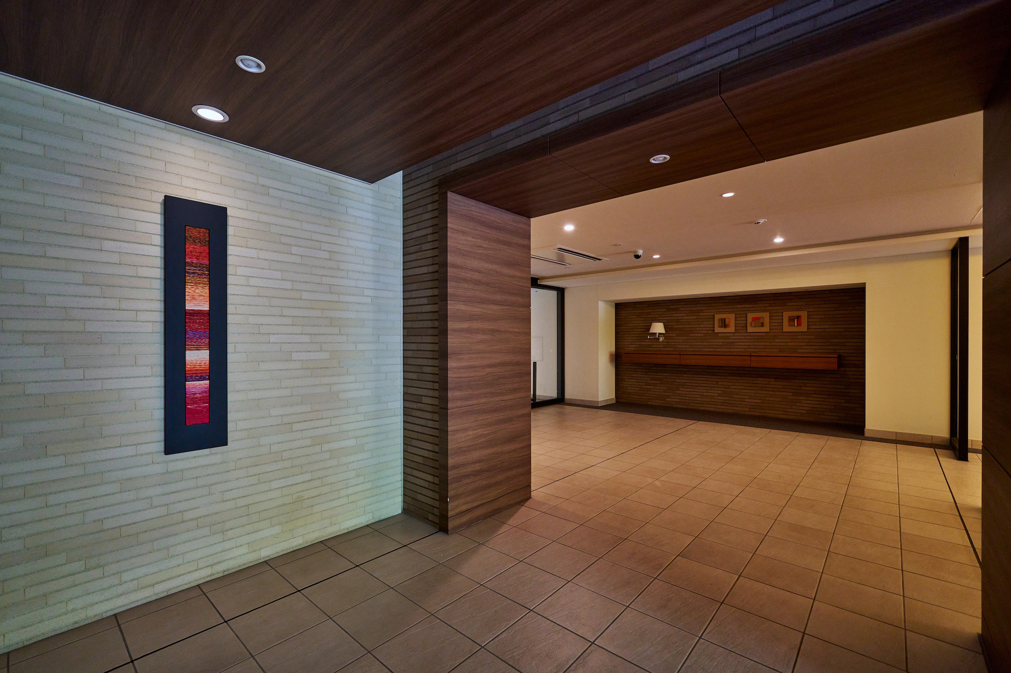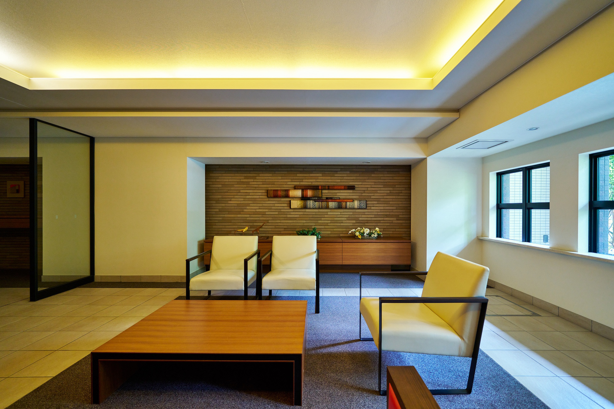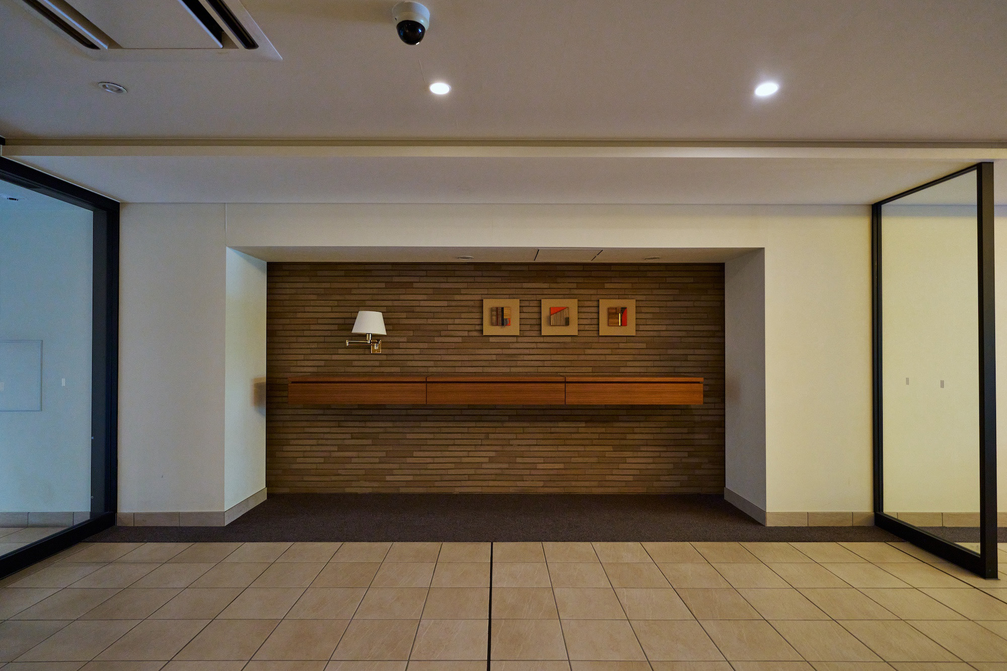 焼きむらのある煉瓦タイルが演出する、温もりに満ちたエントランスラウンジ。窓の形状は石積みの建築様式を意識しながら、語らいを重ねるひとときに、落ち着きと上質感を添えています。また、共用廊下側には視線を坪庭へ誘う地窓を設置。テラスも設けることで、潤いと開放感を感じて過ごす交流の一幕を描いています。
