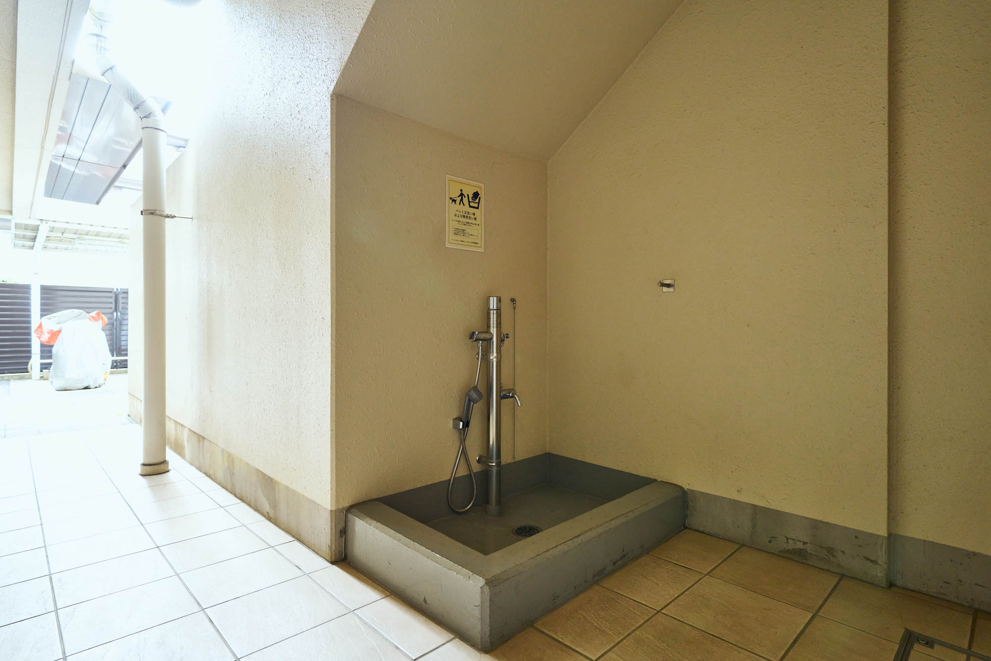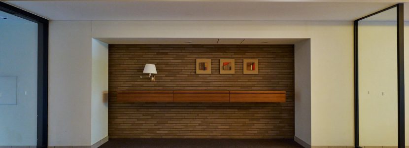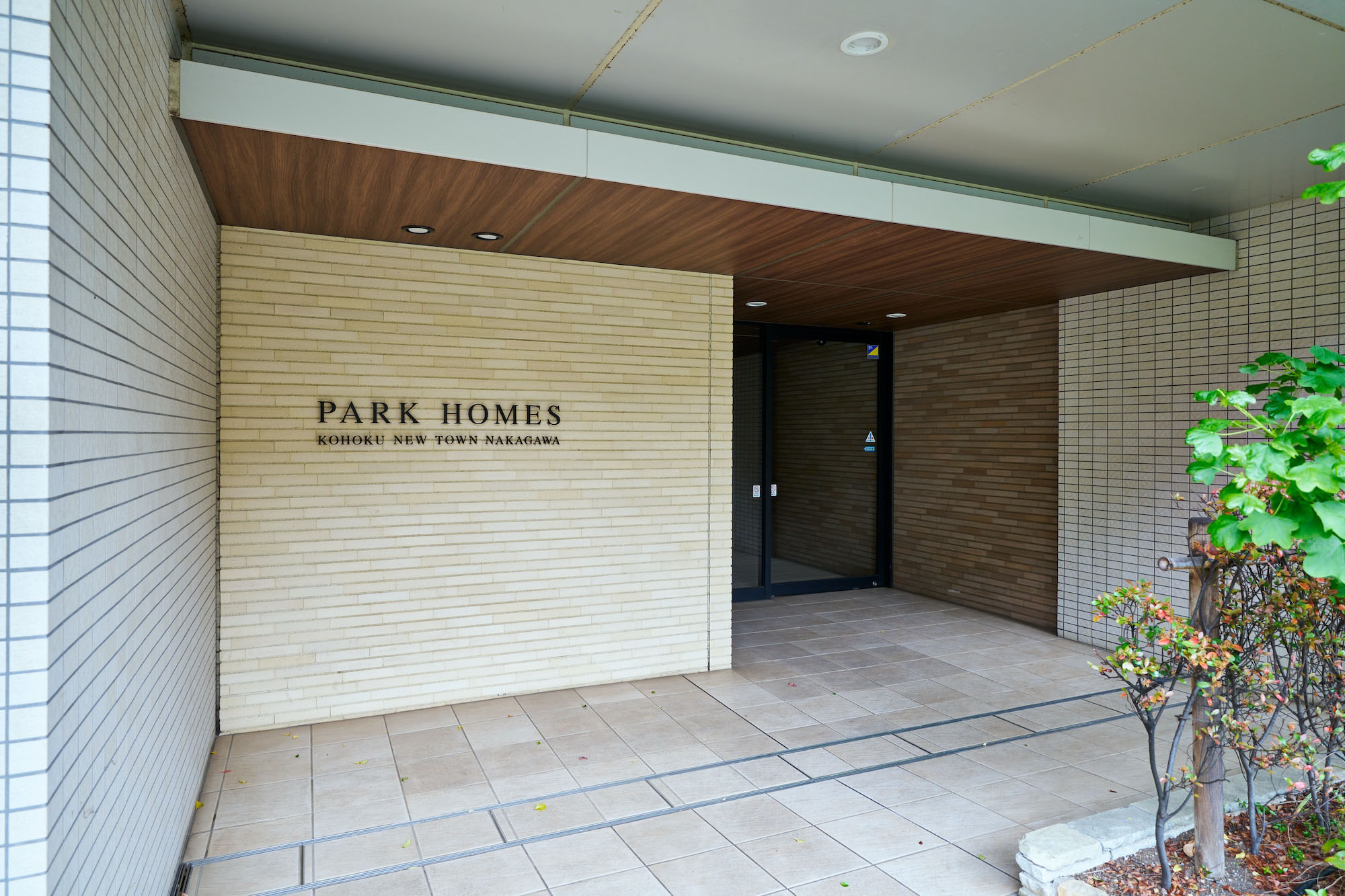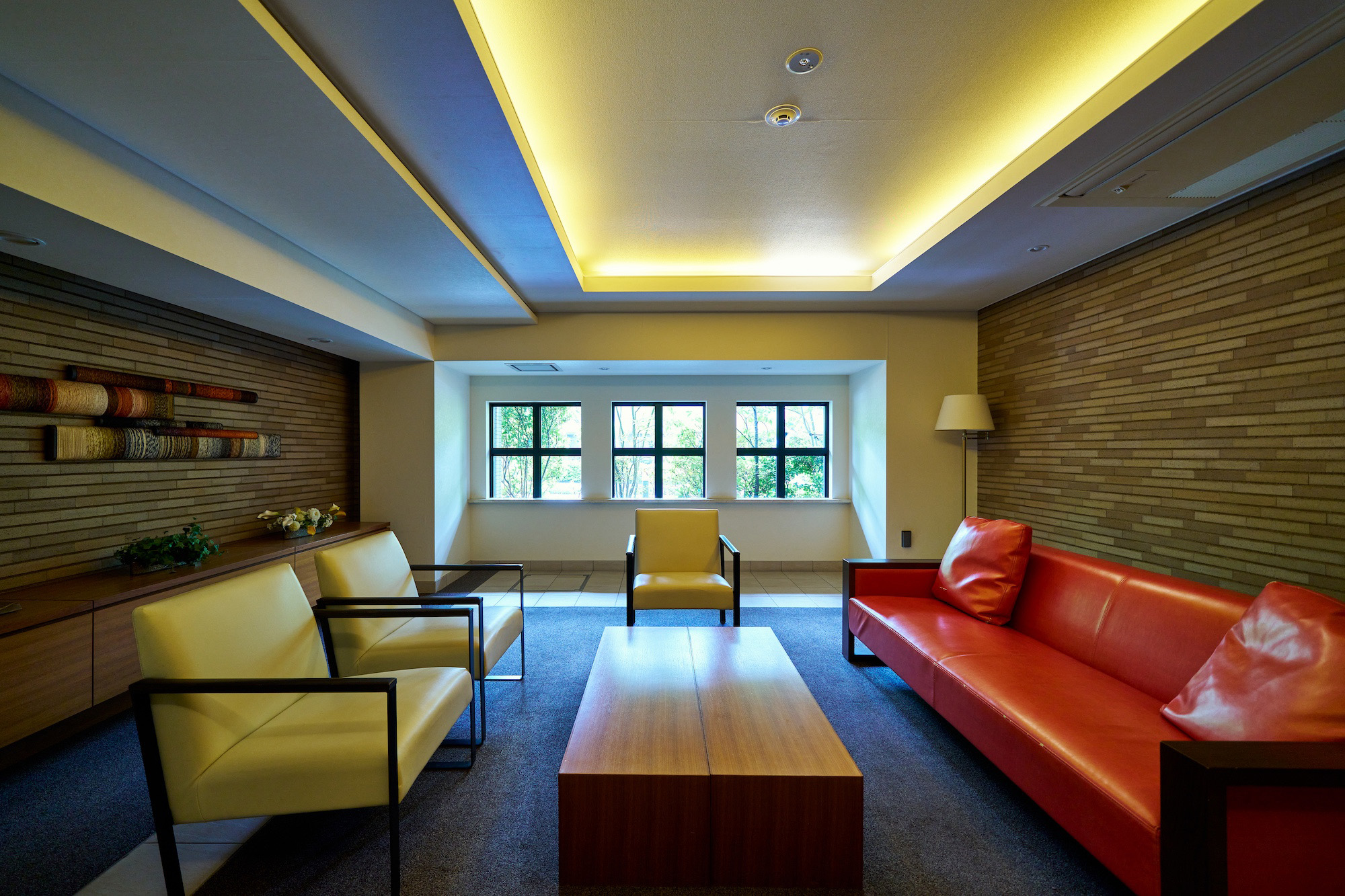 焼きむらのある煉瓦タイルが演出する、温もりに満ちたエントランスラウンジ。窓の形状は石積みの建築様式を意識しながら、語らいを重ねるひとときに、落ち着きと上質感を添えています。また、共用廊下側には視線を坪庭へ誘う地窓を設置。テラスも設けることで、潤いと開放感を感じて過ごす交流の一幕を描いています。