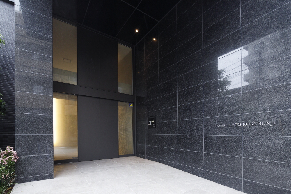 自然石を用いた門構えが重厚感と格を象徴。大判の自然石やタイルなど重厚感を演出するマテリアルを採用。