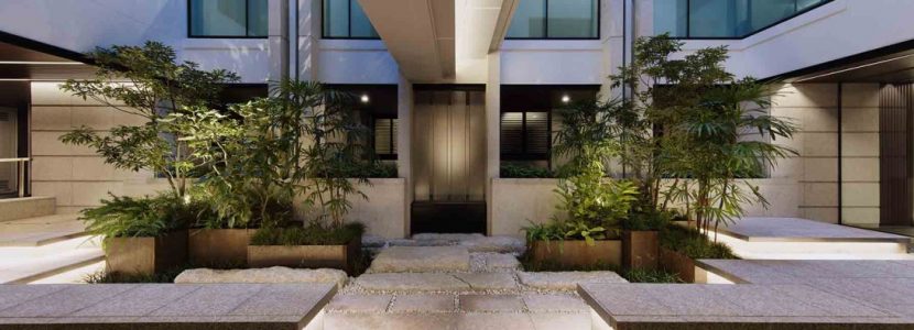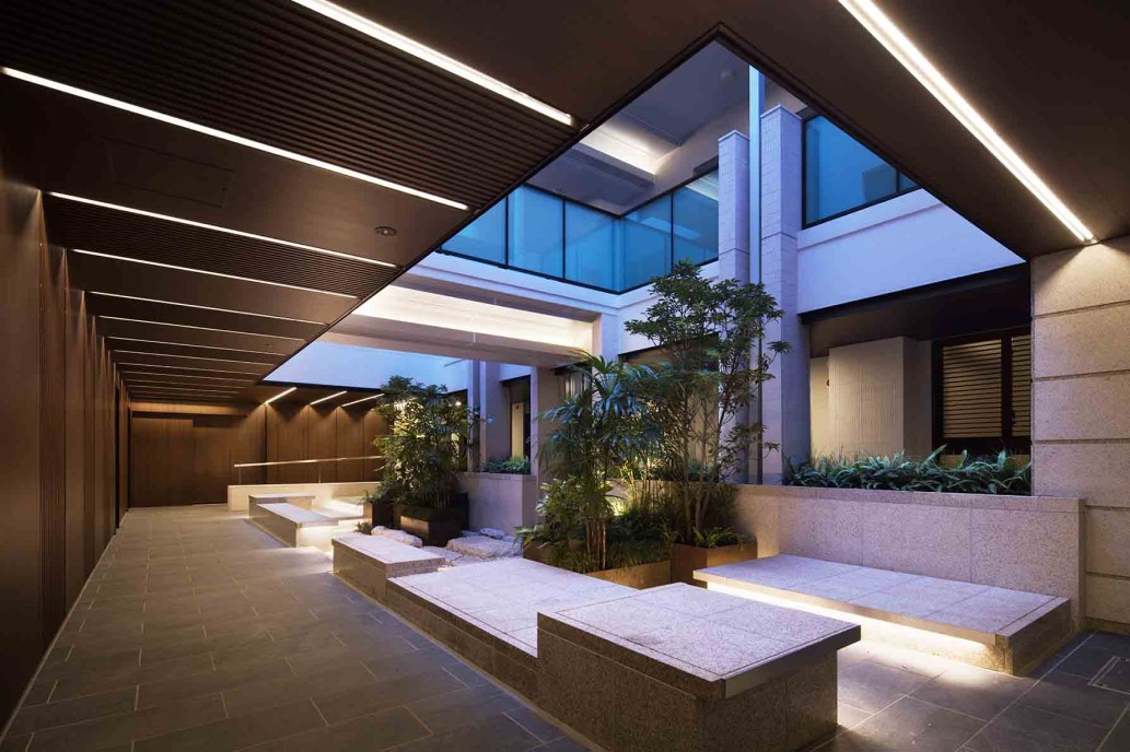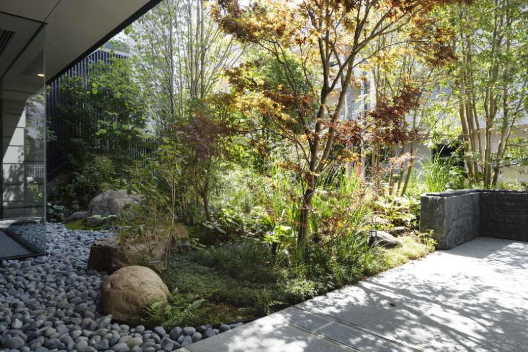 豊かな緑を眺め、その潤いに包まれることから始まるアプローチ空間。建物の内側には、両面ガラスを通して陽射しや植栽に包まれる「エントランスホール」、その先には「ライトコート」をレイアウト。5階まで続く伸びやかな吹き抜けの開放感を楽しみながらわが家へたどり着けます。