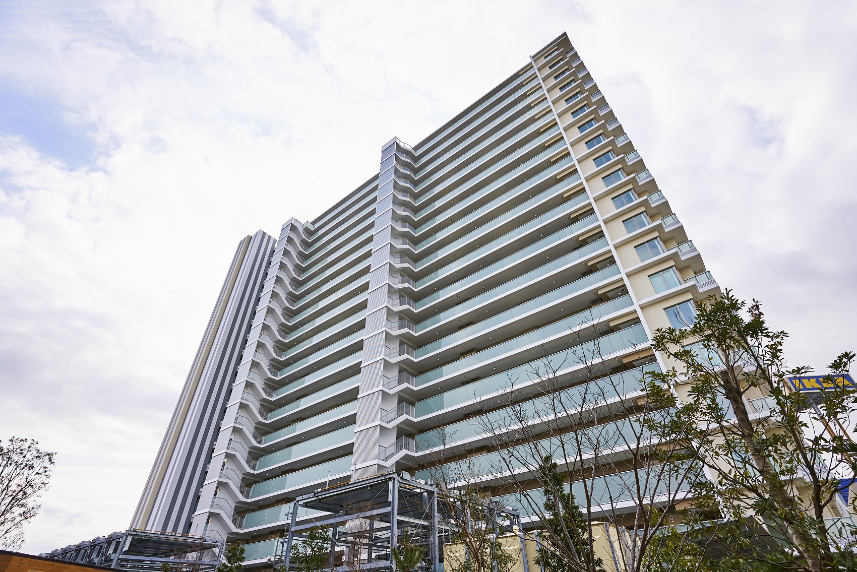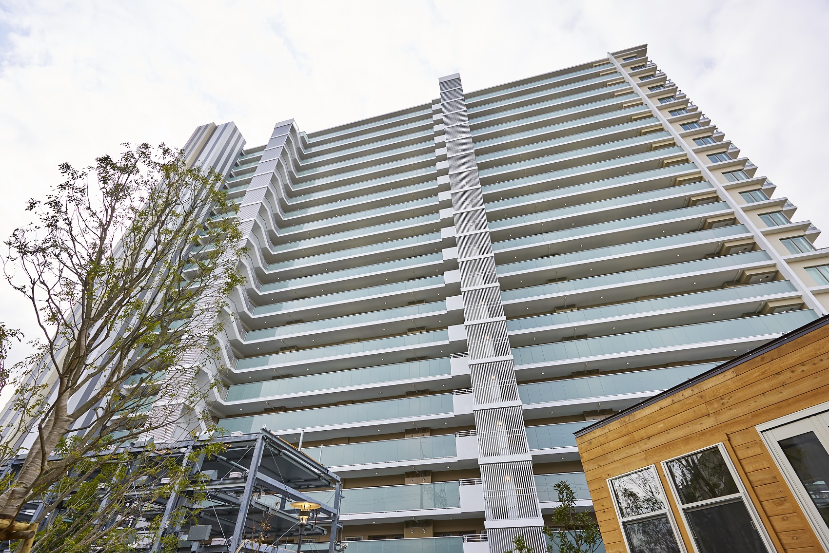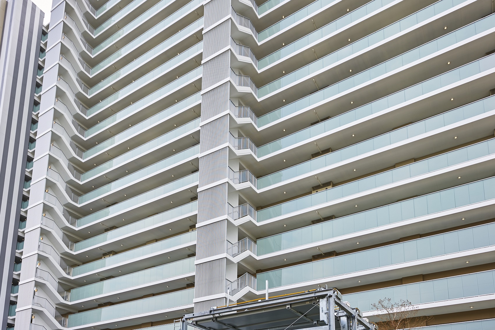 低層階は緑との調和を大切に、濃いベージュを基調としたタイルでデザイン。上層部へ向かうにつれて光と風を感じるように、ガラスの手摺と薄いベージュが採用されています。北西にはファサードデザインのアクセントとなるコーナーサッシを設計。西側はバルコニーを鋭角に突き出すことで、前に向かって進んでいくような帆船のマストが表現されています。