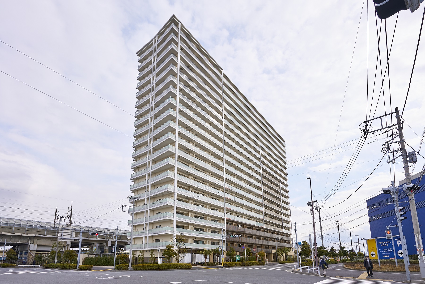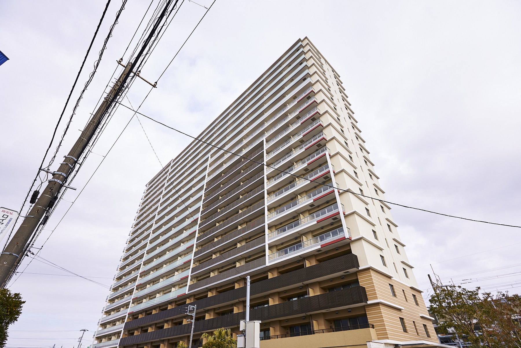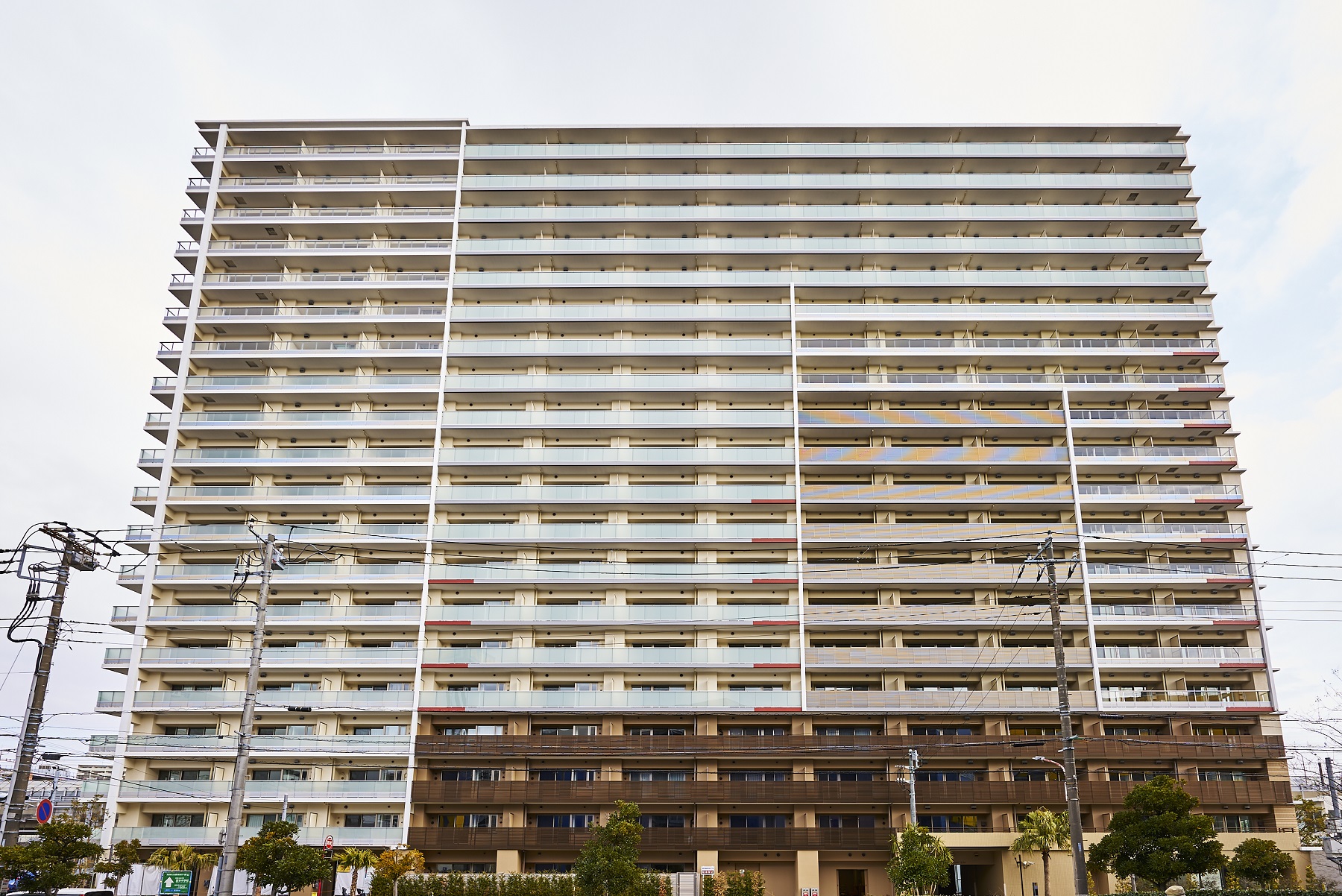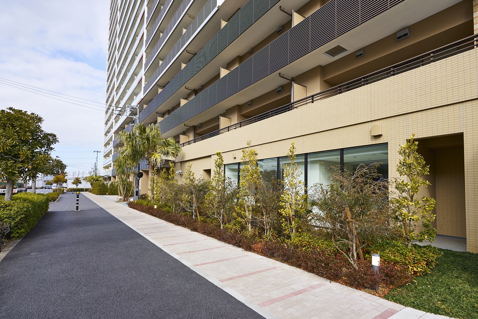 低層階は緑との調和を大切に、濃いベージュを基調としたタイルでデザイン。上層部へ向かうにつれて光と風を感じるように、ガラスの手摺と薄いベージュが採用されています。北西にはファサードデザインのアクセントとなるコーナーサッシを設計。西側はバルコニーを鋭角に突き出すことで、前に向かって進んでいくような帆船のマストが表現されています。