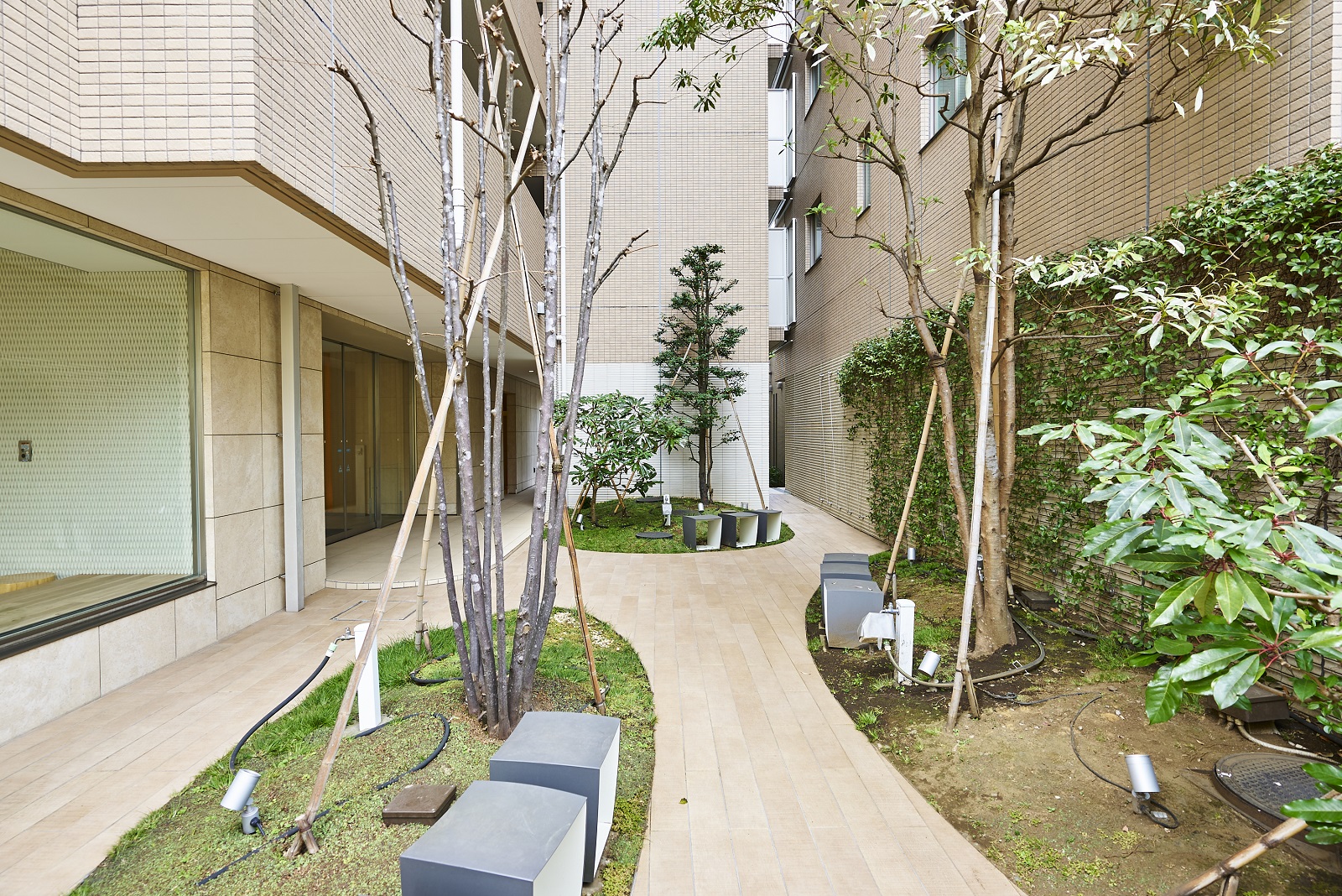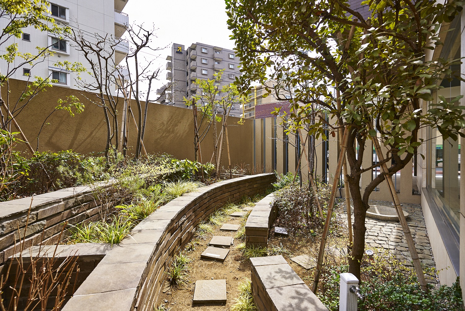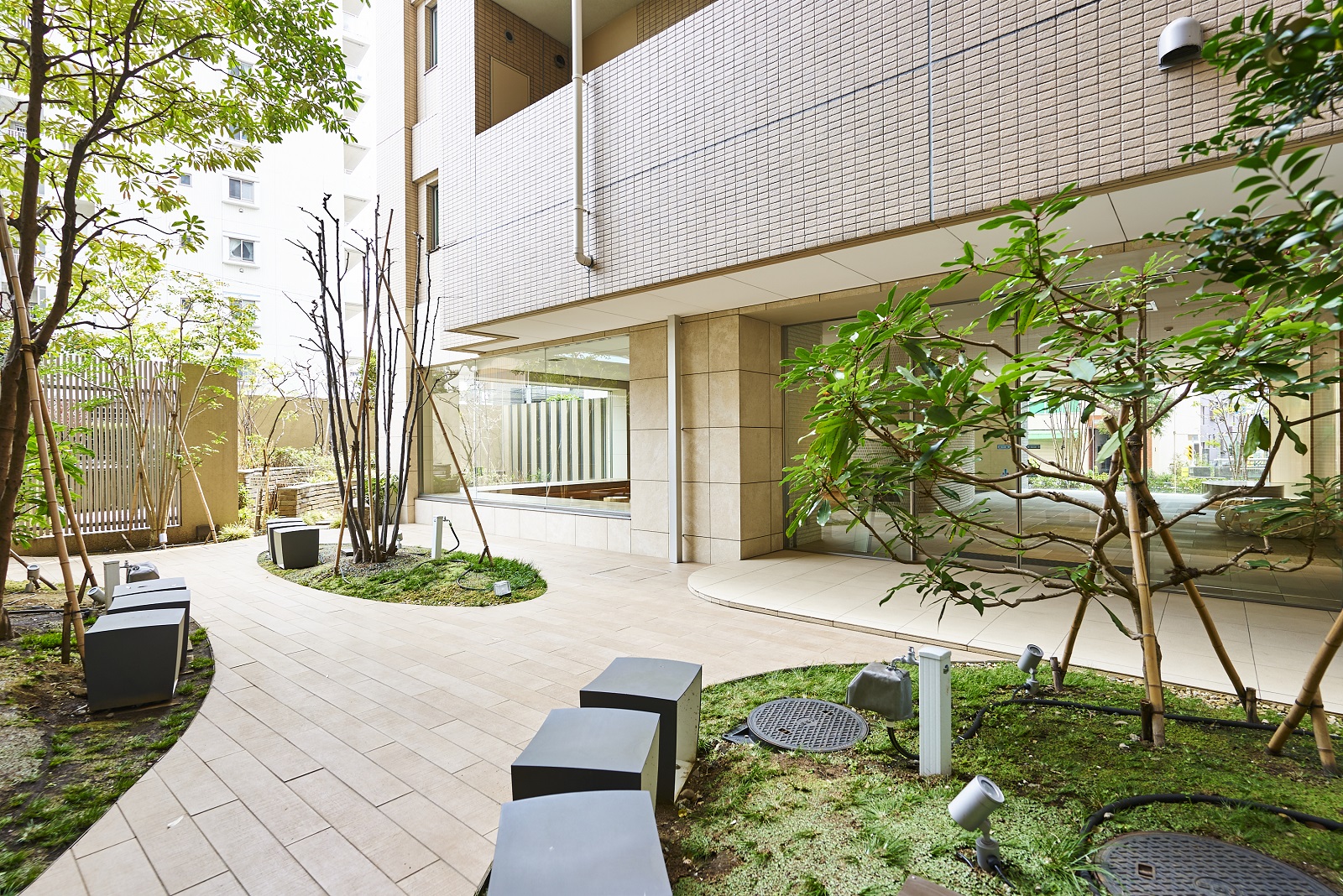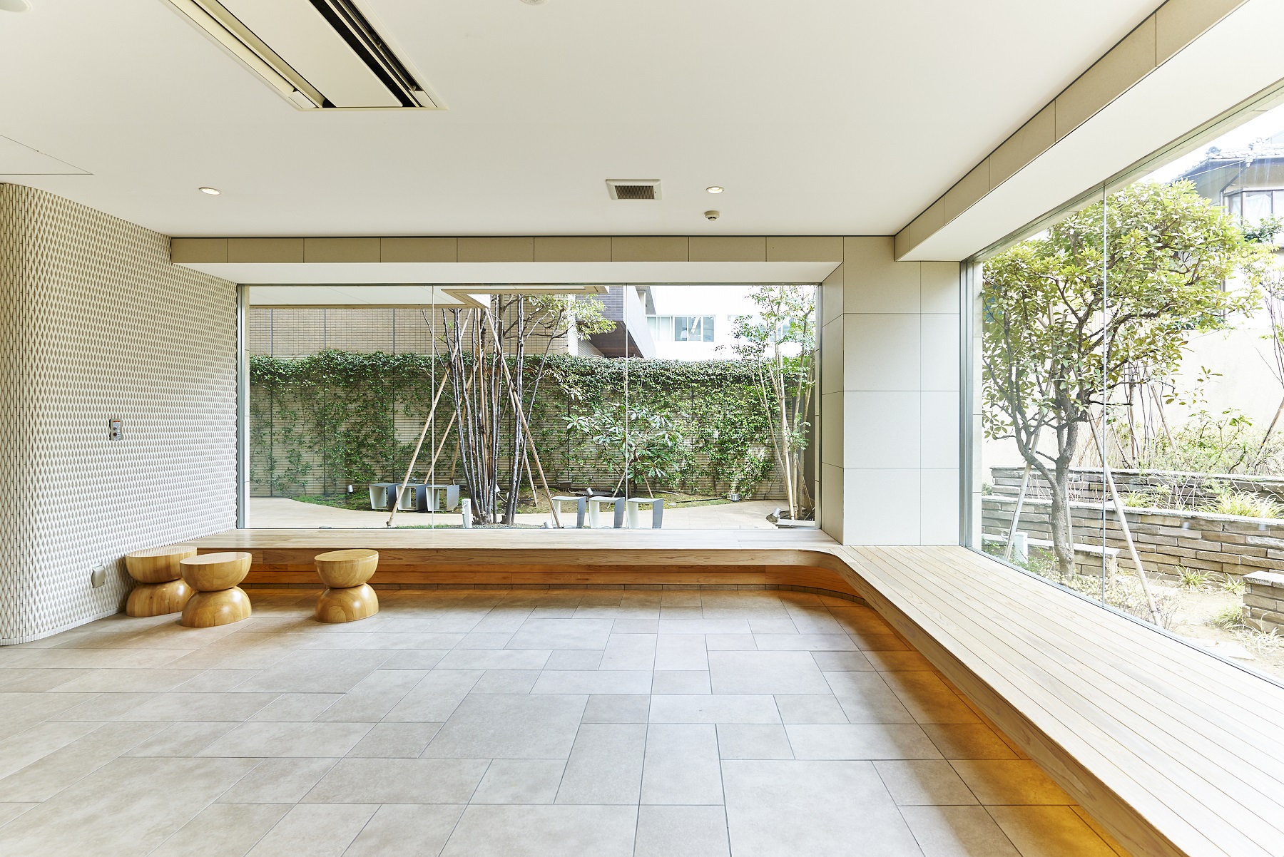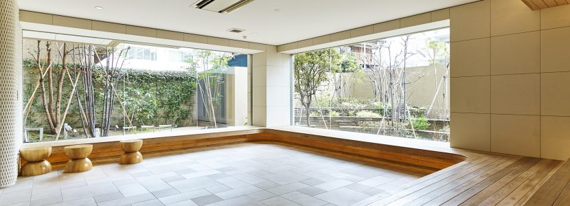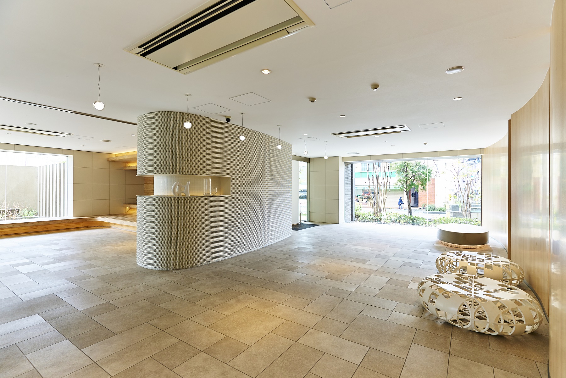 エントランスホールからラウンジには、壁面ギャラリースペースやアートスツールなどが設置されています。ゆとりを満喫しながら会話がはずみ、住まう人同士のコミュニティを育む空間です。ラウンジは、2面の開口部から中庭を望み、まわり込むようなコの字型のファニチャーが設えられ、自由にくつろげるスペースとなっています。