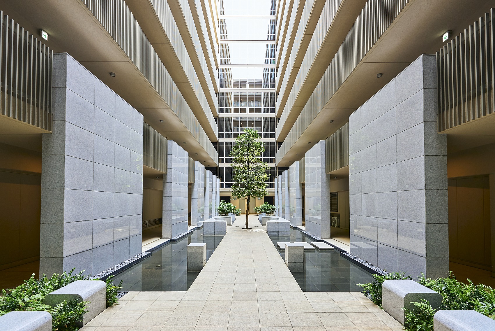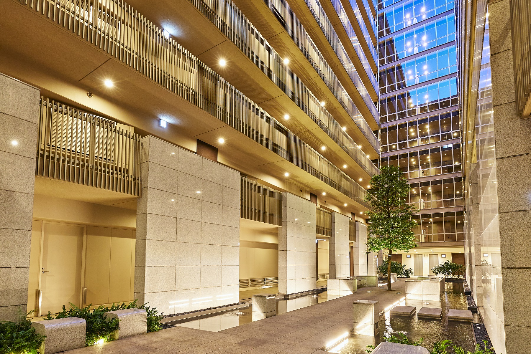 住棟に切り取られた空。水盤。シンボルツリー。ウォーターガーデンは、エレベーターホールへと続く石貼りの渡り廊下です。中心に佇むシンボルツリーには、太陽光採光システムによる光が降り注いでいます。