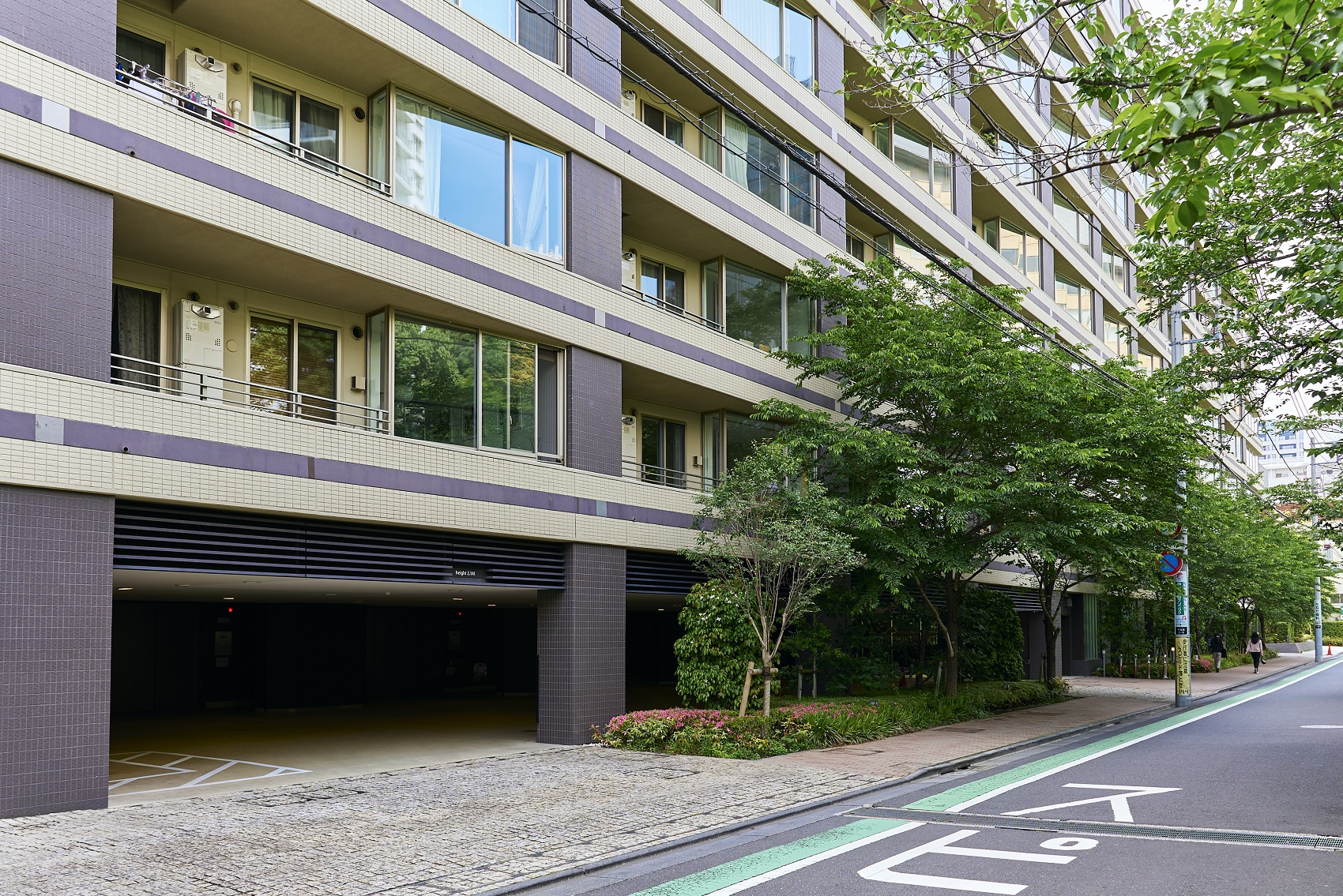 桜並木の合間に佇むコーチエントランスも、ダークブラウンの木目調仕上げとした壁面やインターロッキングの導線など、細部までこだわりの意匠が施されています。車寄せを設けており、雨の日も濡れずに乗降可能です。